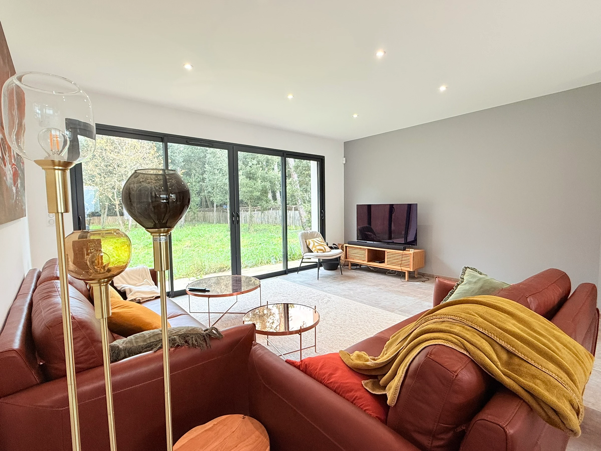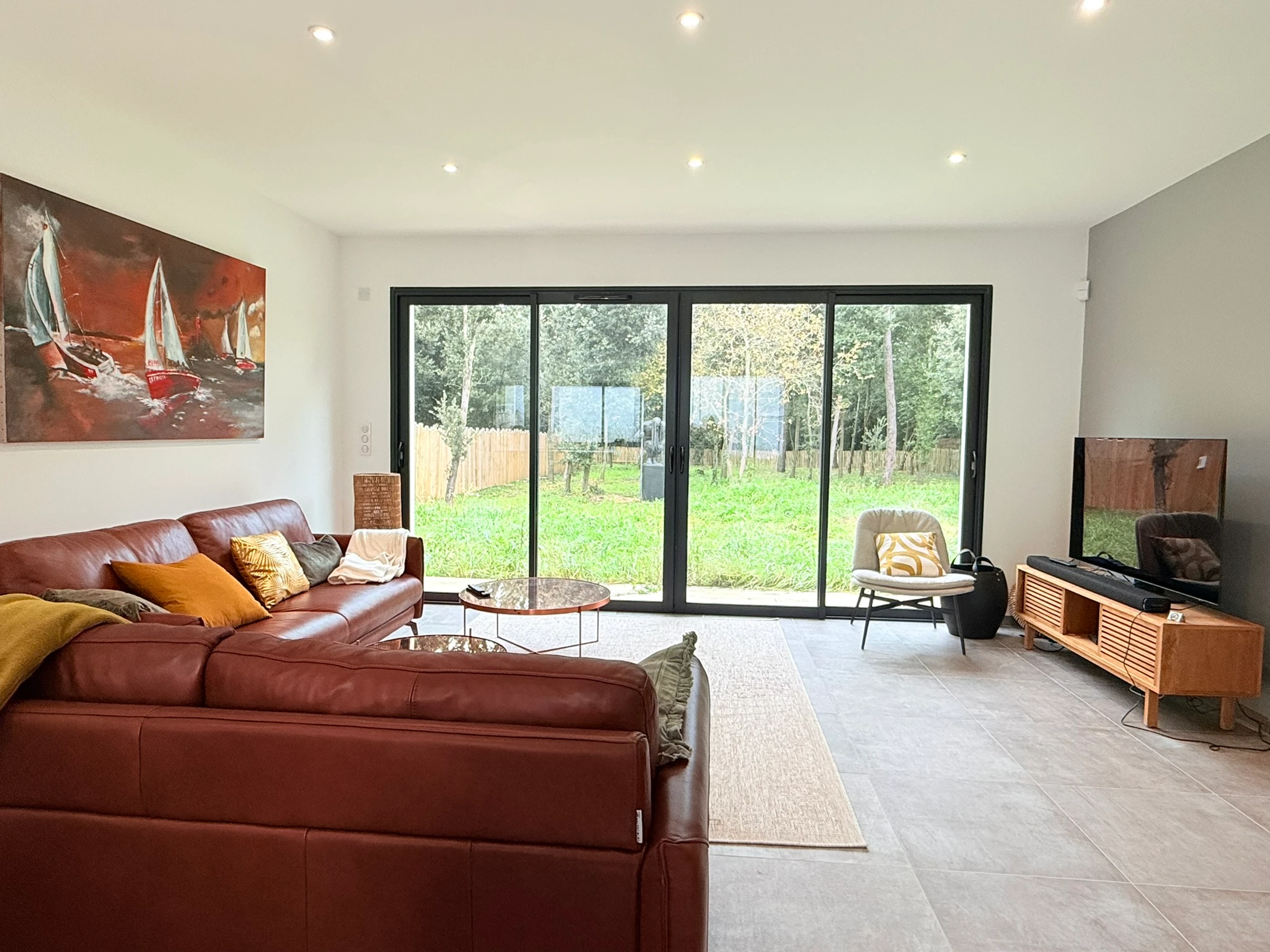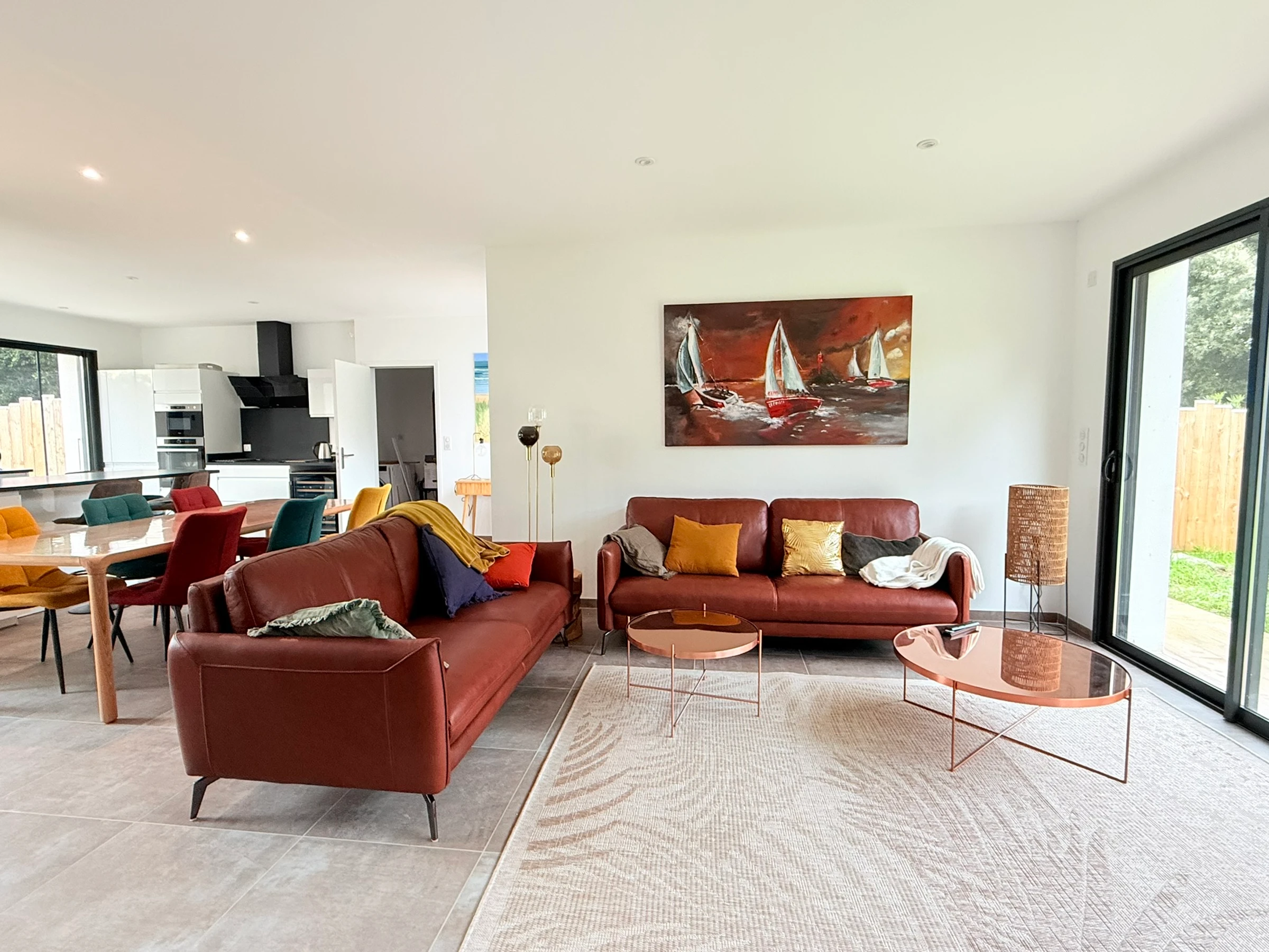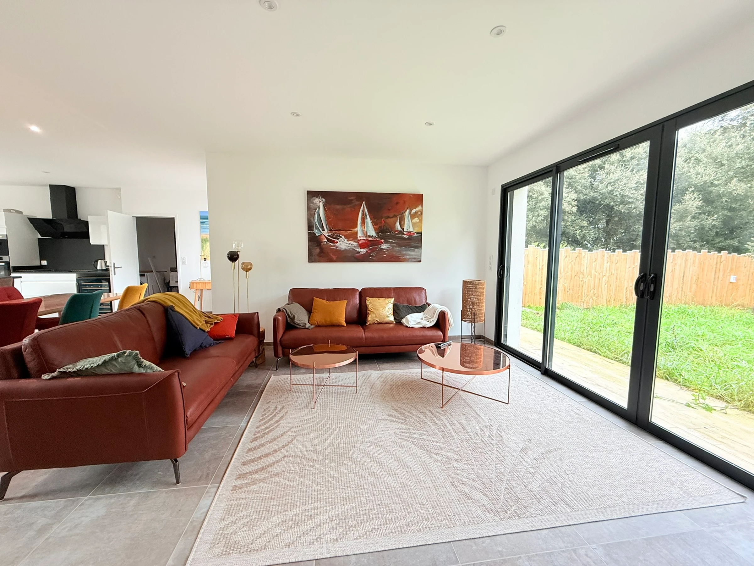 - Fully equipped kitchen opening onto a large living room with sofas and a TV.