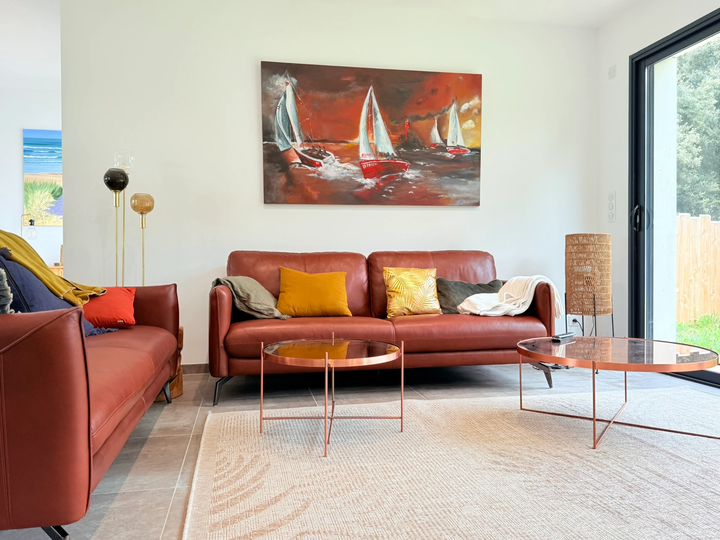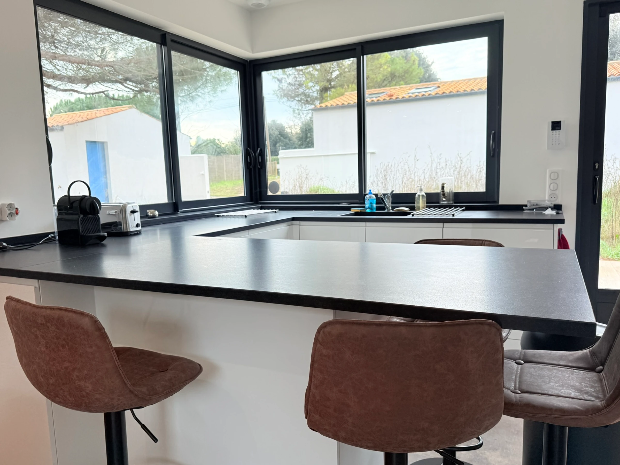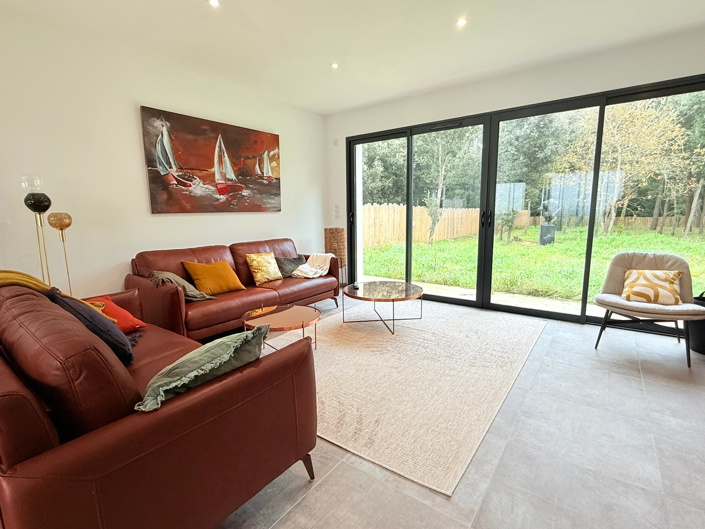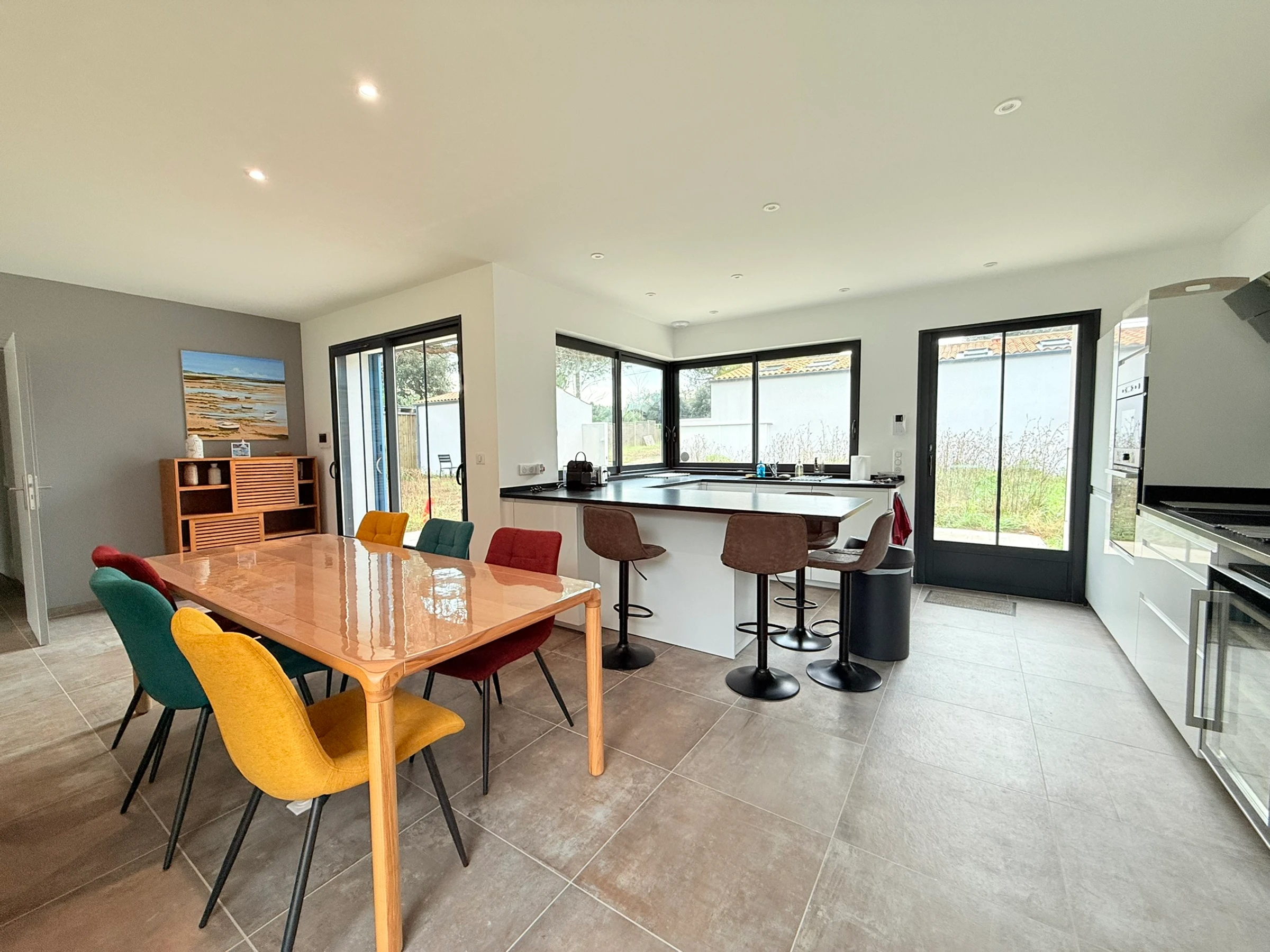 - Fully equipped kitchen opening onto a large living room with sofas and a TV.