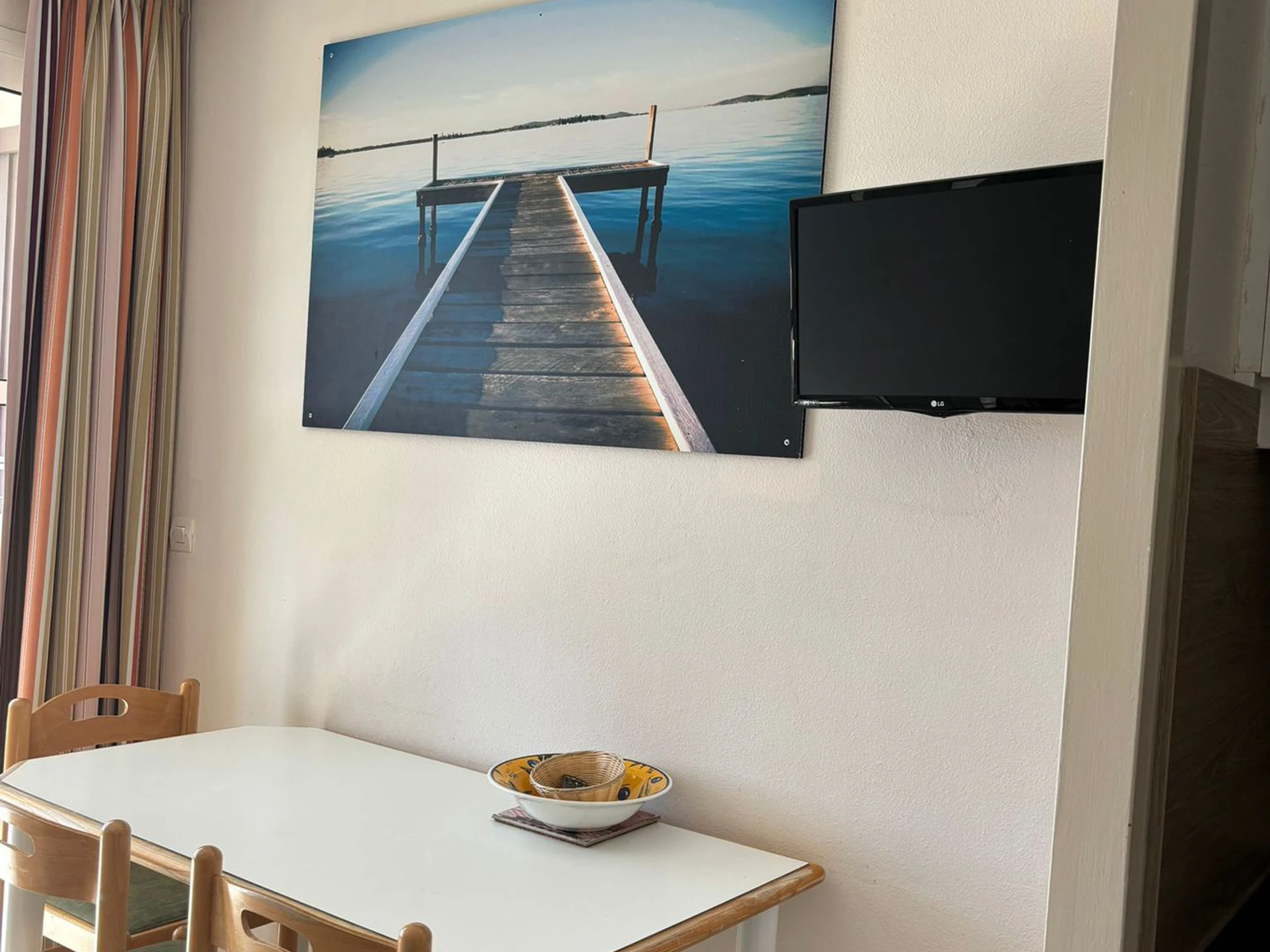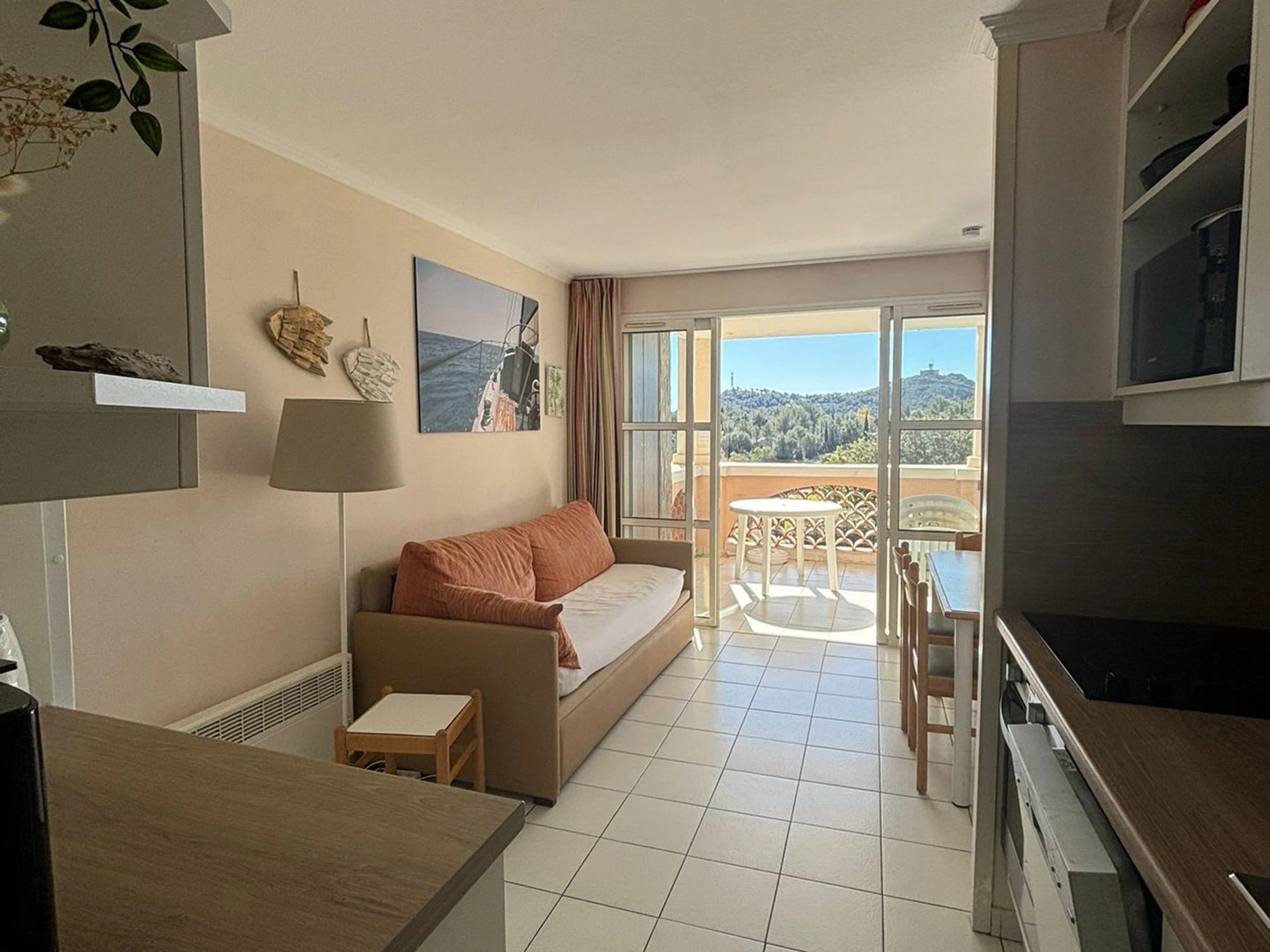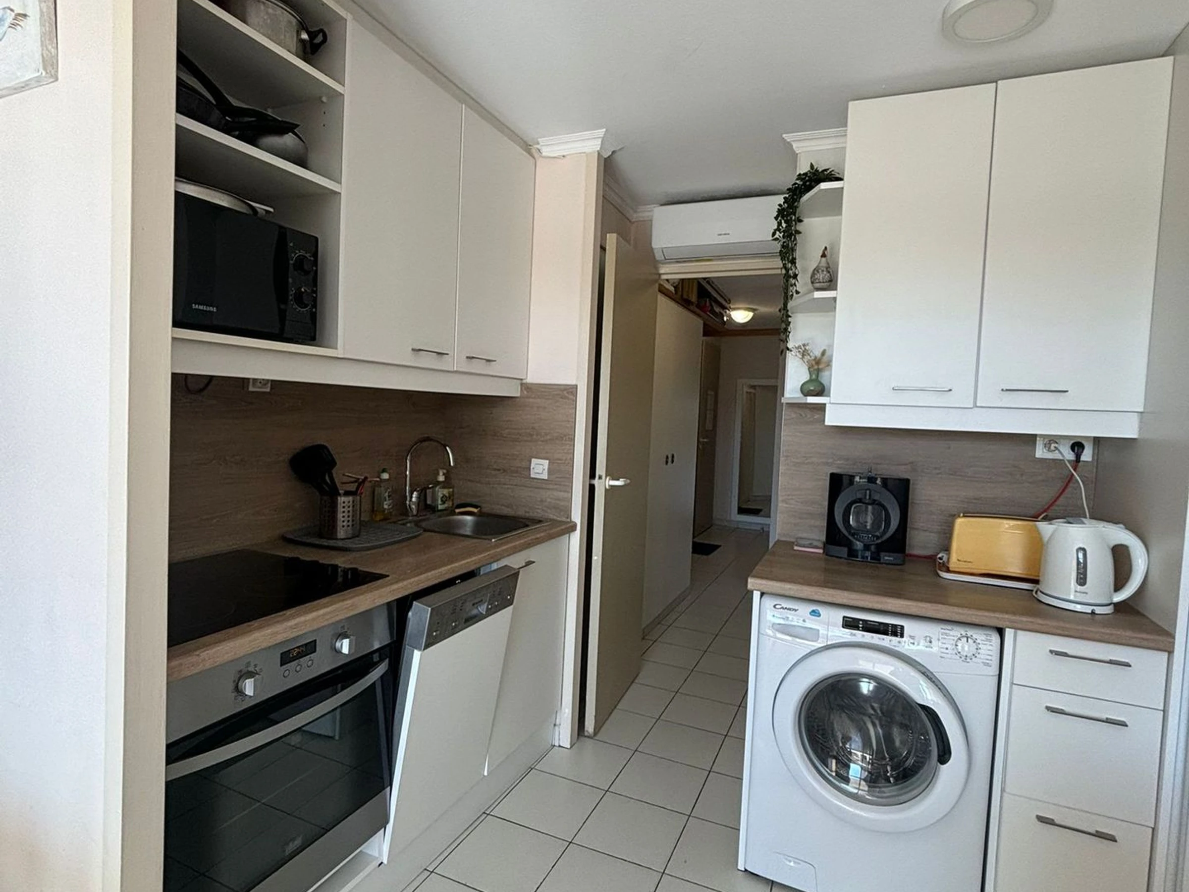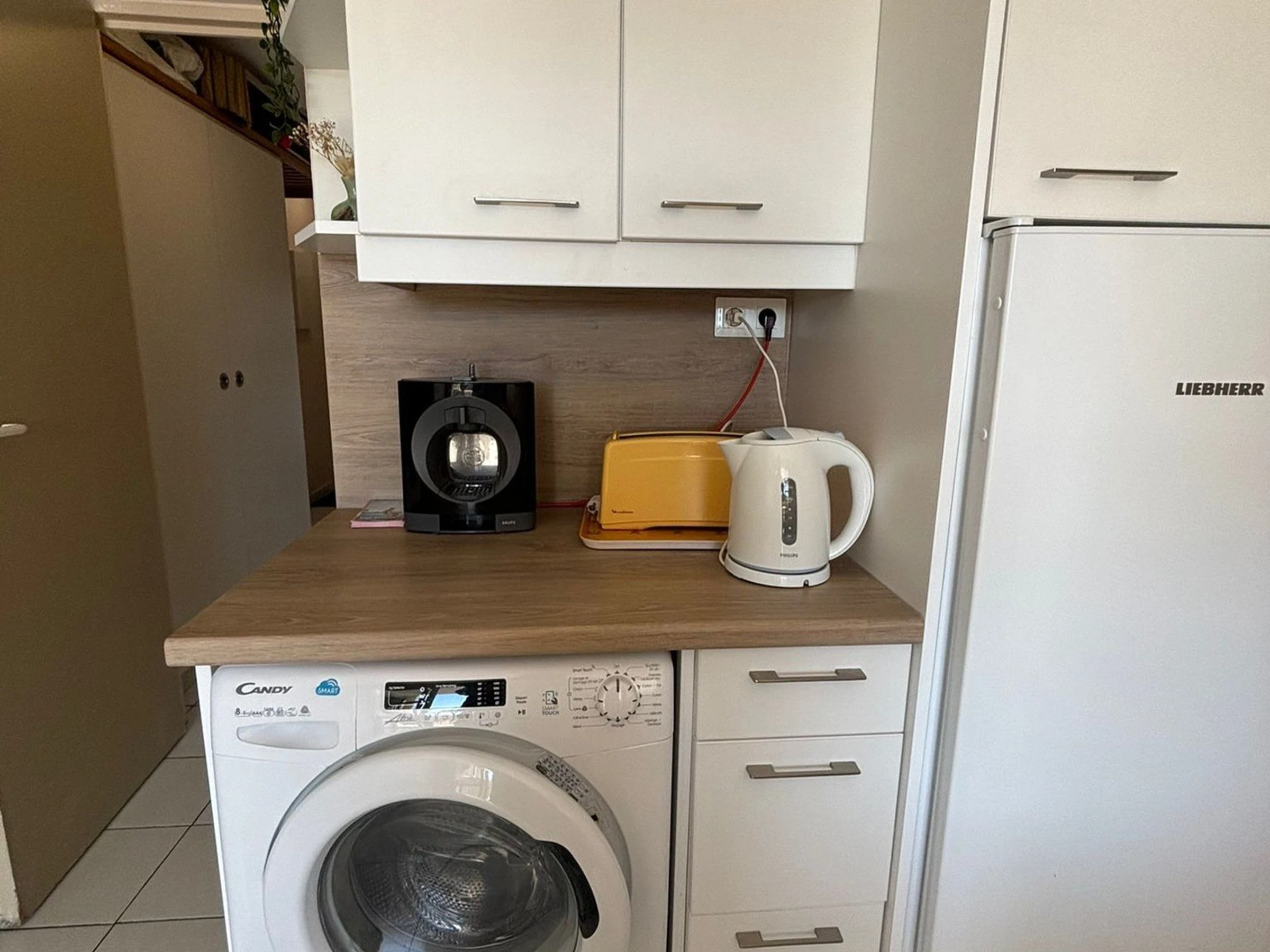 Living room with bay window opening onto a charming covered terrace with sea view. Equipped kitchen area: fridge, dishwasher, ceramic hob, microwave, coffee maker, toaster, kettle, crockery, washing machine.