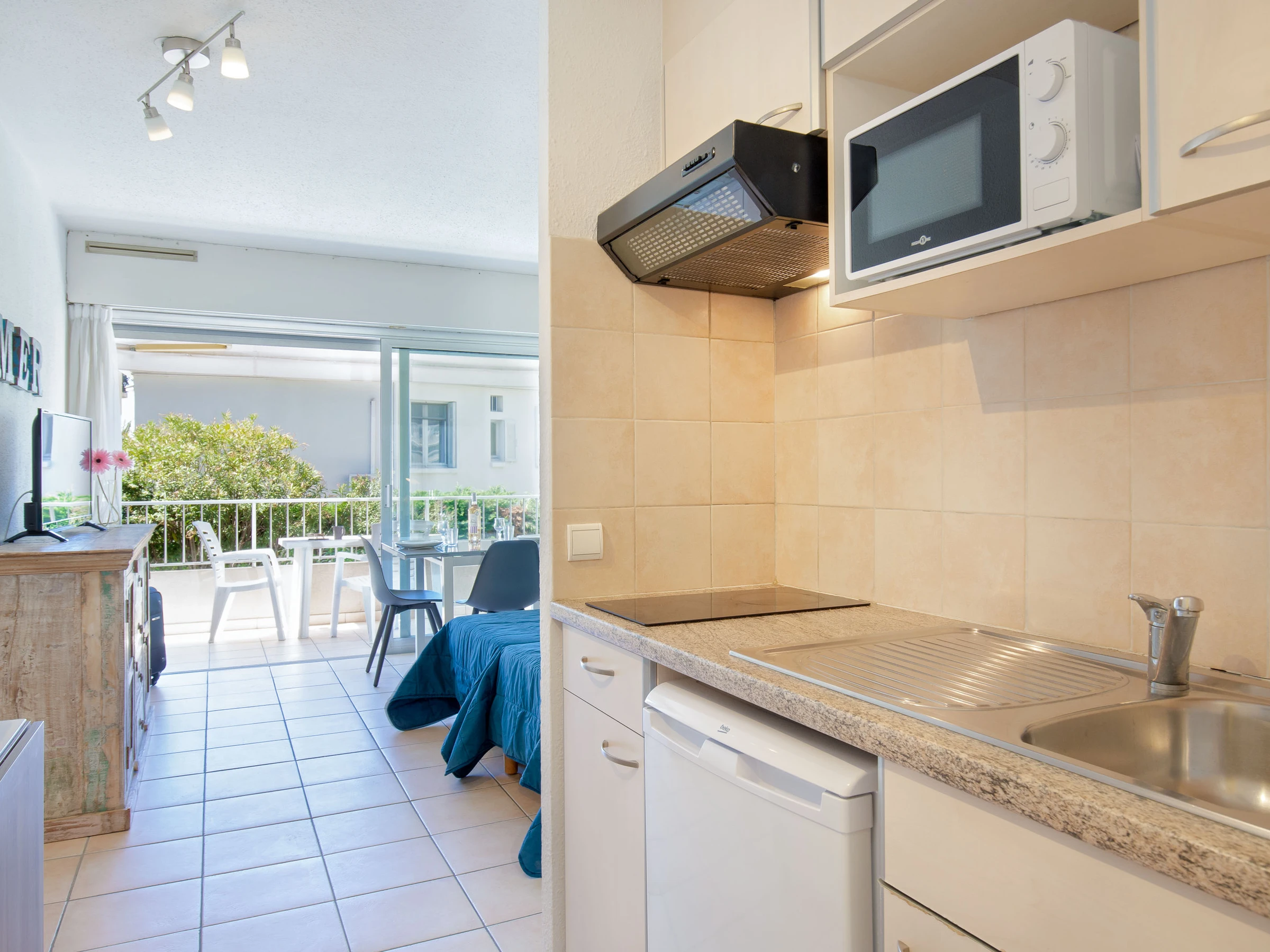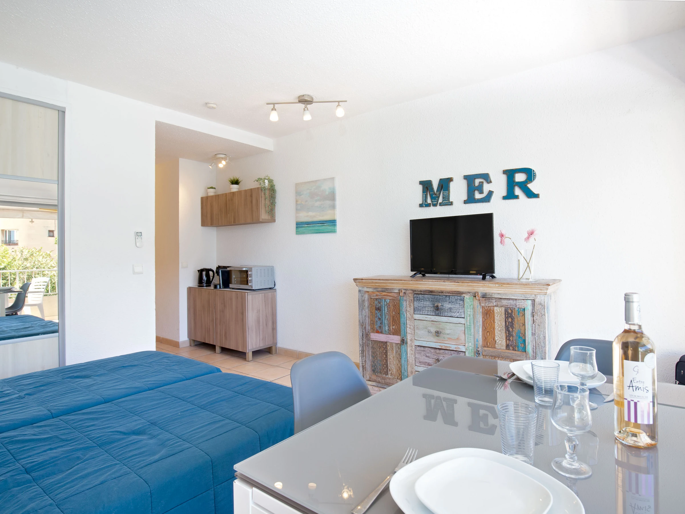 Air-conditioned studio with south-facing sea view, comprising an entrance hall with closet, a living room with two single beds, a fully equipped kitchenette, a bathroom with toilet, and a balcony with patio furniture.