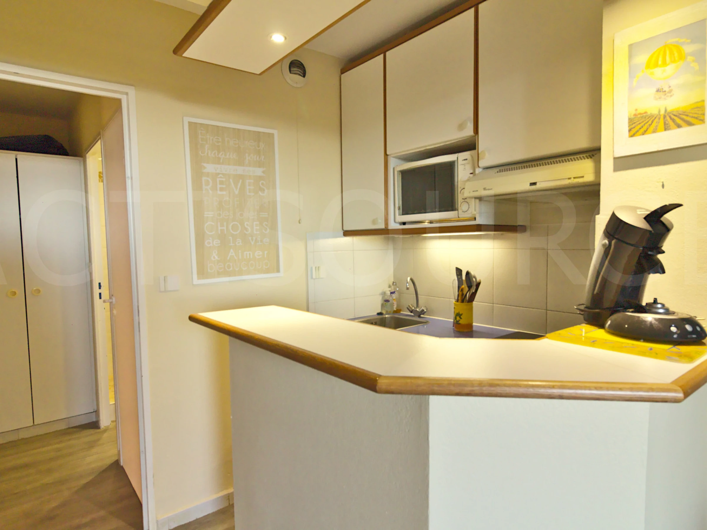 Kitchen area equipped with fridge, dishwasher, ceramic hob, microwave, coffee maker, crockery, washing machine.