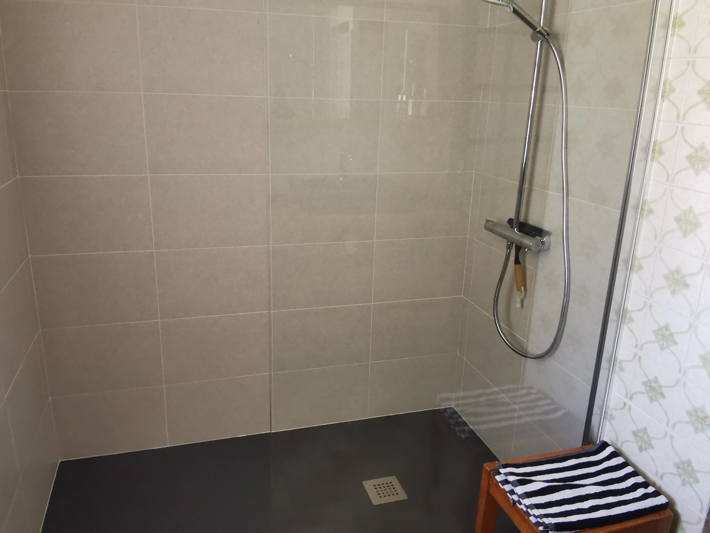 A bathroom with a walk-in shower, sink, and heated towel rail. Separate toilet.