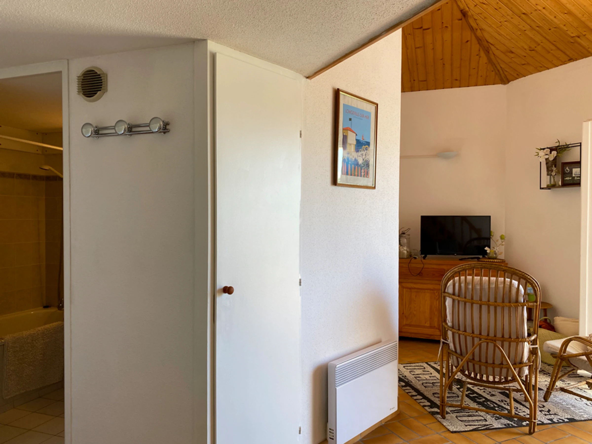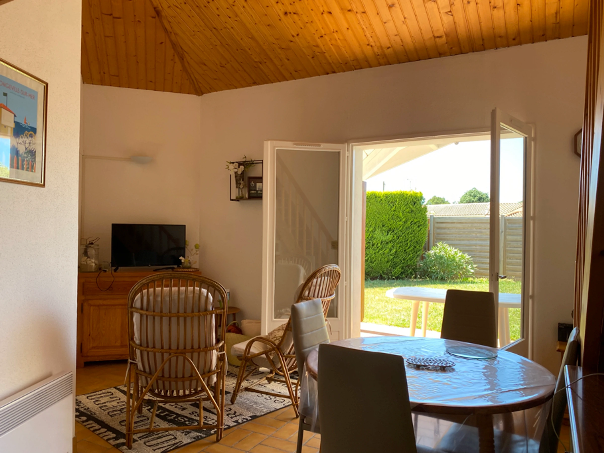 In a private residence, with an unheated communal swimming pool, about 800 m from the fine sand beach of LONGEVILLE-LE BOUIL, pavilion twinned with its private garden. This pavilion will welcome you with its entrance serving: a separate toilet, a bathroom bathroom, a living room with its kitchenette (hob, top fridge, microwave, storage, washing machine, etc.), its living room area with sofa and television opening onto the terrace on the equipped garden side with garden furniture and barbecue. On this level also a bedroom with 1 bed 160 x 200. From this room access by stairs to the floor where you will have the enjoyment of a bedroom with 1 bed 140 x 190. Pool access by Code -private parking.Possibility to modulate the bedding- information from the agency.