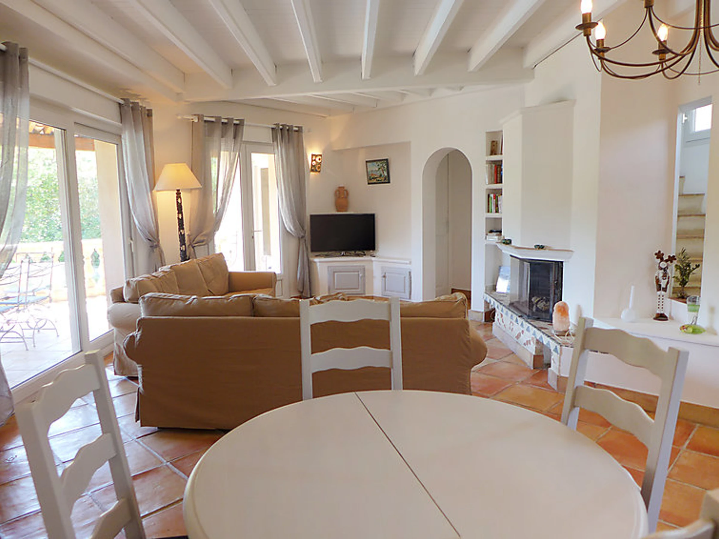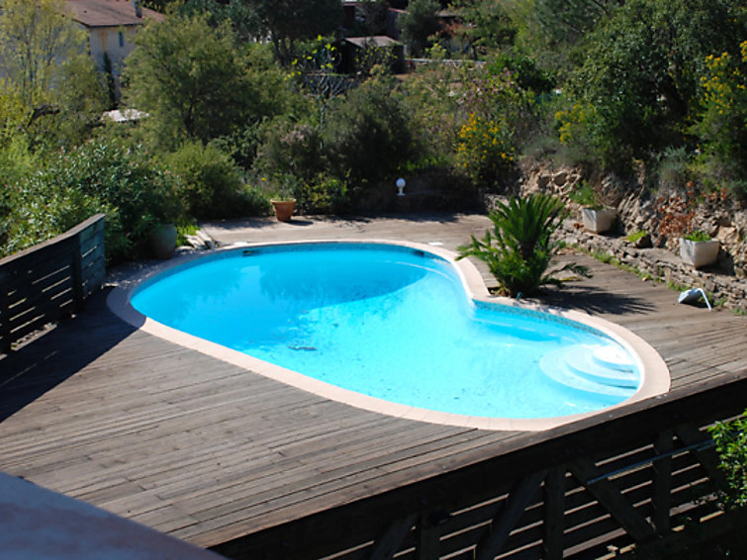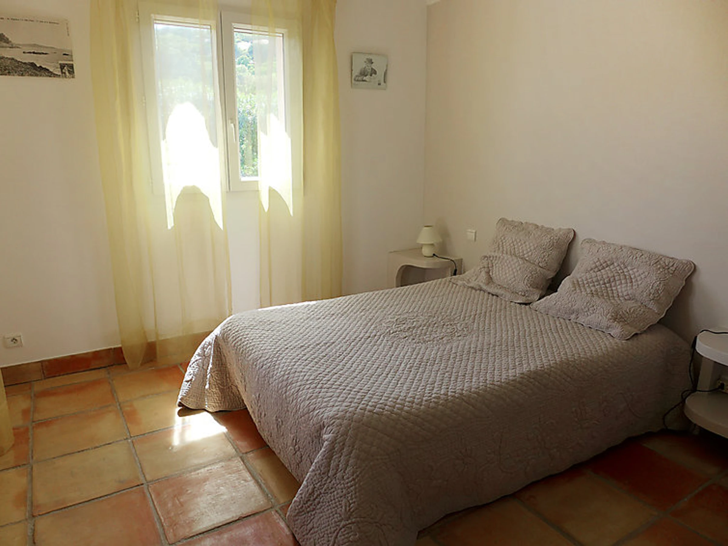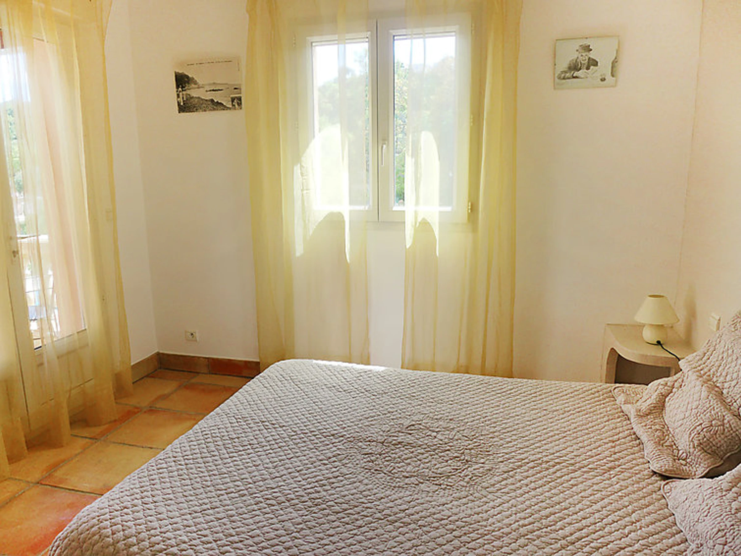 6-room terraced house 180 m2 on 3 levels. Comfortable and beautiful furnishings: living/dining room with TV. Exit to the terrace. 1 room with 1 french bed (140 cm). Exit to the terrace. Kitchen (dishwasher, 4 ceramic glass hob hotplates, microwave, freezer). Exit to the terrace. Bath/shower/WC, whirlpool. On the lower ground floor: playroom with open-hearth fireplace. Exit to the garden, to the swimming pool. 1 room with 1 french bed and air conditioning. Kitchenette (2 hot plates). Exit to the terrace. Shower/WC. Upper floor: 1 room with 1 french bed (180 cm), air conditioning. Exit to the terrace. 1 room with 2 beds (90 cm), shower and air conditioning. Large terrace roofed, south facing position. Terrace furniture. Beautiful distant view of the sea. Facilities: washing machine, mosquito net. Internet (WiFi, free). Reserved parking (fenced).