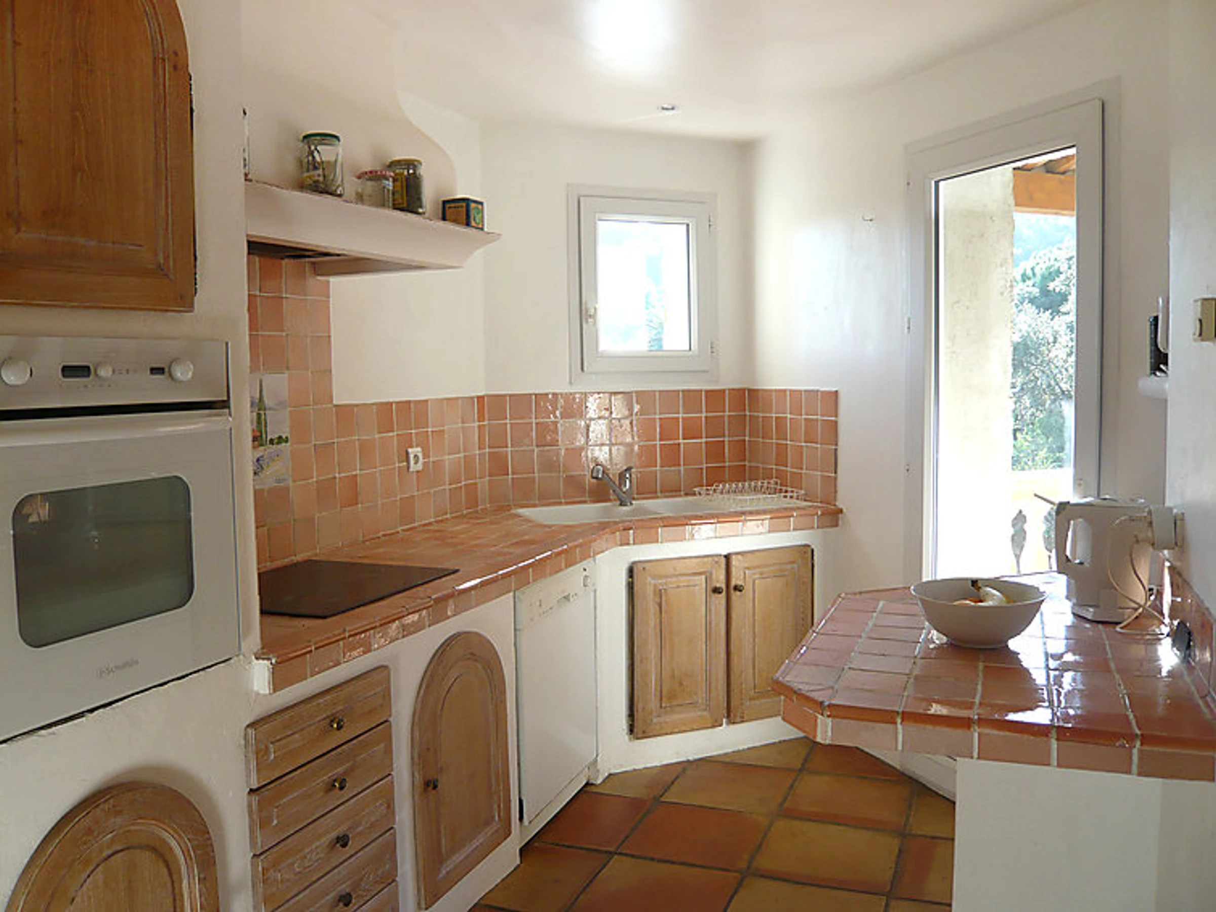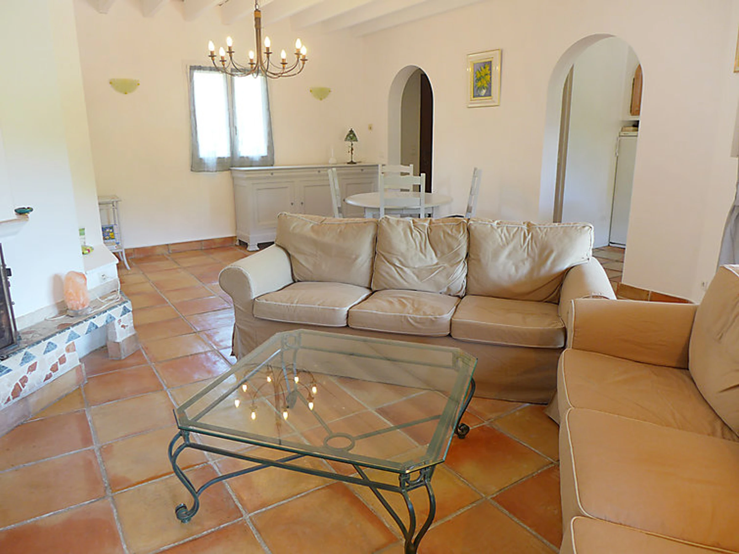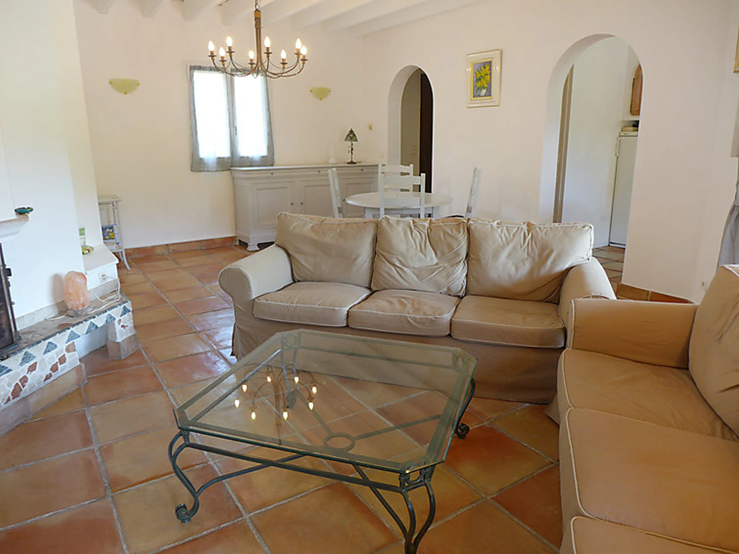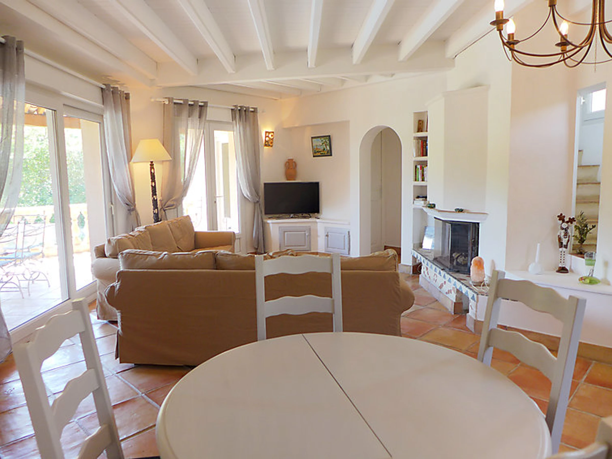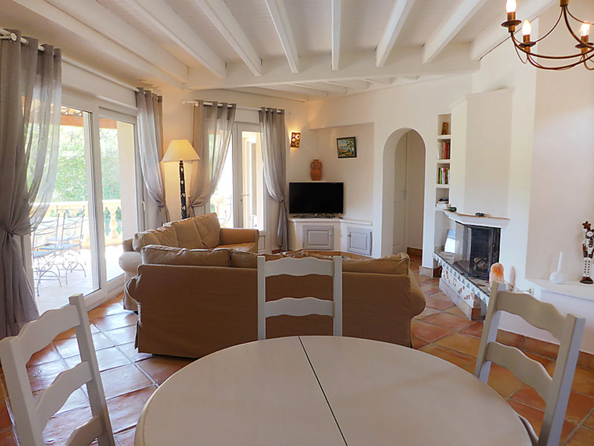 6-room terraced house 180 m2 on 3 levels. Comfortable and beautiful furnishings: living/dining room with TV. Exit to the terrace. 1 room with 1 french bed (140 cm). Exit to the terrace. Kitchen (dishwasher, 4 ceramic glass hob hotplates, microwave, freezer). Exit to the terrace. Bath/shower/WC, whirlpool. On the lower ground floor: playroom with open-hearth fireplace. Exit to the garden, to the swimming pool. 1 room with 1 french bed and air conditioning. Kitchenette (2 hot plates). Exit to the terrace. Shower/WC. Upper floor: 1 room with 1 french bed (180 cm), air conditioning. Exit to the terrace. 1 room with 2 beds (90 cm), shower and air conditioning. Large terrace roofed, south facing position. Terrace furniture. Beautiful distant view of the sea. Facilities: washing machine, mosquito net. Internet (WiFi, free). Reserved parking (fenced).