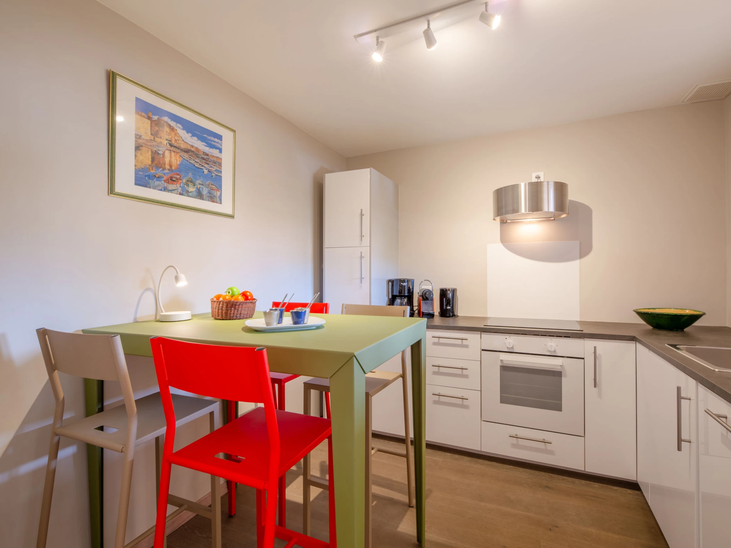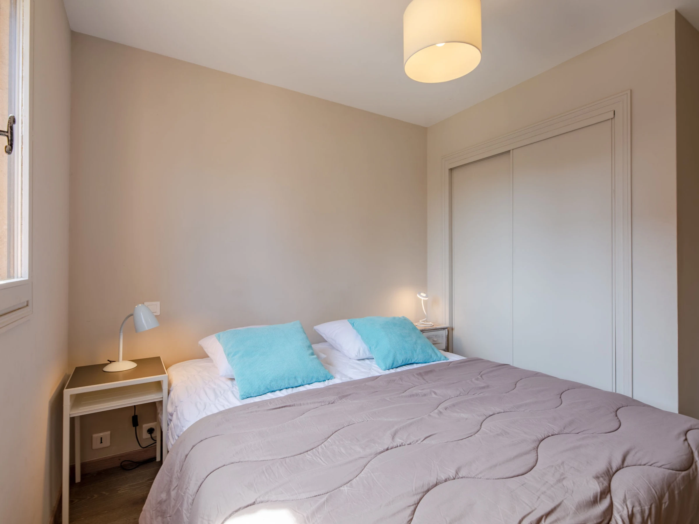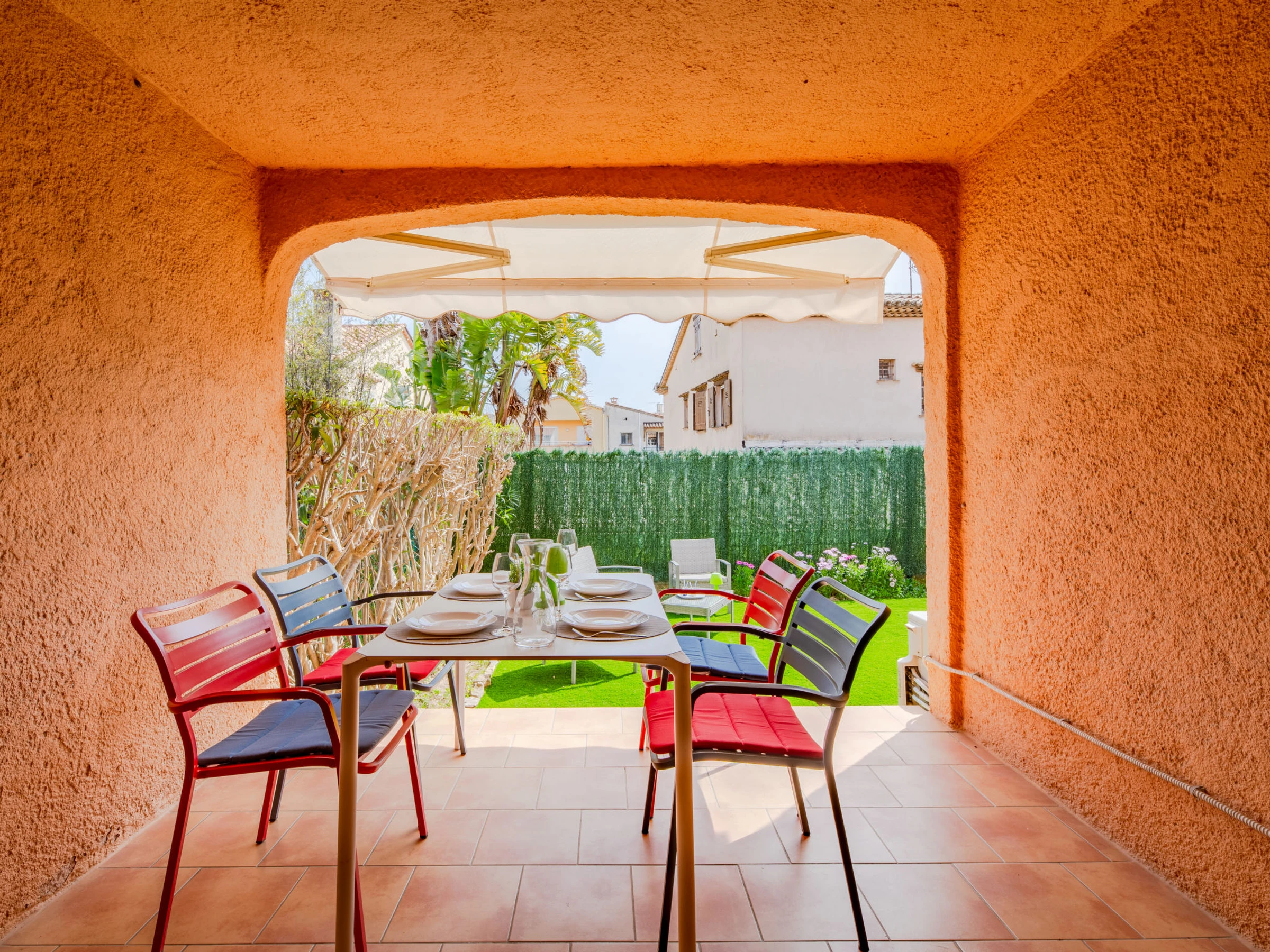 2-room apartment 50 m2 on 1st floor. Spacious, comfortable and modern furnishings: dining room with 1 double sofabed (140 cm, length 190 cm), TV. Exit to the terrace, to the patio. 1 room with 2 beds (80 cm, length 200 cm). Open kitchen (oven, dishwasher, 4 ceramic glass hob hotplates, toaster, kettle, freezer, electric coffee machine) with dining table. Shower/WC. Electric heating, air-conditioning. Terrace 7 m2, roofed, south facing position, patio 45 m2, south facing position. Terrace furniture. Facilities: iron, hair dryer. Internet (WiFi, extra). Parking space n 12. Please note: non-smokers only. Maximum 1 pet/ dog allowed. TV only FR. Smoke alarm, no lift. [hidden]