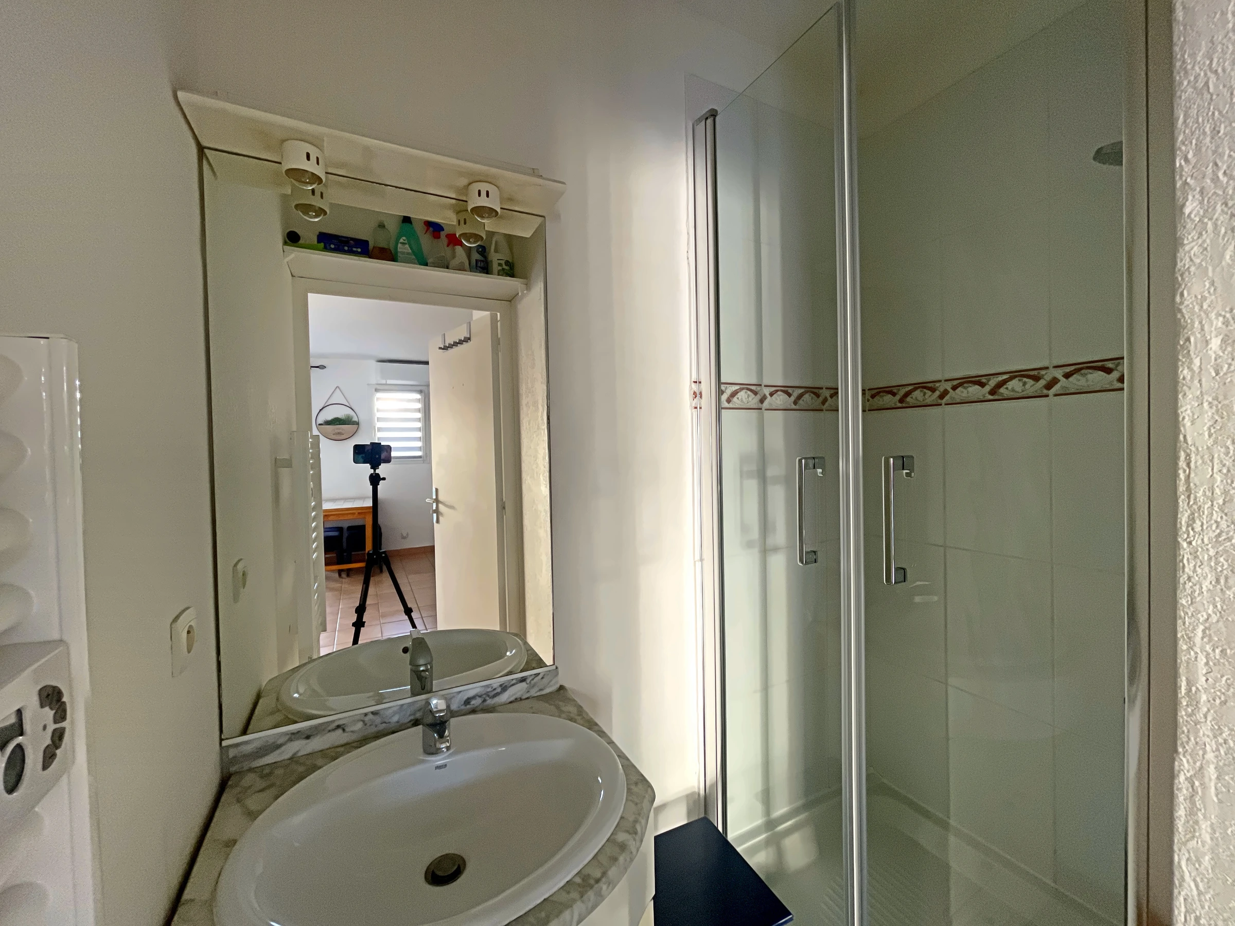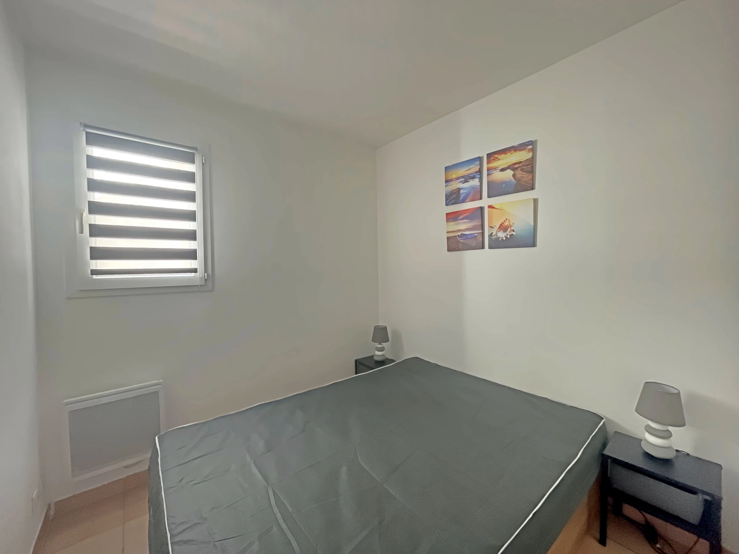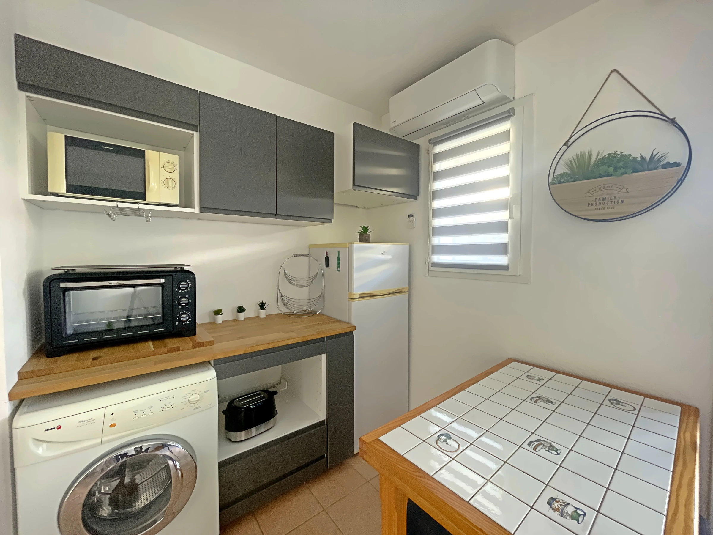 In Residence with collective swimming pool (open from June 1 to September 30), Apartment for 4 people on the ground floor with courtyard and private parking, including a living-dining room with pull-out sofa (2 90x200 beds), equipped kitchen area with vitro hob , dishwasher, washing machine, oven, microwave, Tassimo coffee maker, toaster, kettle, fridge with freezer compartment, reversible air conditioning in the living room, one bedroom with 140 cm bed, bathroom, toilet.