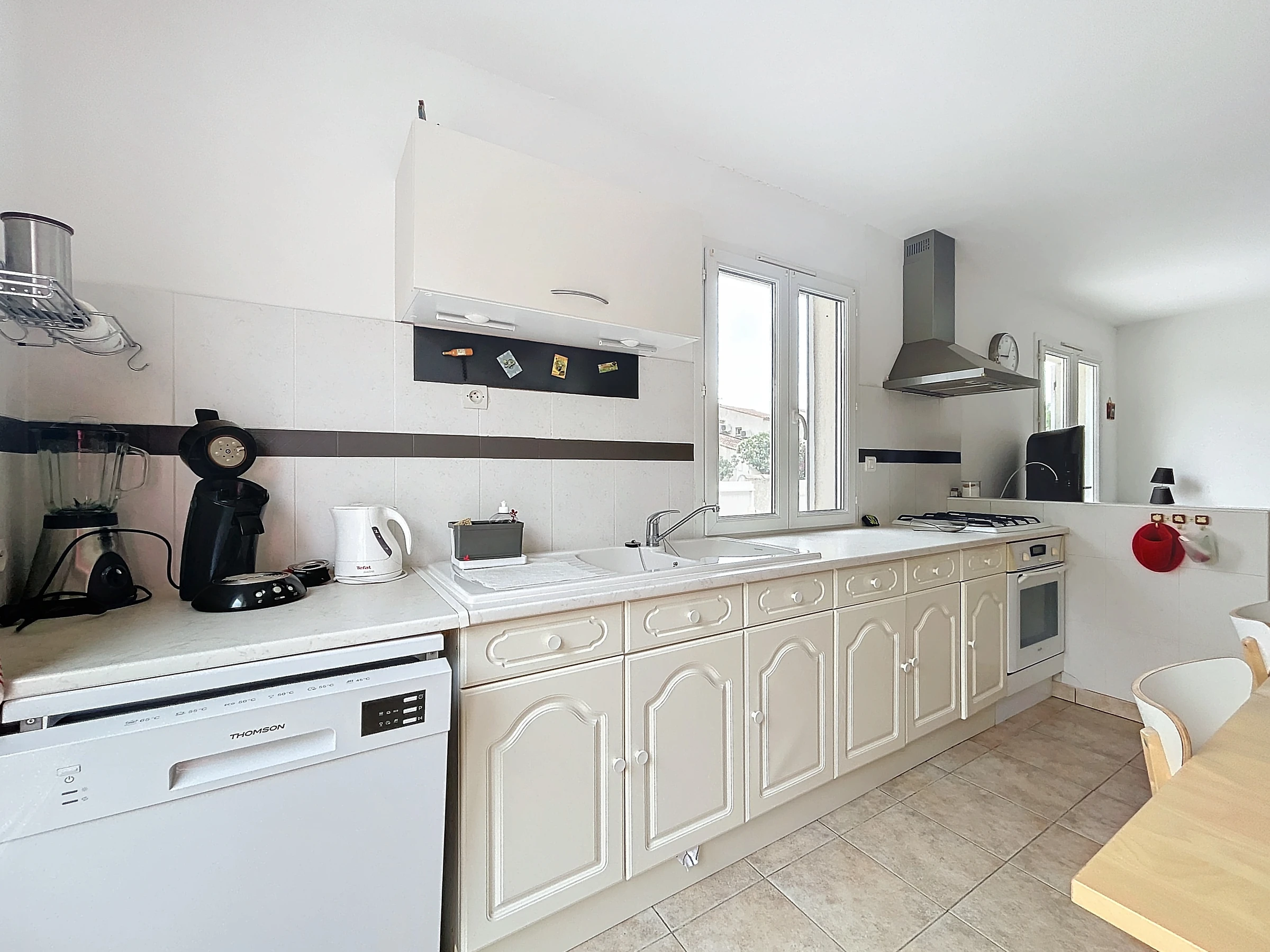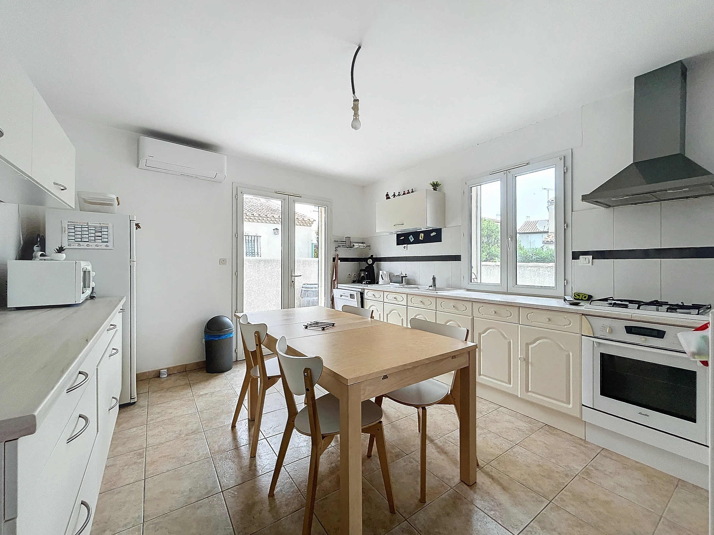 Close to the Village center in a quiet residential area, you can stay in this 110 m² apartment on one level including a large courtyard with garden furniture, deckchair, an entrance hall which serves 2 bedrooms with 140 cm bed, toilet, bathroom with washing machine, a large living-dining room with open fitted kitchen, a bedroom with 140 cm bed, a bathroom with toilet.