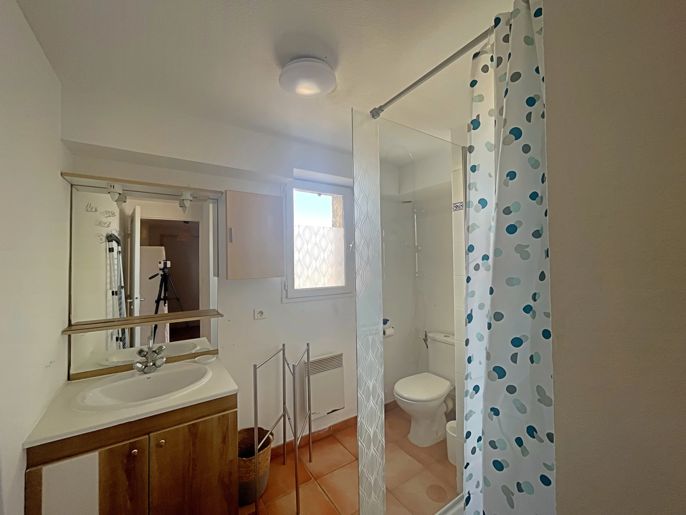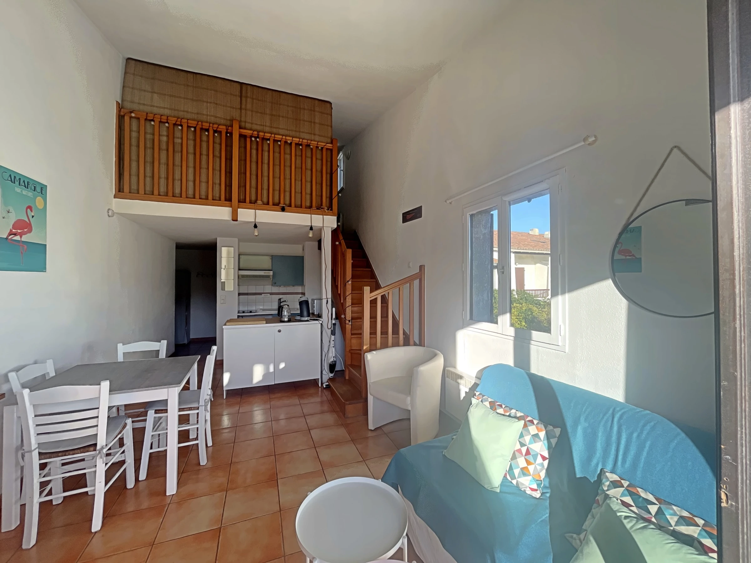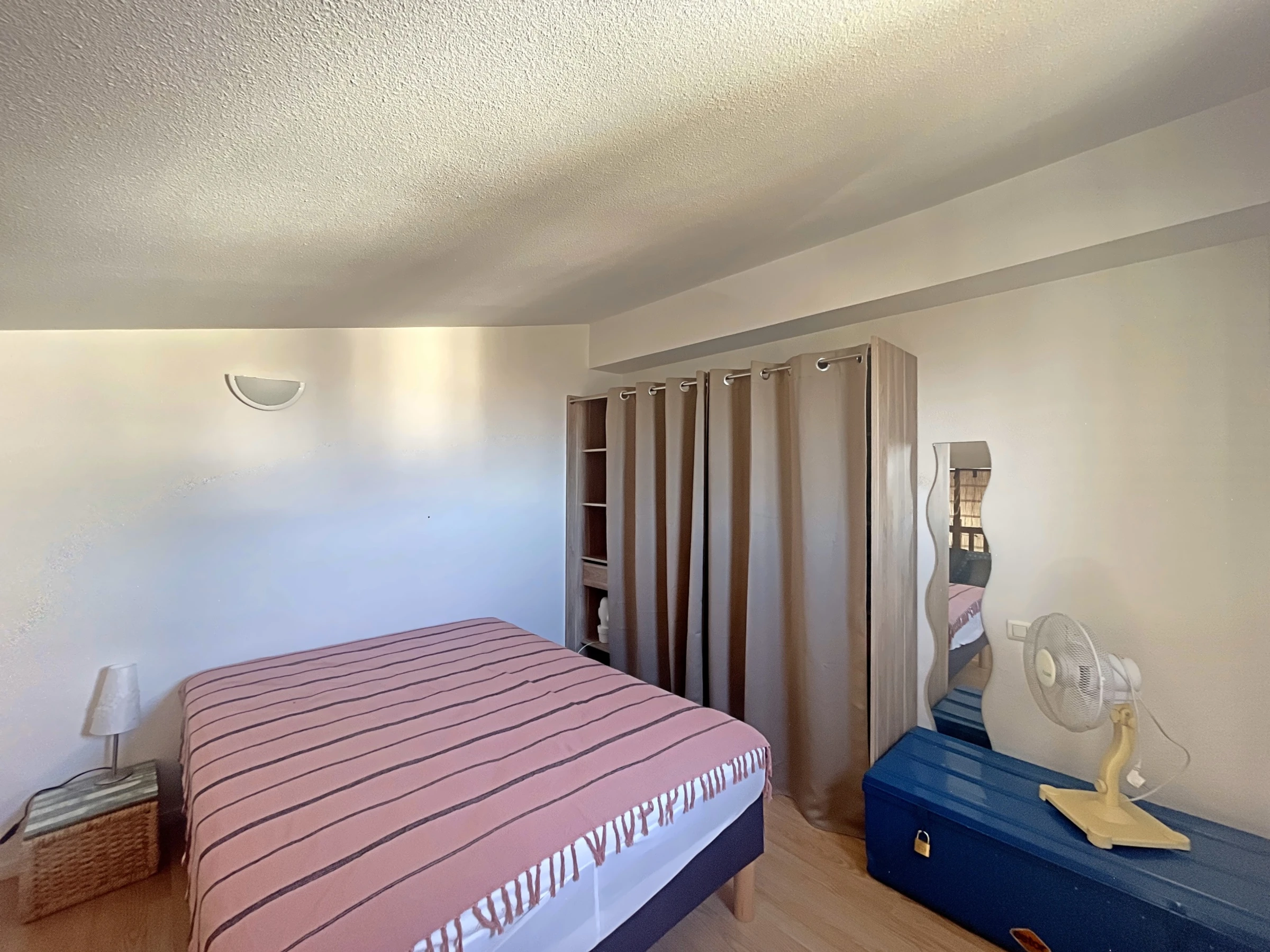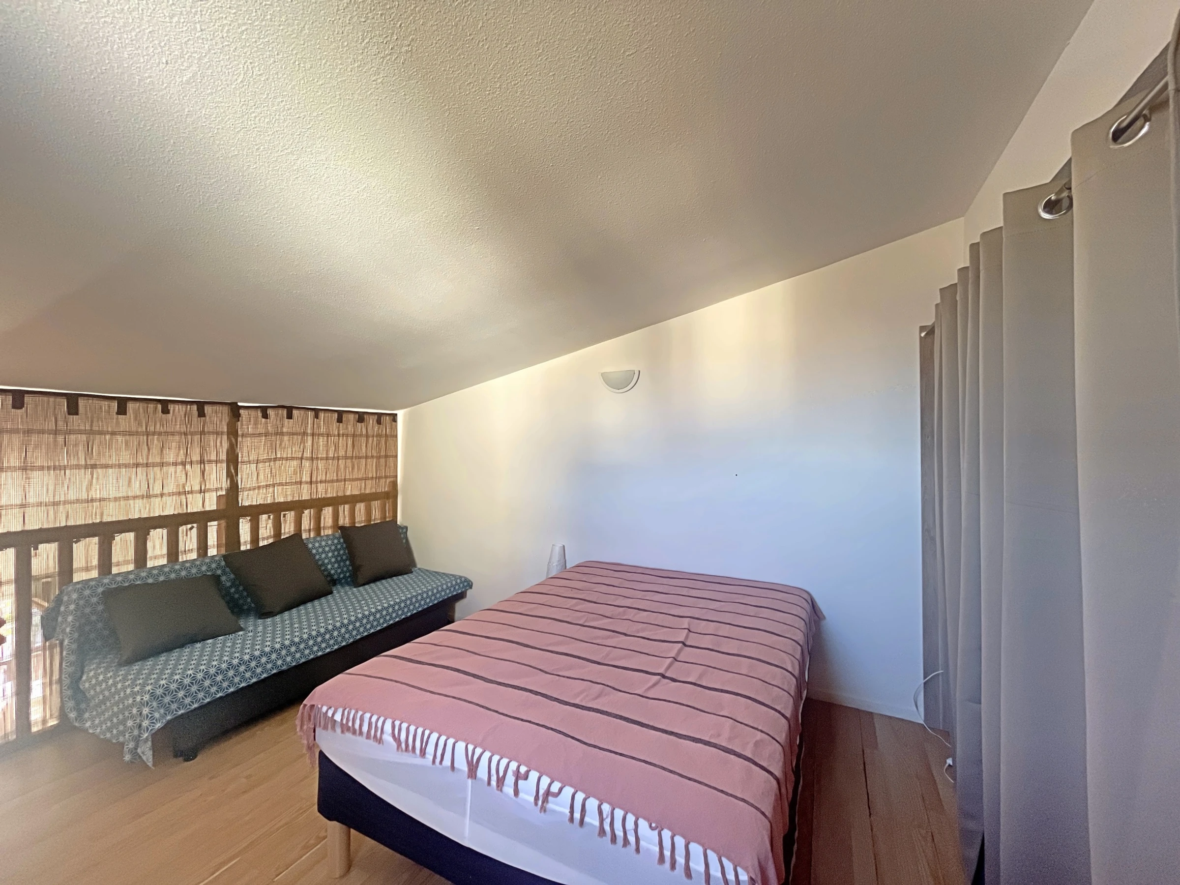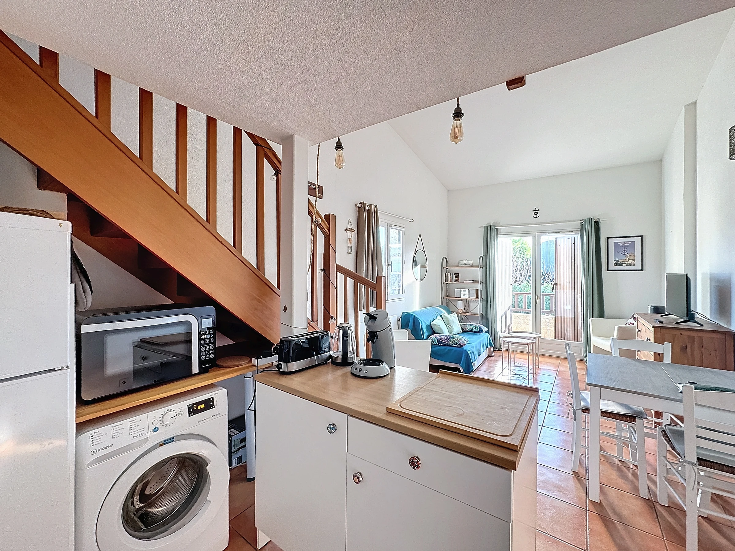 Apartment LS77 for 4 people, Villa Maria Residence. Located 50 meters from the sea and shops, this first-floor apartment features a bathroom with a shower, a storage closet, a living room with a sofa bed, a fully equipped kitchen opening onto an east-facing balcony, equipped with a ceramic hob, microwave, oven, Senseo coffee maker, and refrigerator with freezer, and a mezzanine with a double bed. There is a private parking space.