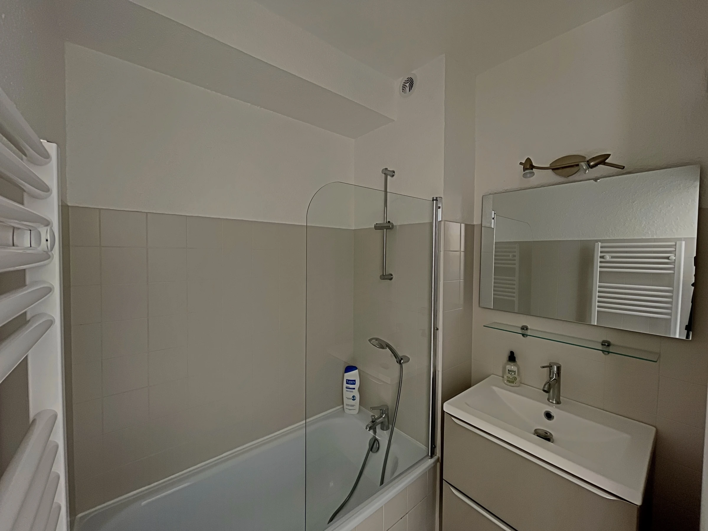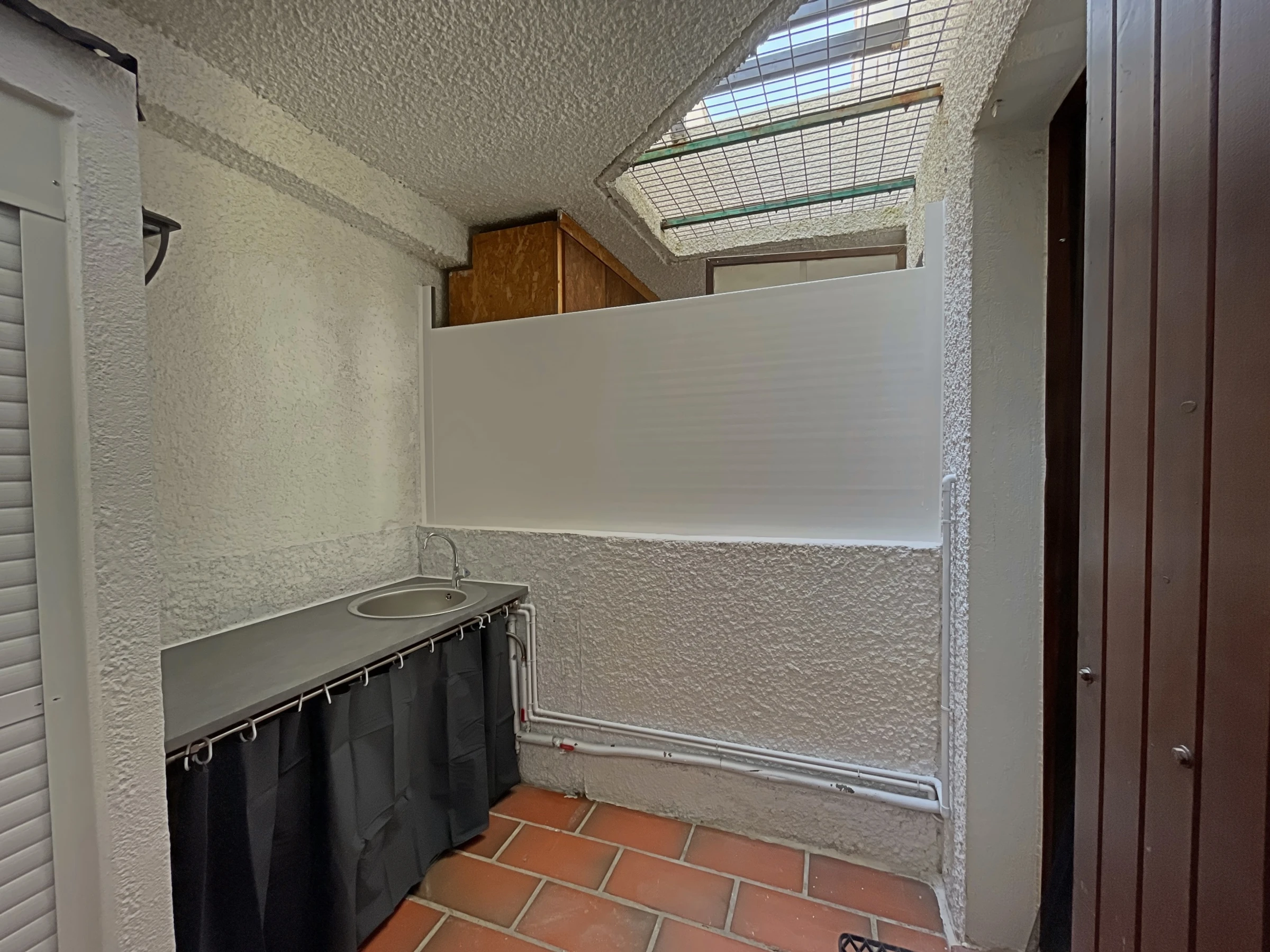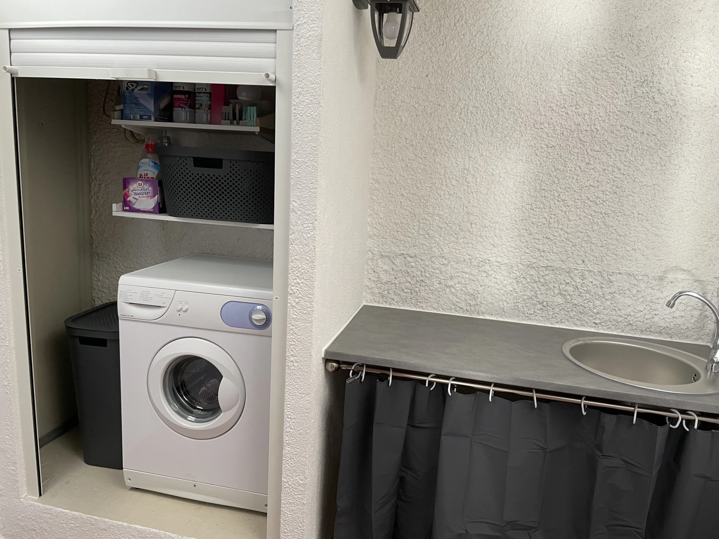 An apartment on the ground floor comprising outside a south-facing courtyard where you can park a car, inside a living room with fitted kitchen area (dishwasher, espresso coffee machine, toaster... ), a bathroom, a separate toilet, a bedroom opening onto an enclosed courtyard with a washing machine. The apartment is air-conditioned.