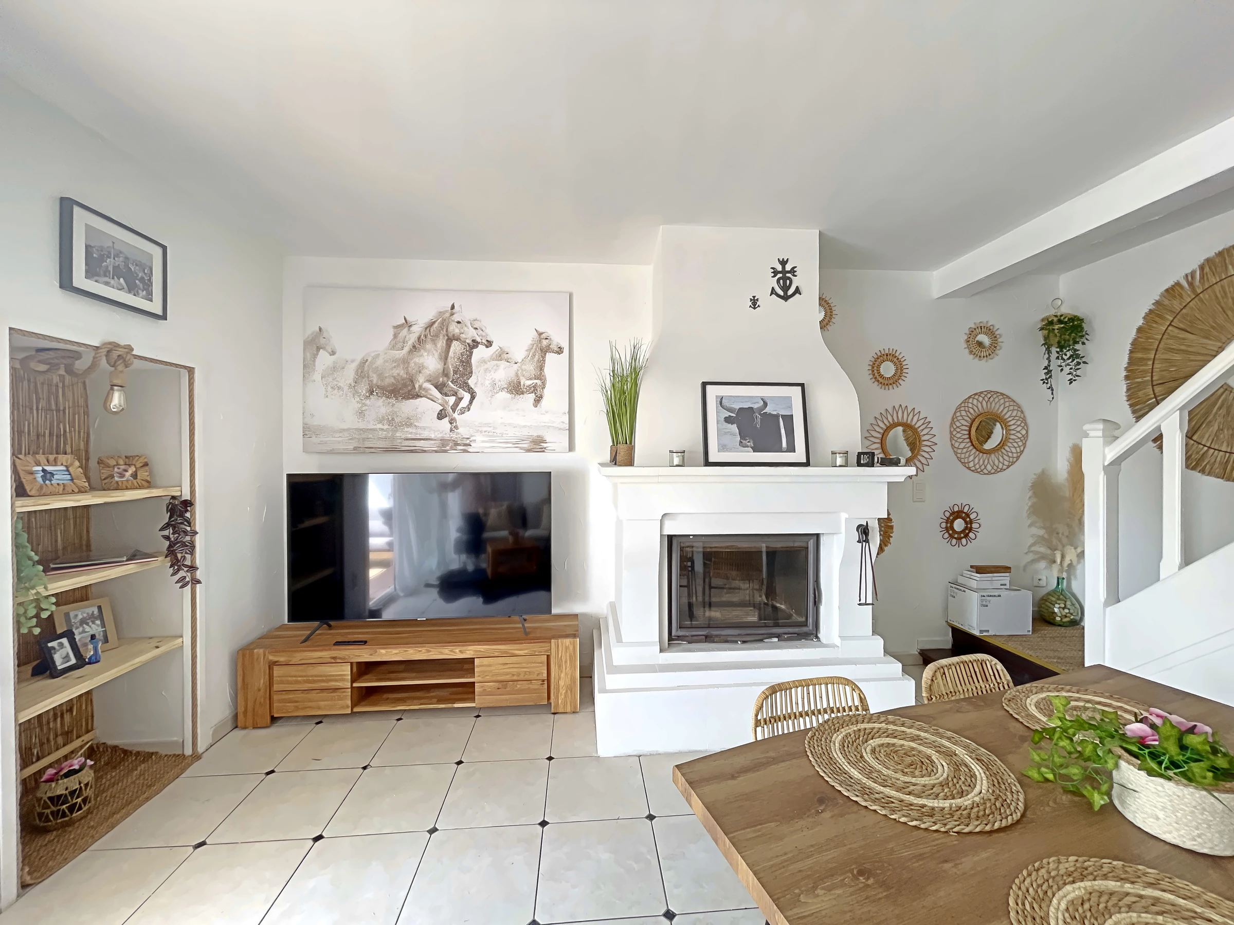 Village center opposite the Town Hall of Saintes Maries de la mer, Village house with private courtyard, comprising living-dining room with open fitted kitchen area, wc, upstairs shower room with wc, 2 bedrooms each with a 160 cm bed, laundry/cellar with washing machine and dryer.