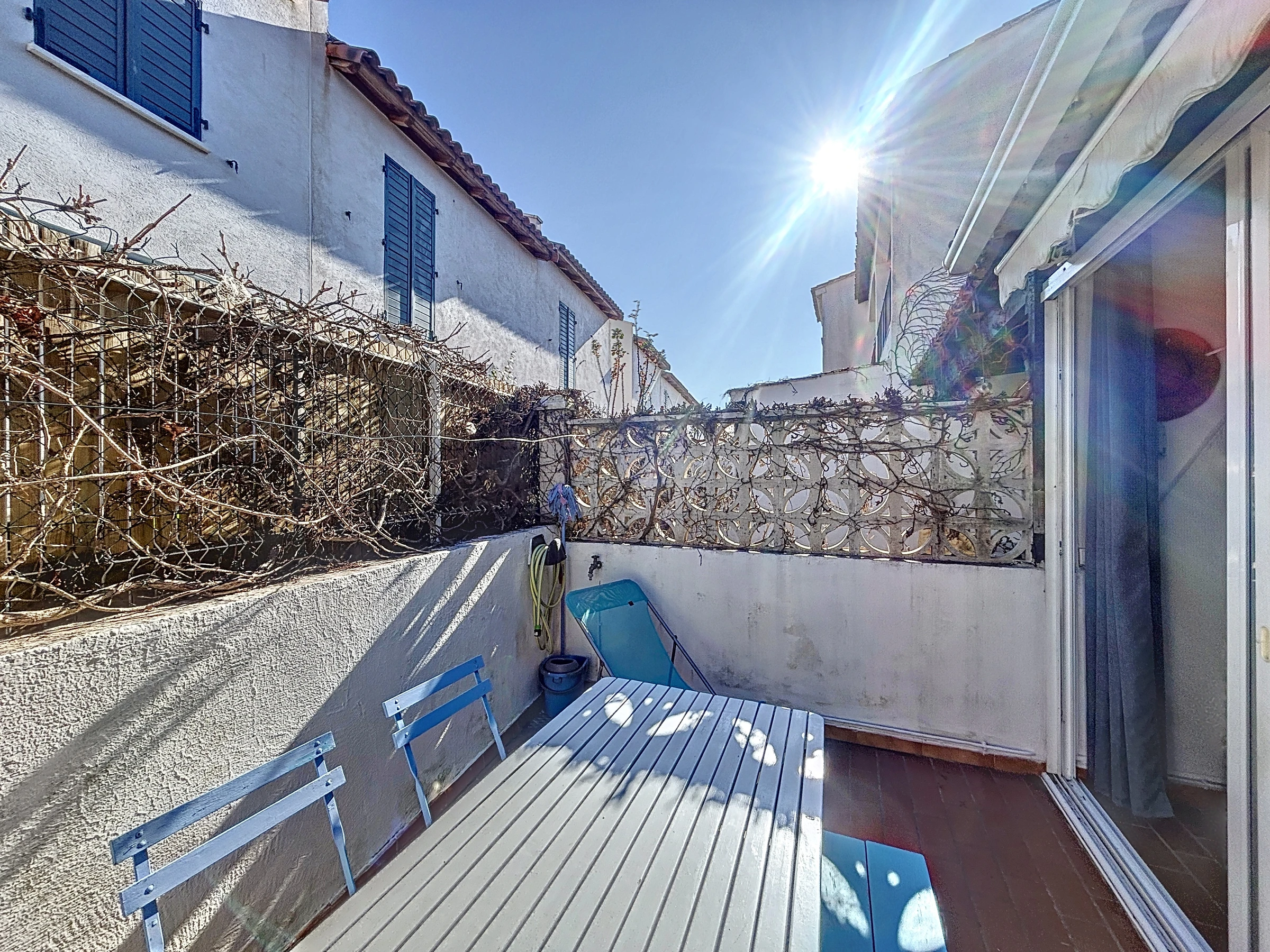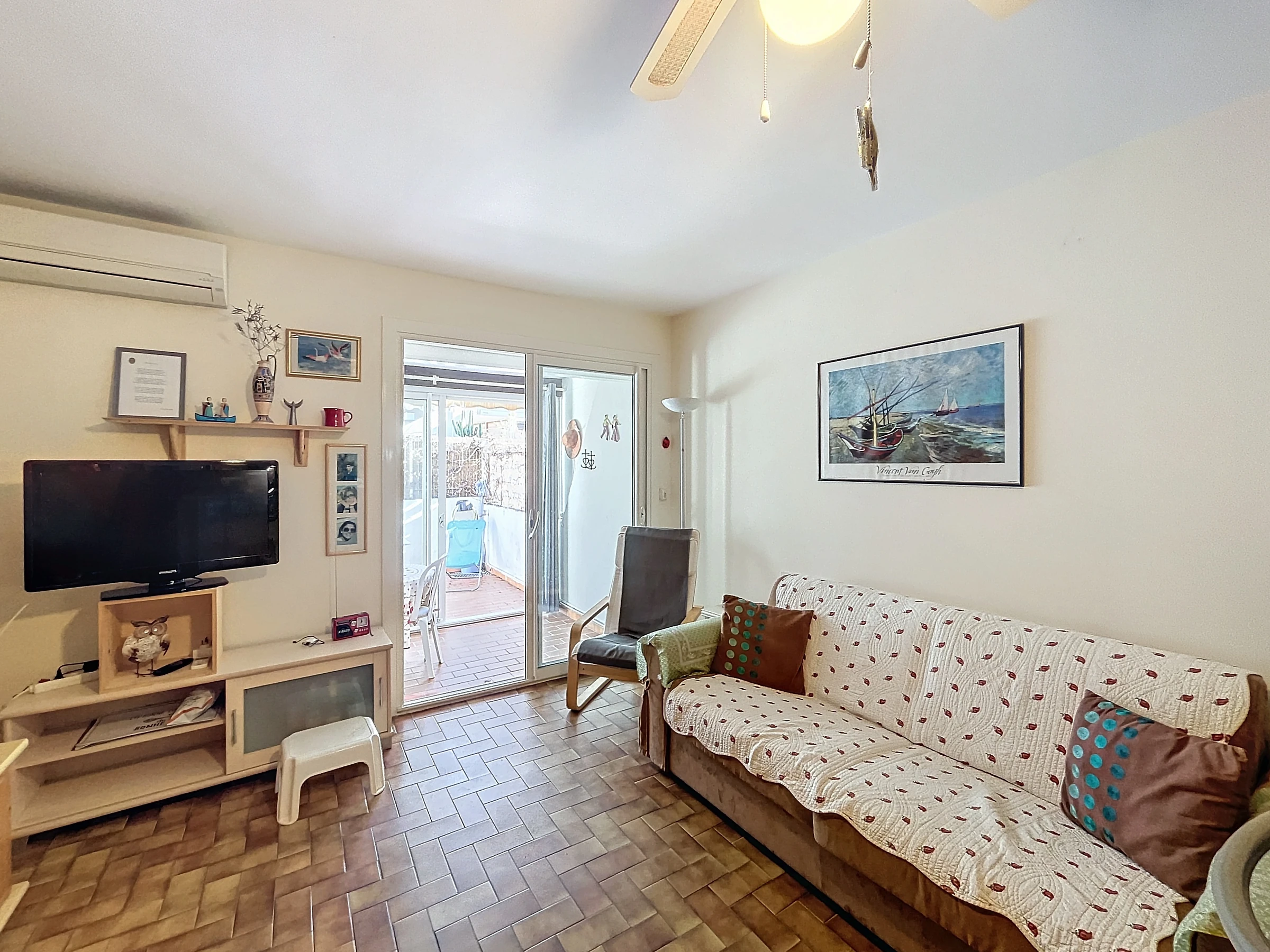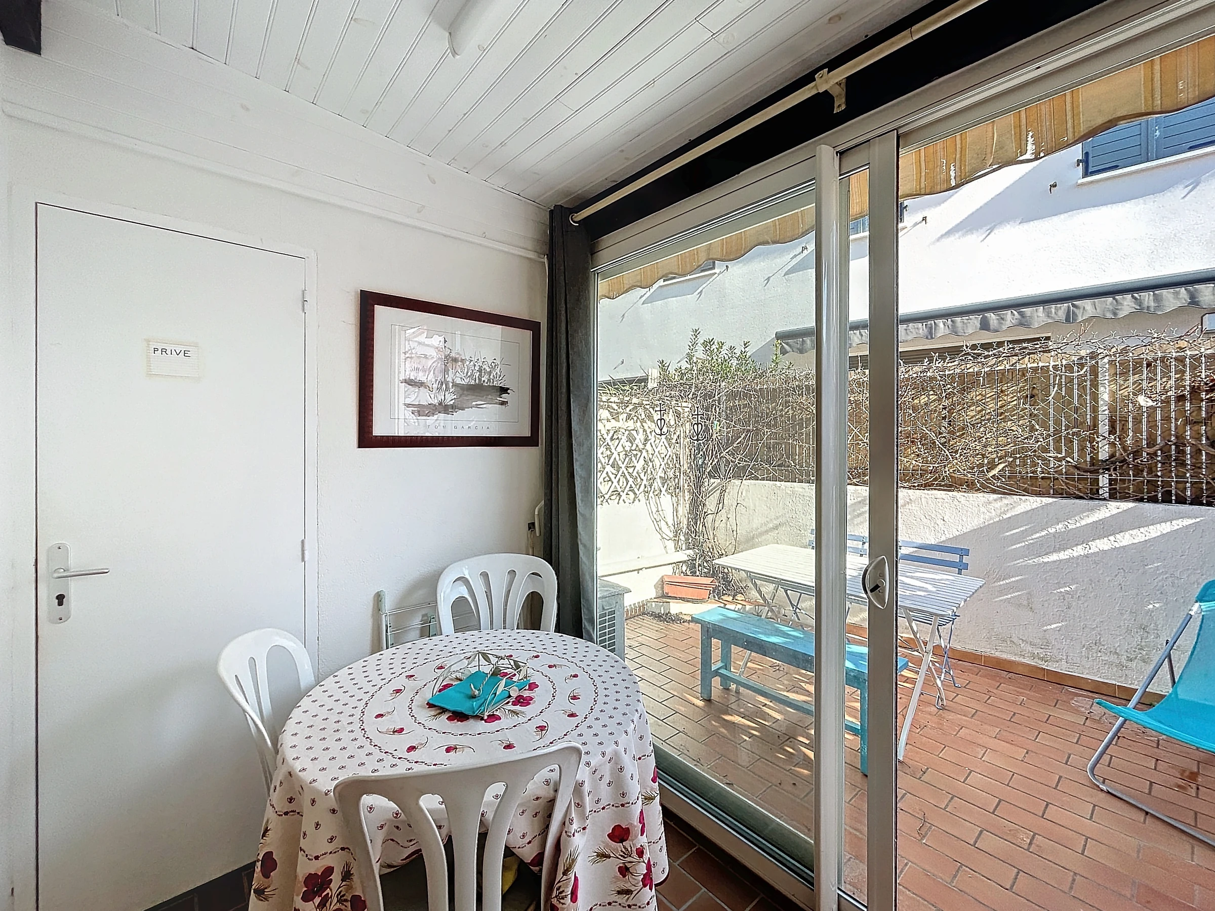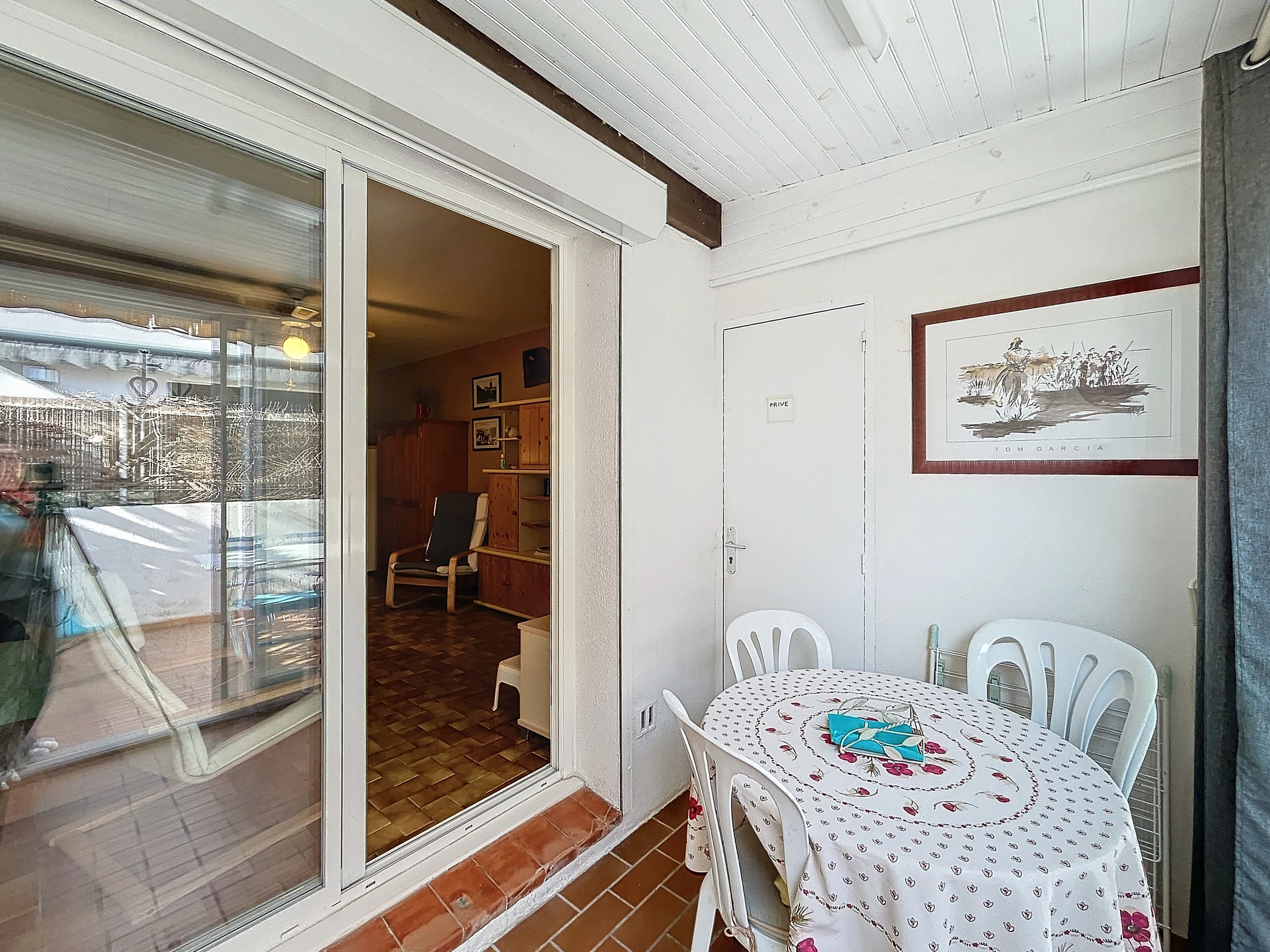 Close to the Village Center, this 39 m² studio includes an entrance with a cabin area (bunk bed = 2 x 90x190), bathroom, toilet, living-dining room with open equipped kitchen (washing machine, oven, microwave, vitro hob, fridge with freezer, coffee maker, kettle, toaster, ...), a veranda with dining area and a courtyard facing east with awning.