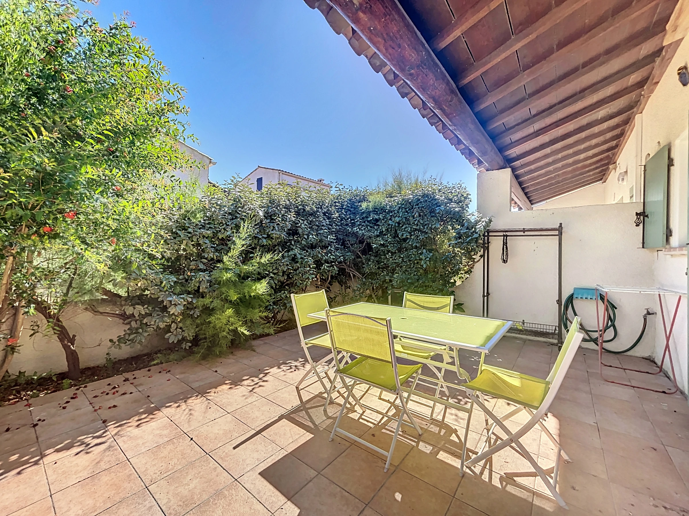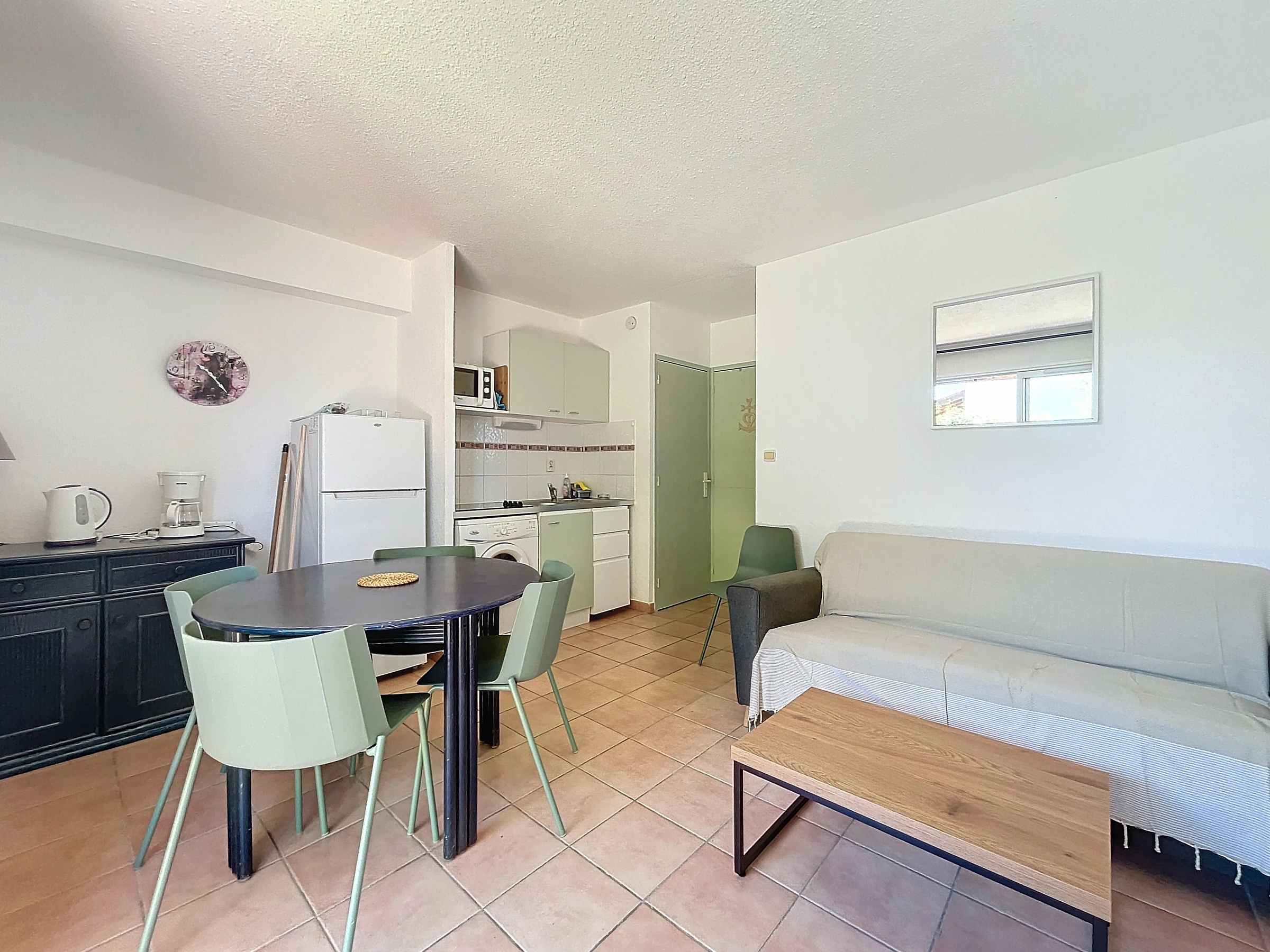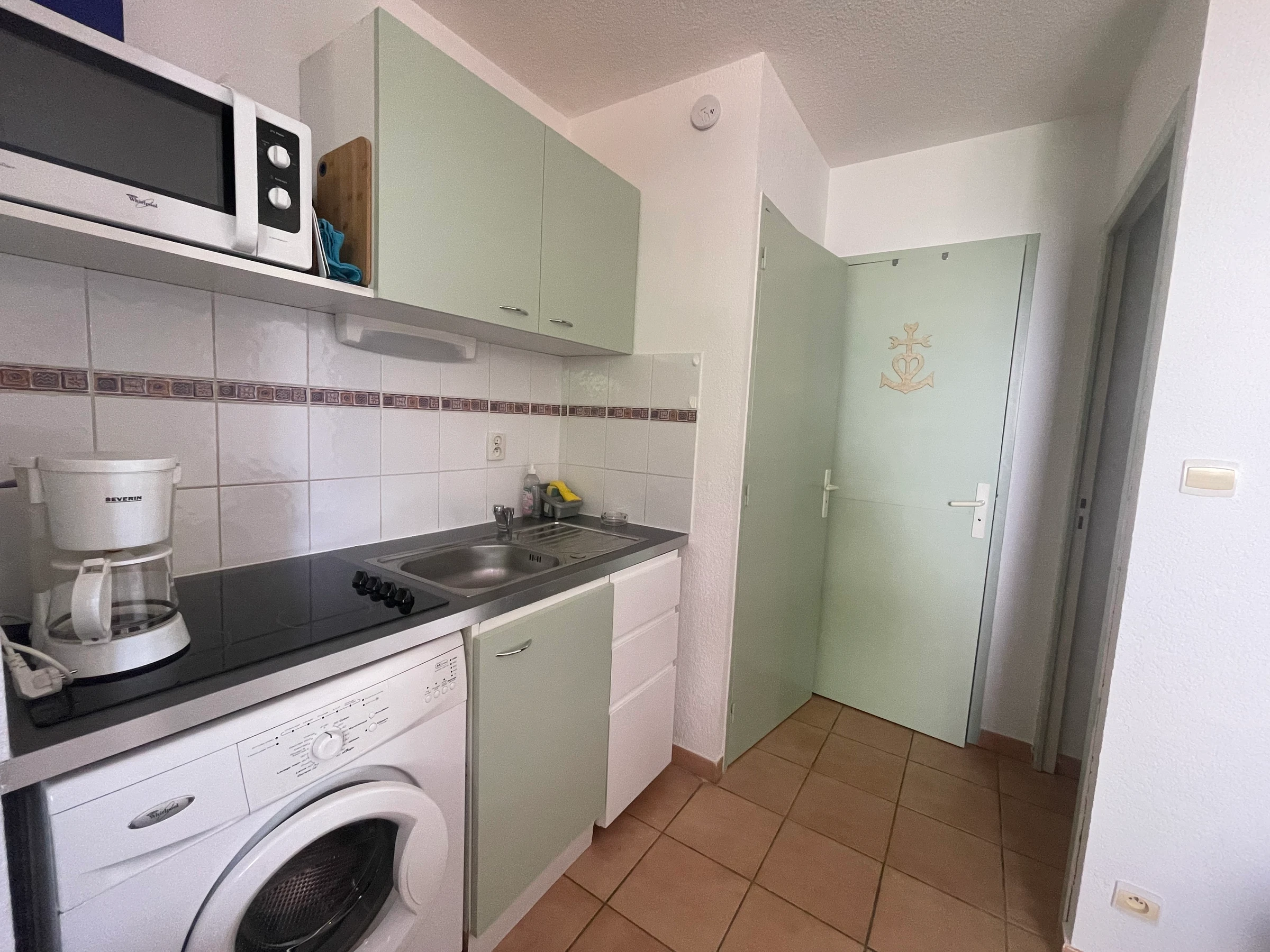 In a residence with swimming pool (open from June 1 to September 30), located 800 m from the sea, route de Cacharel, Residence le mas des Manadiers, apartment on the ground floor with courtyard of 35 m². This apartment consists of a main room with pull-out sofa (2 single beds), kitchen area equipped with refrigerator with freezer compartment, ceramic hob, microwave, coffee maker, washing machine, a bedroom with a 140 cm bed, bathroom water, toilet. There is also a private parking space.