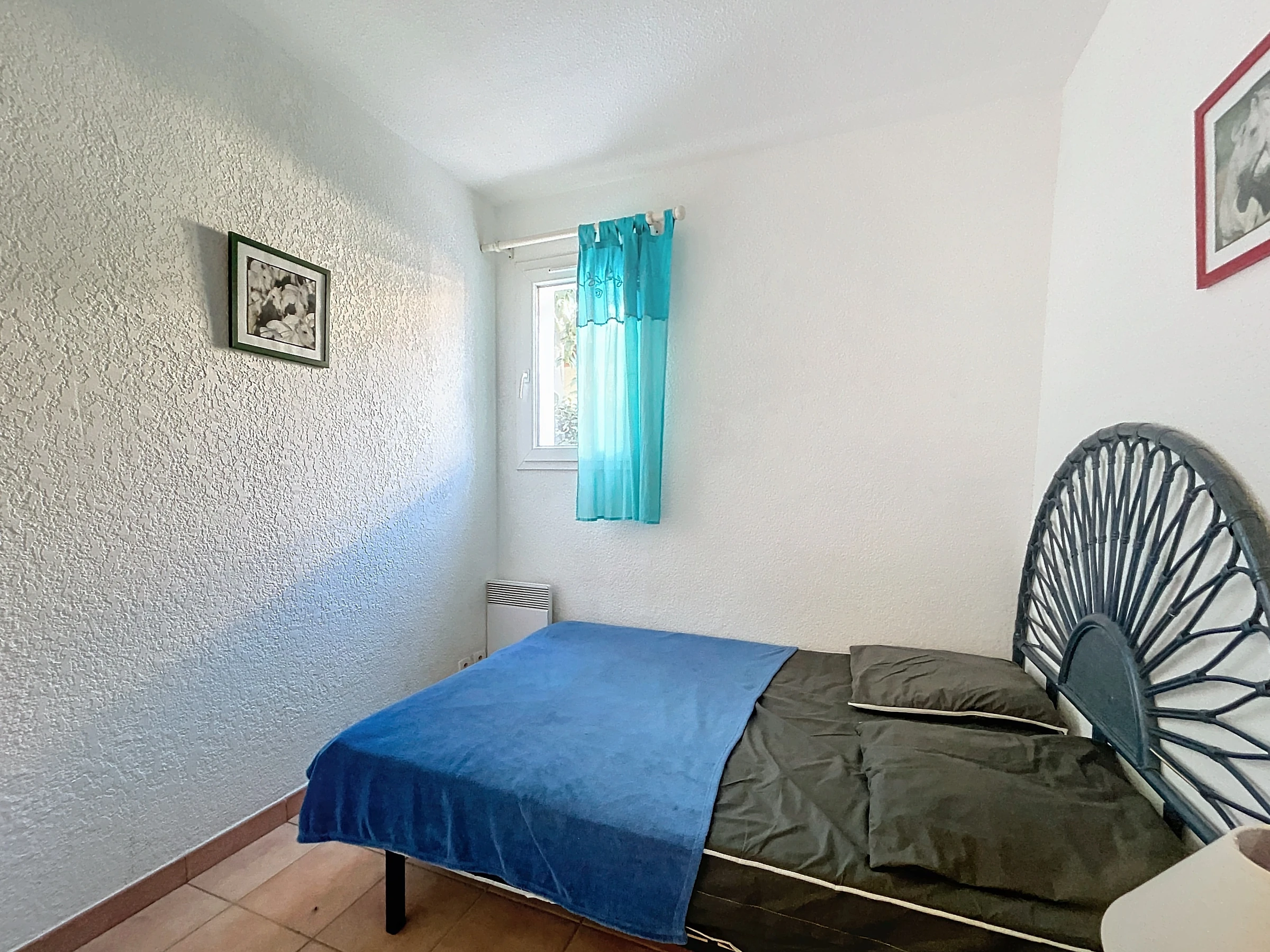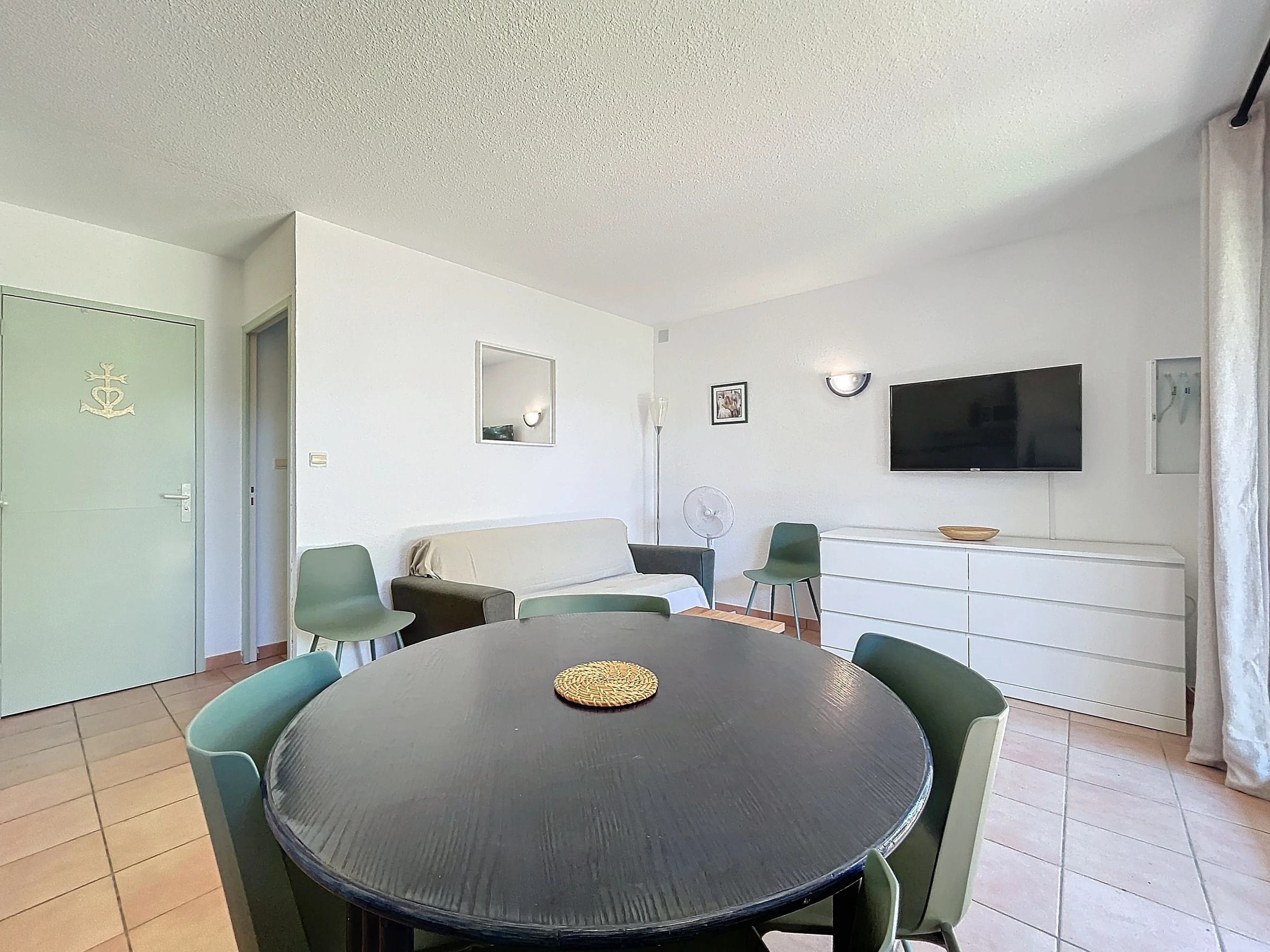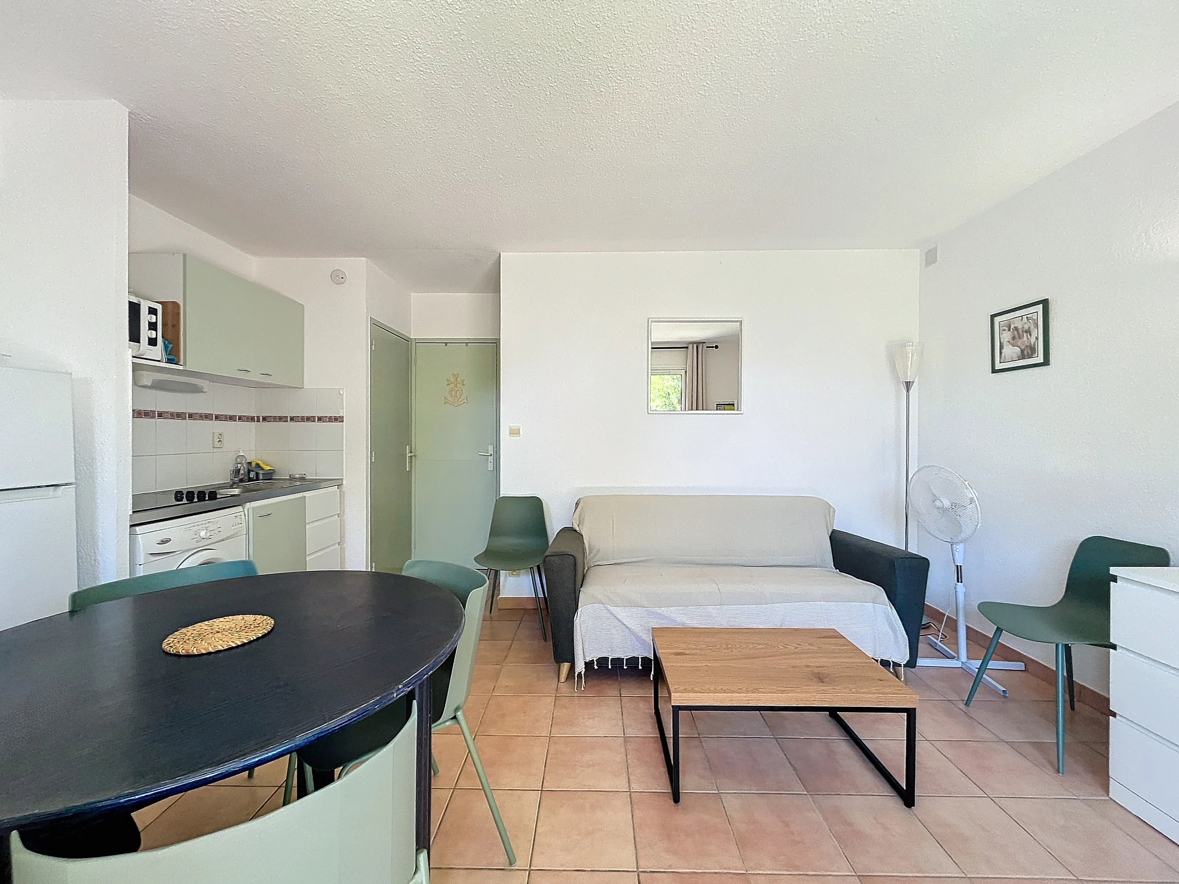 In a residence with swimming pool (open from June 1 to September 30), located 800 m from the sea, route de Cacharel, Residence le mas des Manadiers, apartment on the ground floor with courtyard of 35 m². This apartment consists of a main room with pull-out sofa (2 single beds), kitchen area equipped with refrigerator with freezer compartment, ceramic hob, microwave, coffee maker, washing machine, a bedroom with a 140 cm bed, bathroom water, toilet. There is also a private parking space.