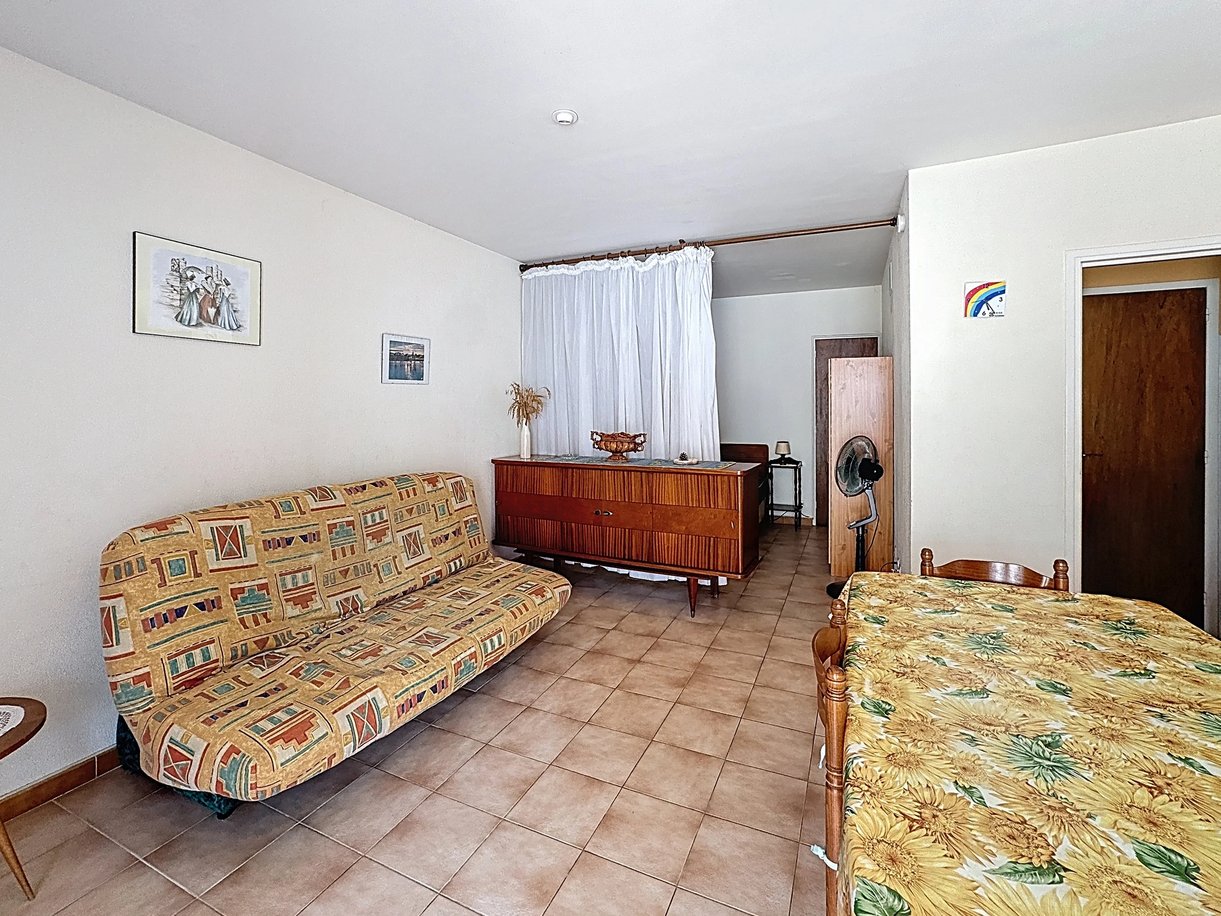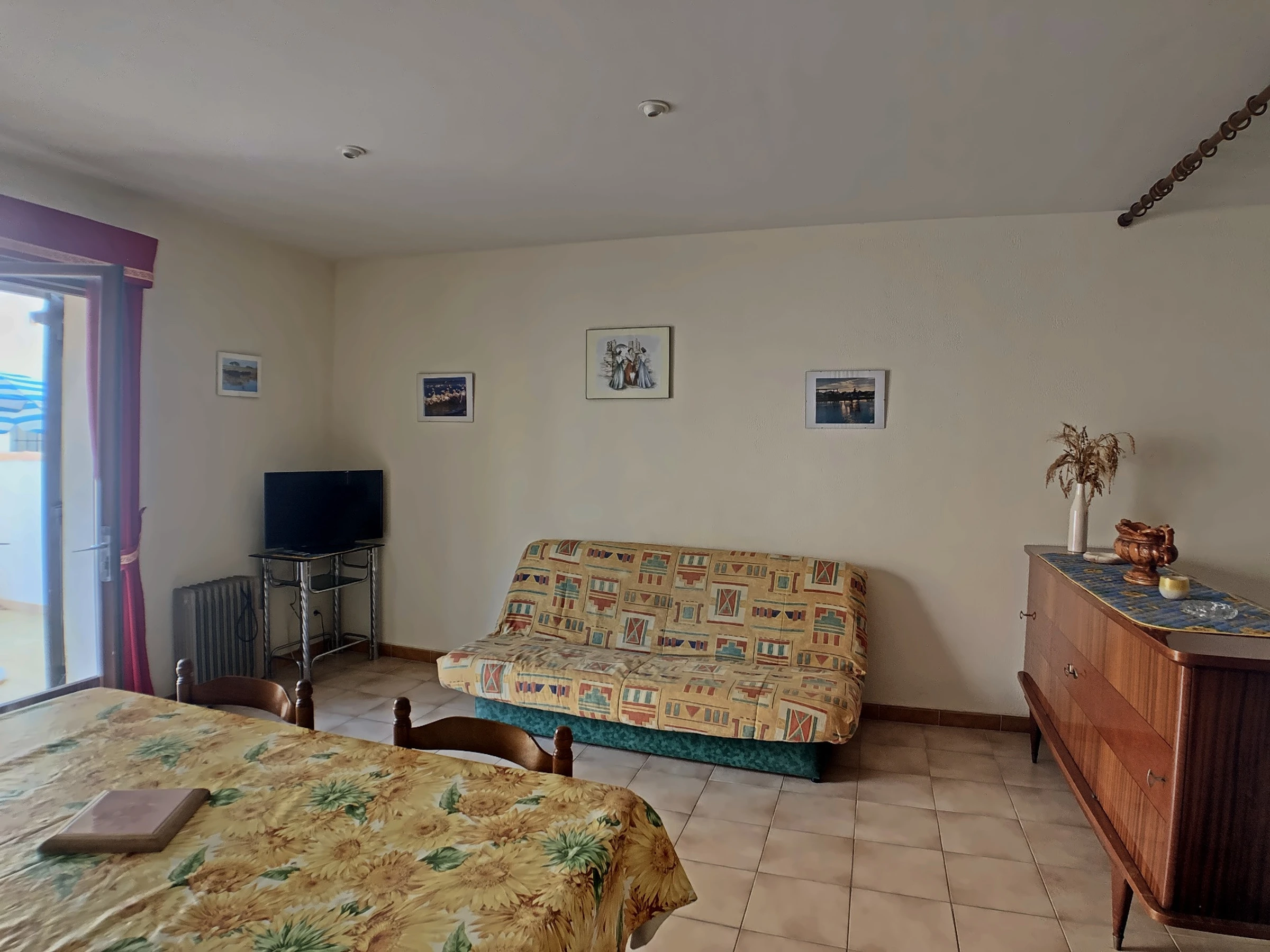 Located at 8 rue Noune Judlin, 800 m from the sea and shops, on the ground floor of an air-conditioned detached house in a quiet residential area, this apartment features a private south-facing courtyard, a main room with a kitchenette equipped with a combination oven/microwave, refrigerator, and a sofa bed for 2 people, a bathroom, and a toilet. A bedroom with a double bed is separated from the living room by a curtain. Pets are not allowed.