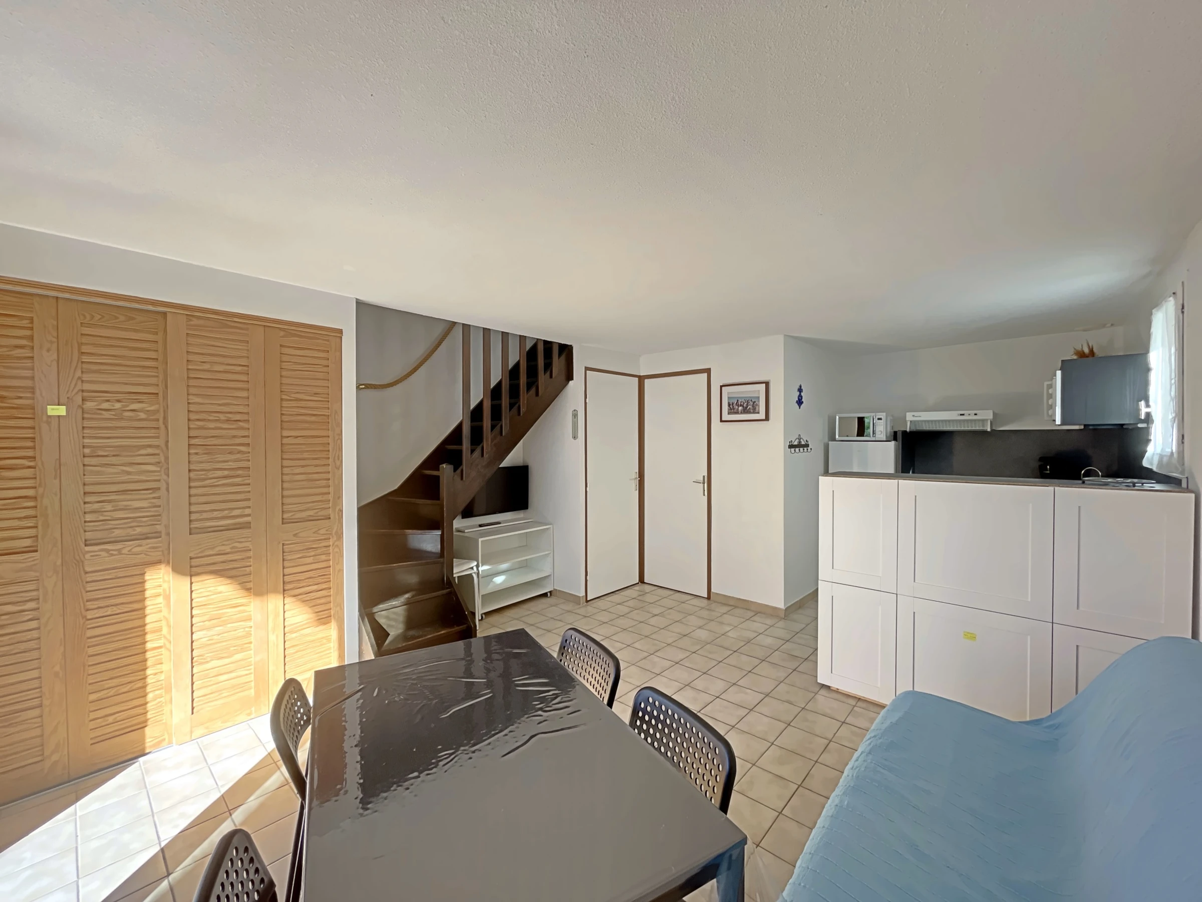 Located at the entrance to the village, the Les Hameaux de Camargue residence is a residence with secure swimming pool (open from June 1 to September 30) Each accommodation has a numbered parking space. This accommodation consists of a 25 m² enclosed courtyard, a main room with open kitchen equipped with fridge freezer, microwave, mini oven, 2-burner hob, 1 electric coffee maker and an espresso coffee maker, a BZ type convertible sofa for 2 people , a bathroom with washing machine, WC, upstairs a bedroom with a bed for 2 people and a bedroom with 1 90cm bed + 1 140cm bed and 1 travel [hidden] conditioning.