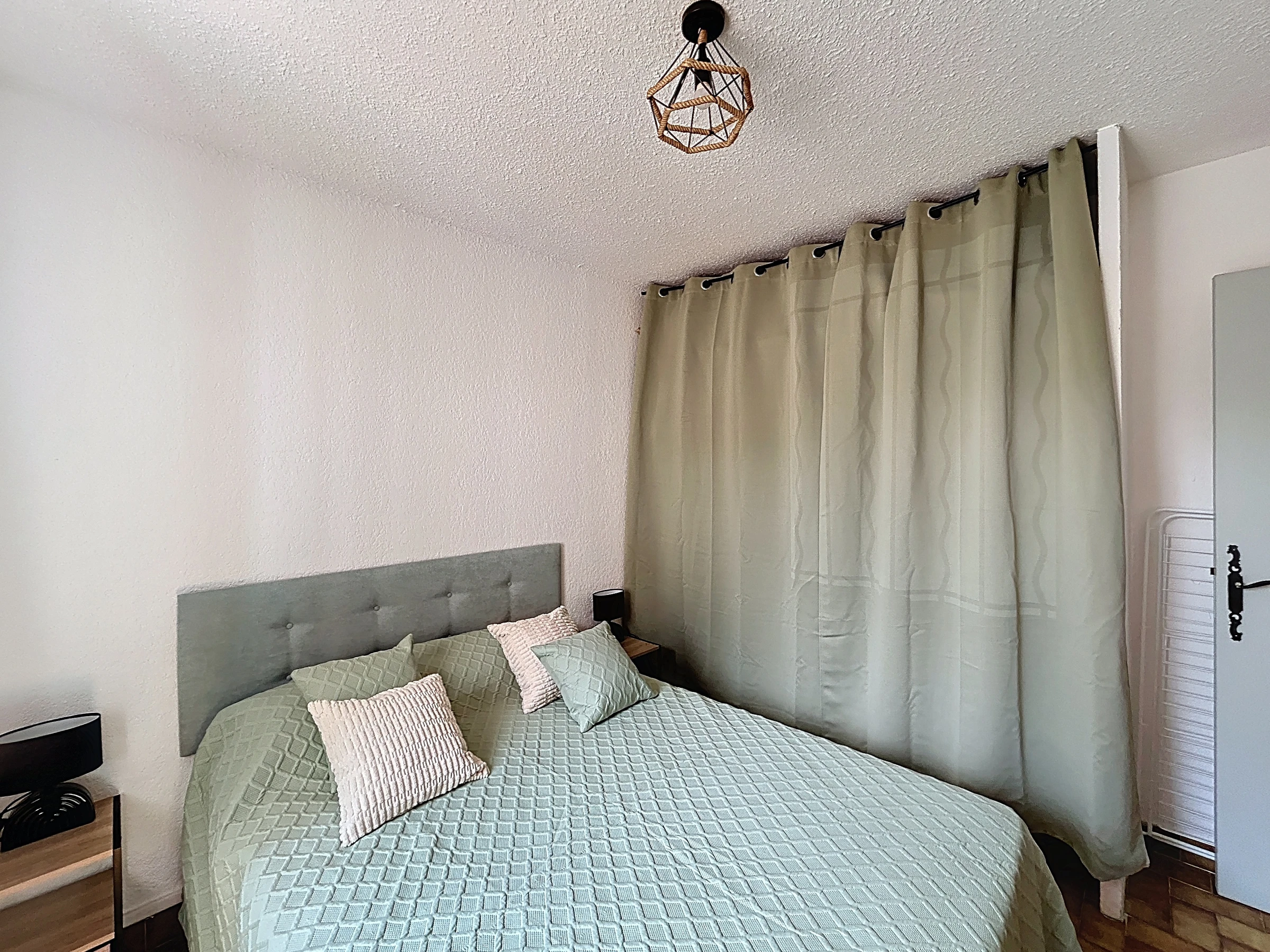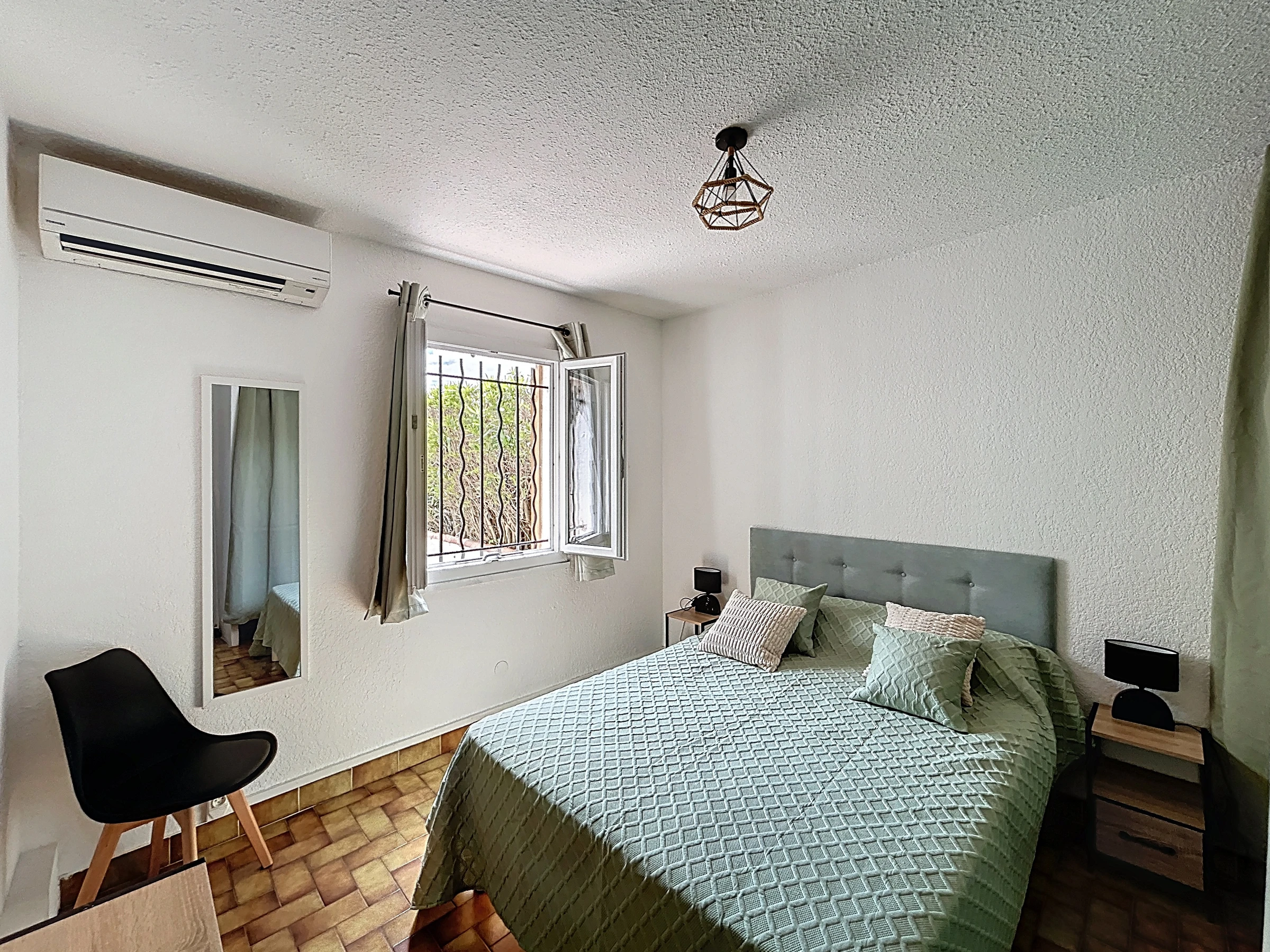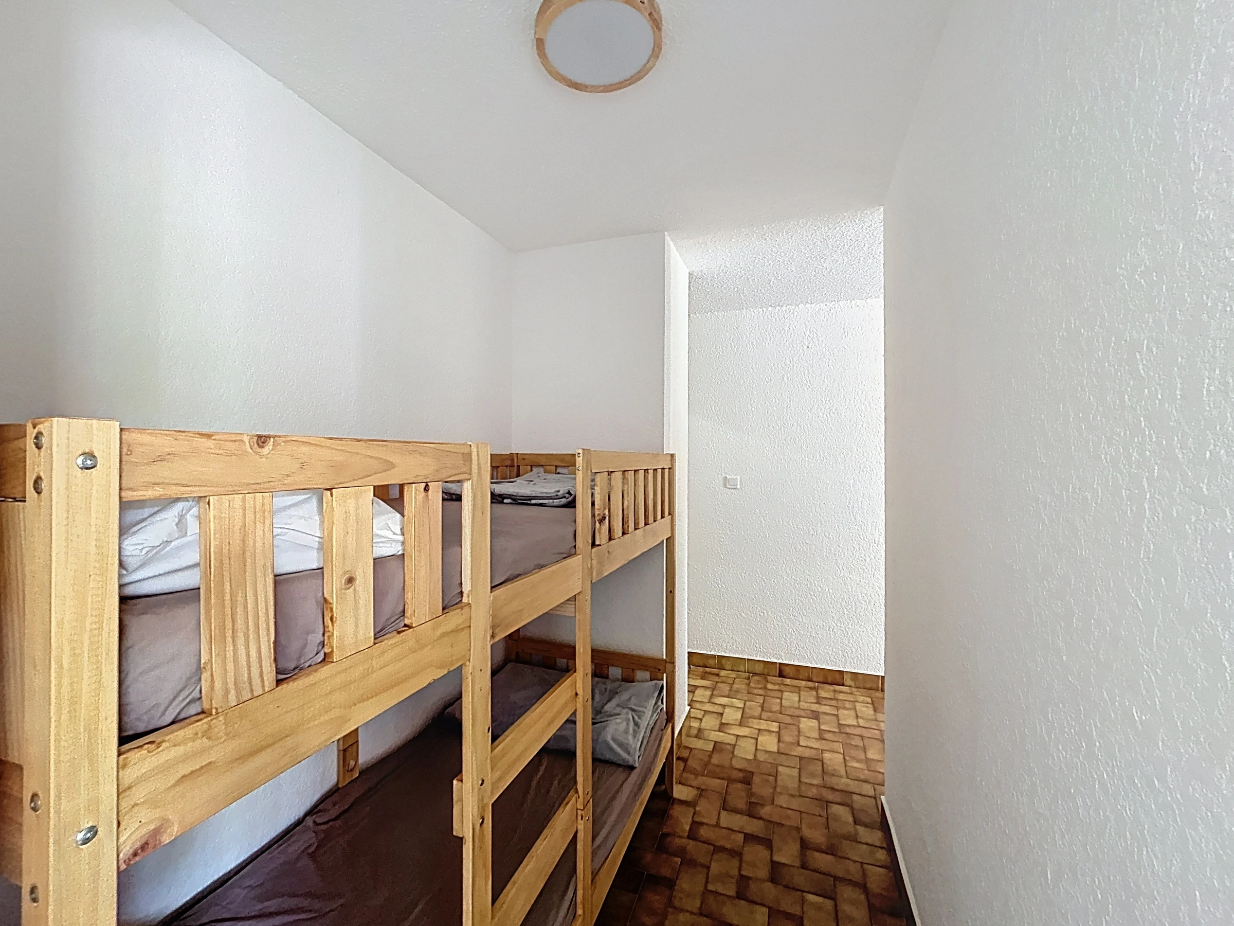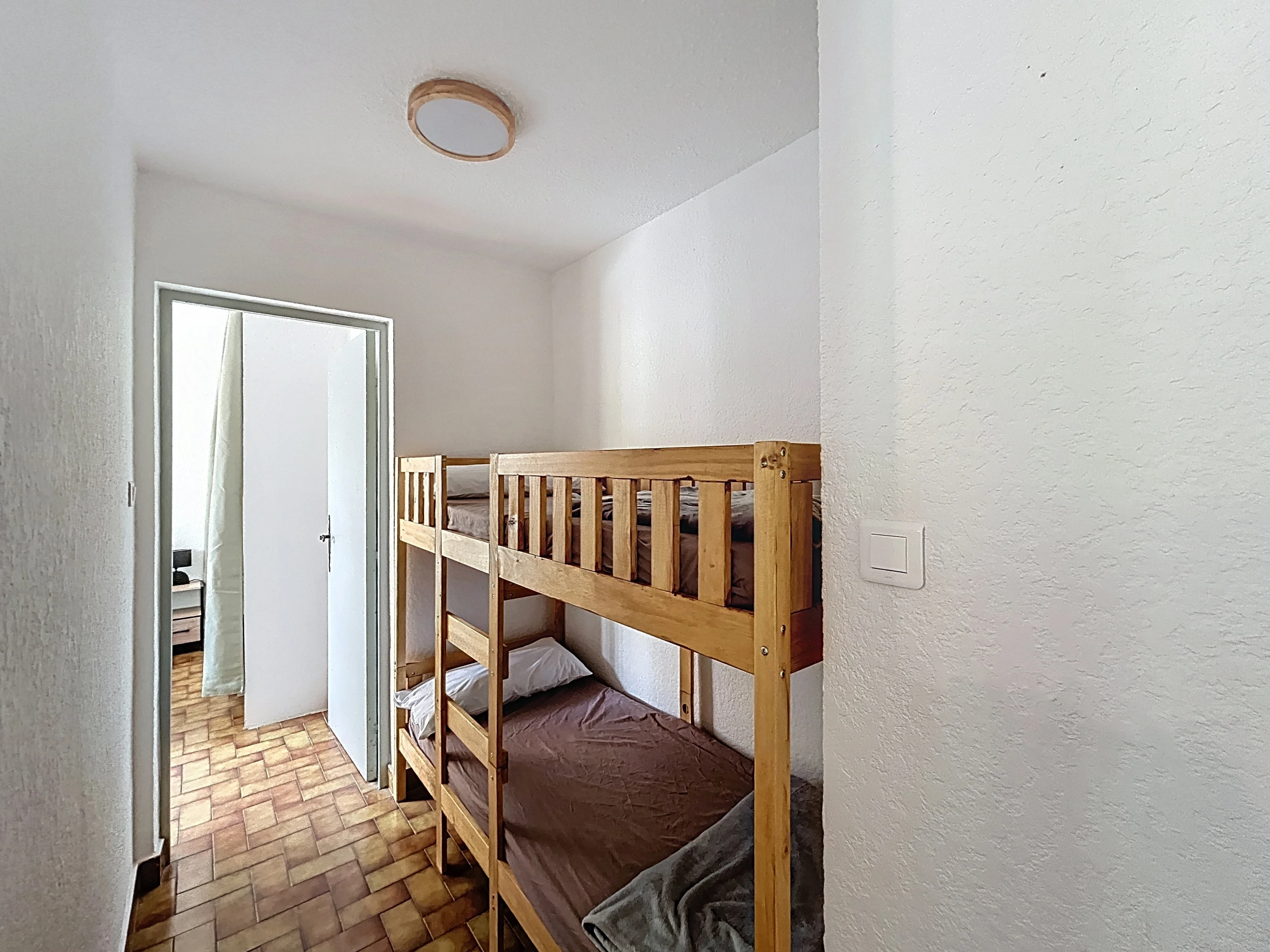 This single-story apartment near the city center includes an entrance hall, bathroom with washing machine, toilet, sleeping alcove with bunk beds, a bedroom with a 140 cm bed, a living/dining room with a fully equipped kitchenette, and a terrace with a courtyard area where you can park your vehicle.
