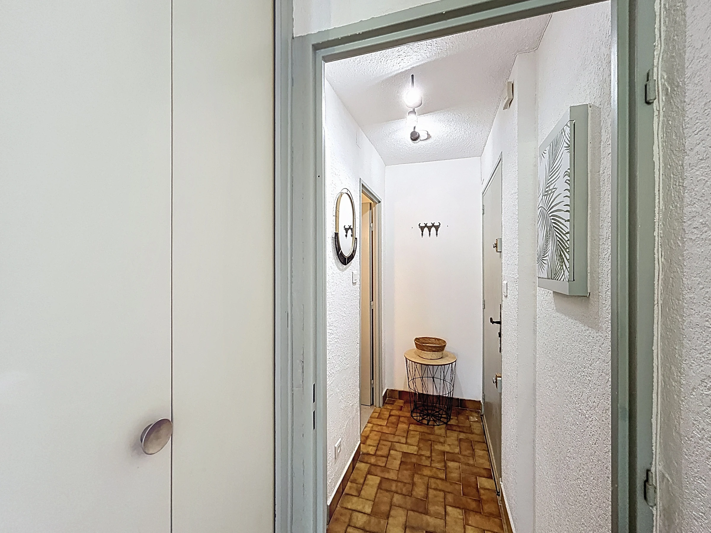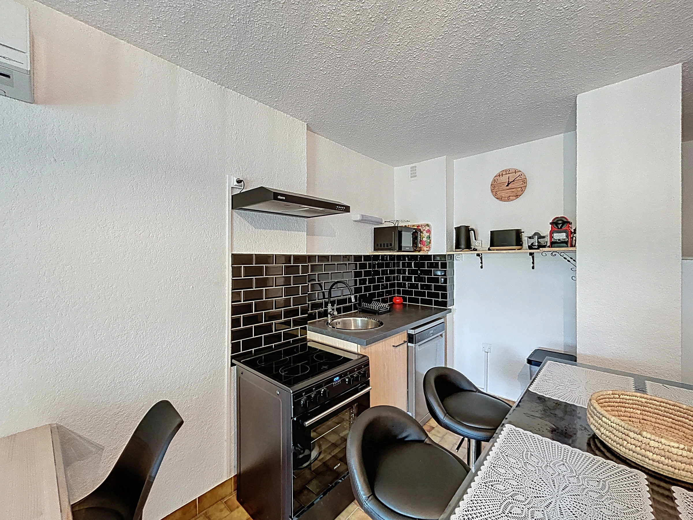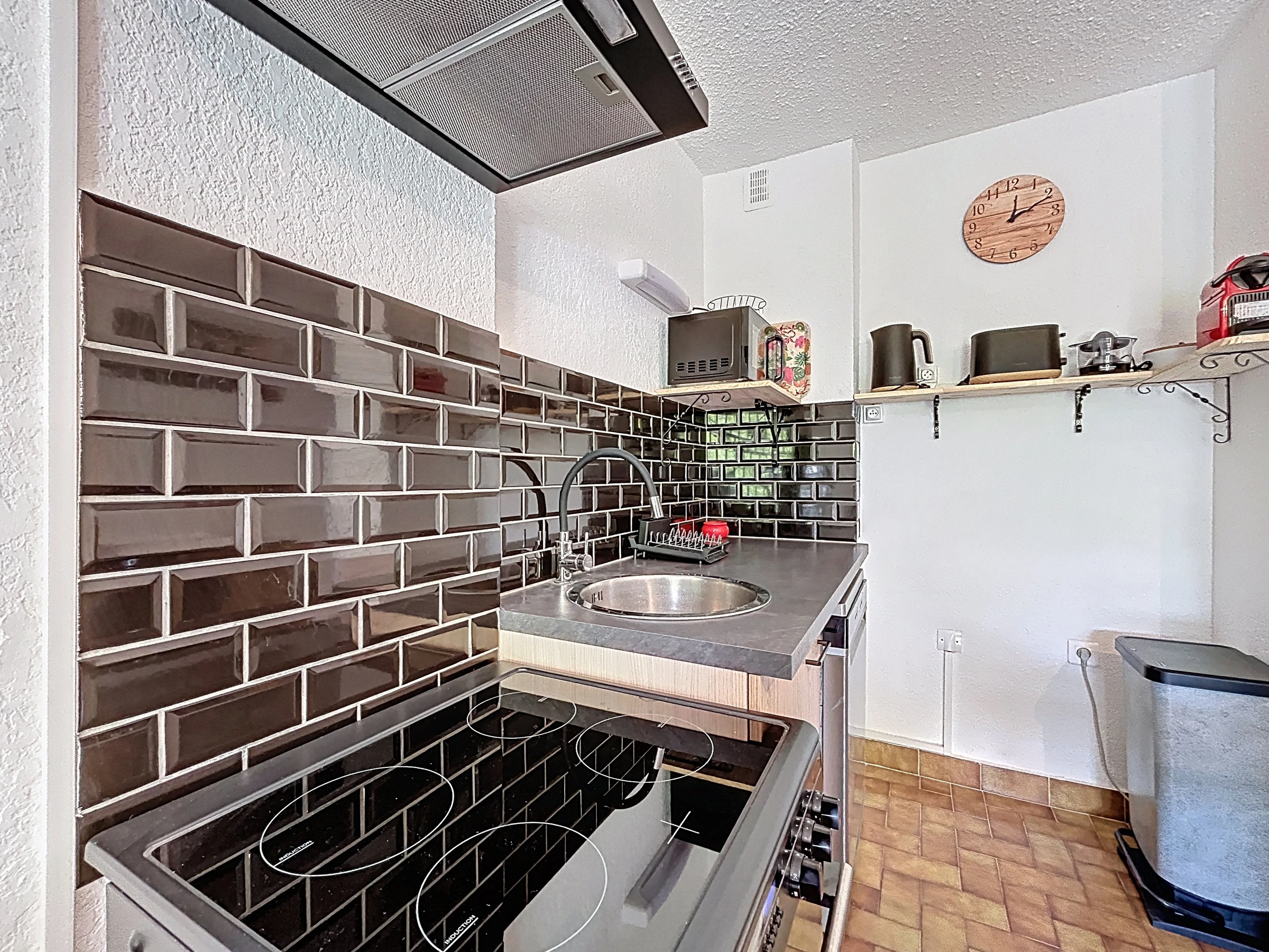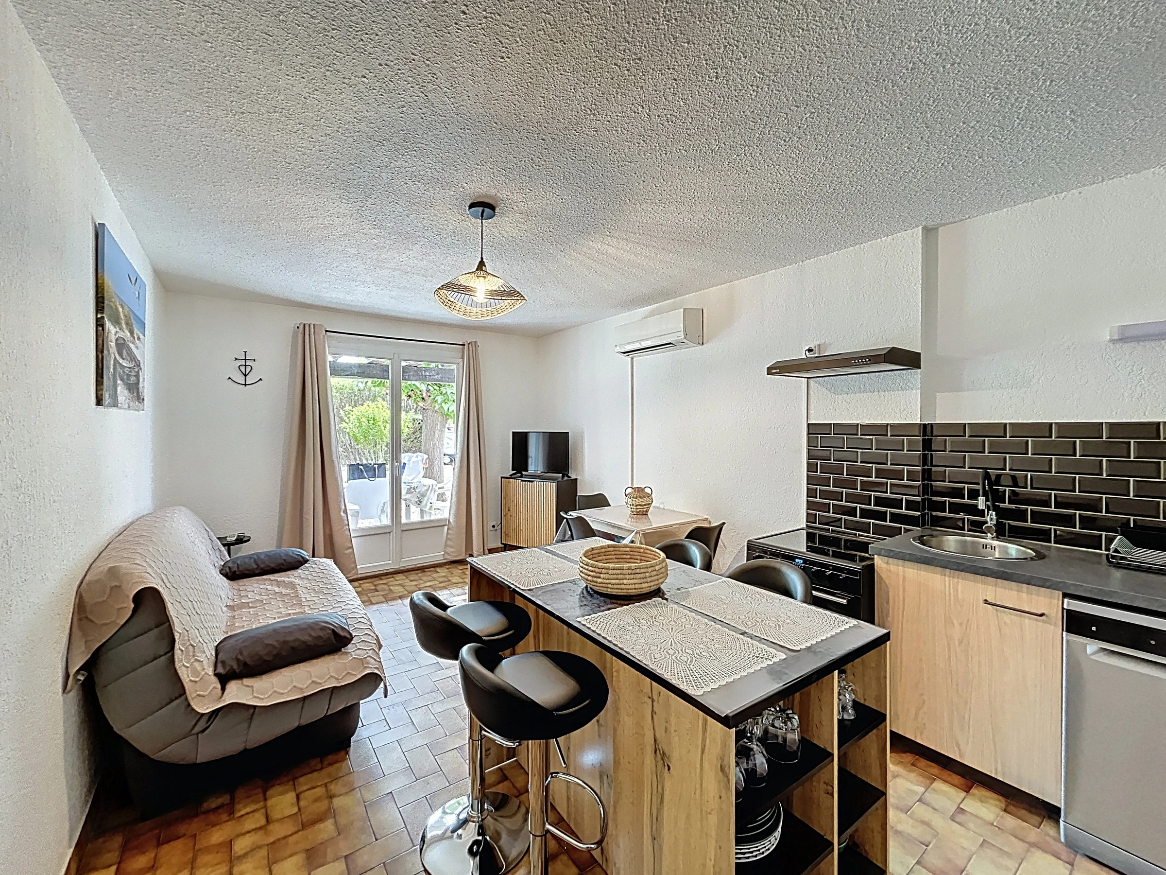 This single-story apartment near the city center includes an entrance hall, bathroom with washing machine, toilet, sleeping alcove with bunk beds, a bedroom with a 140 cm bed, a living/dining room with a fully equipped kitchenette, and a terrace with a courtyard area where you can park your vehicle.
