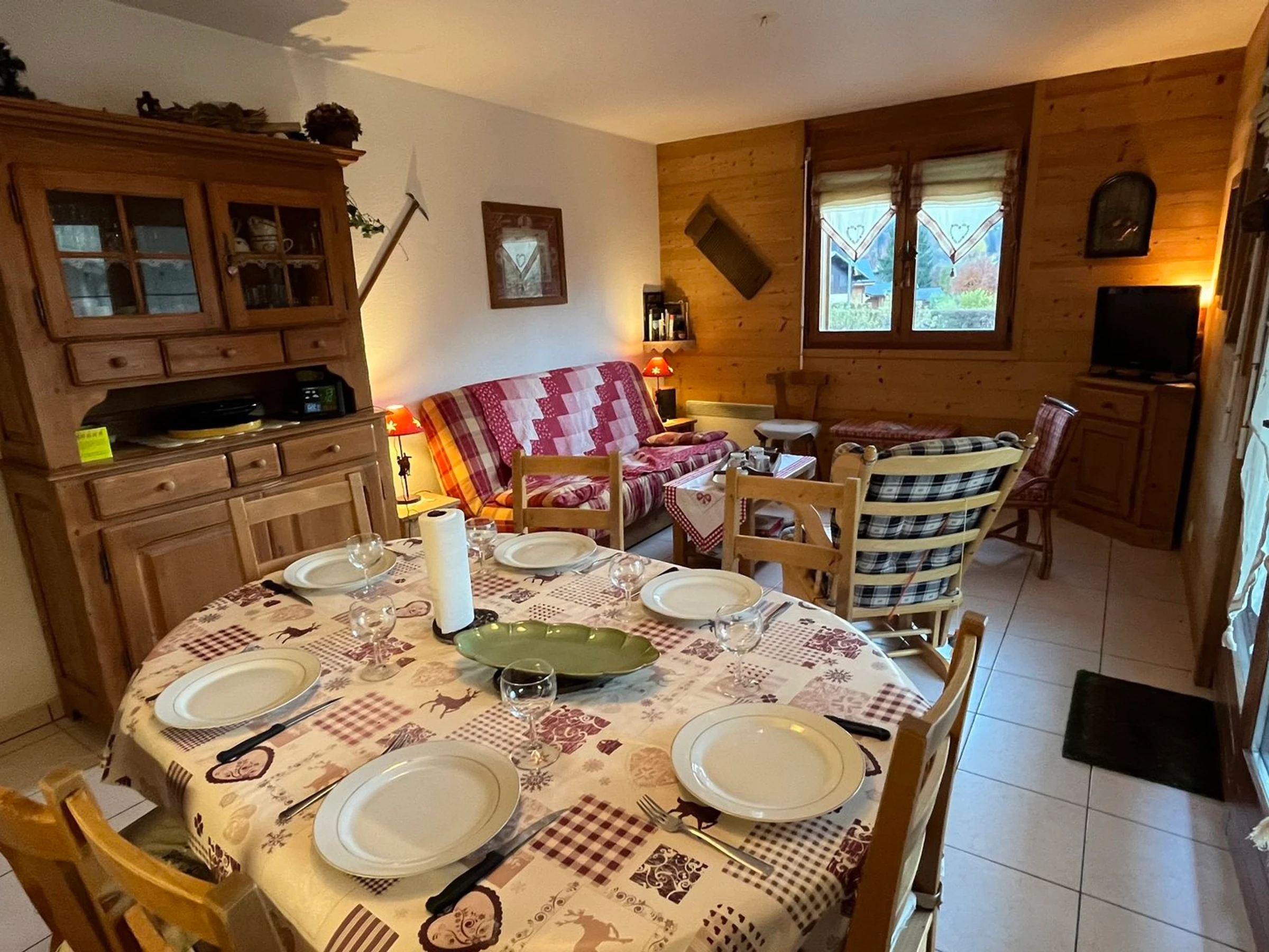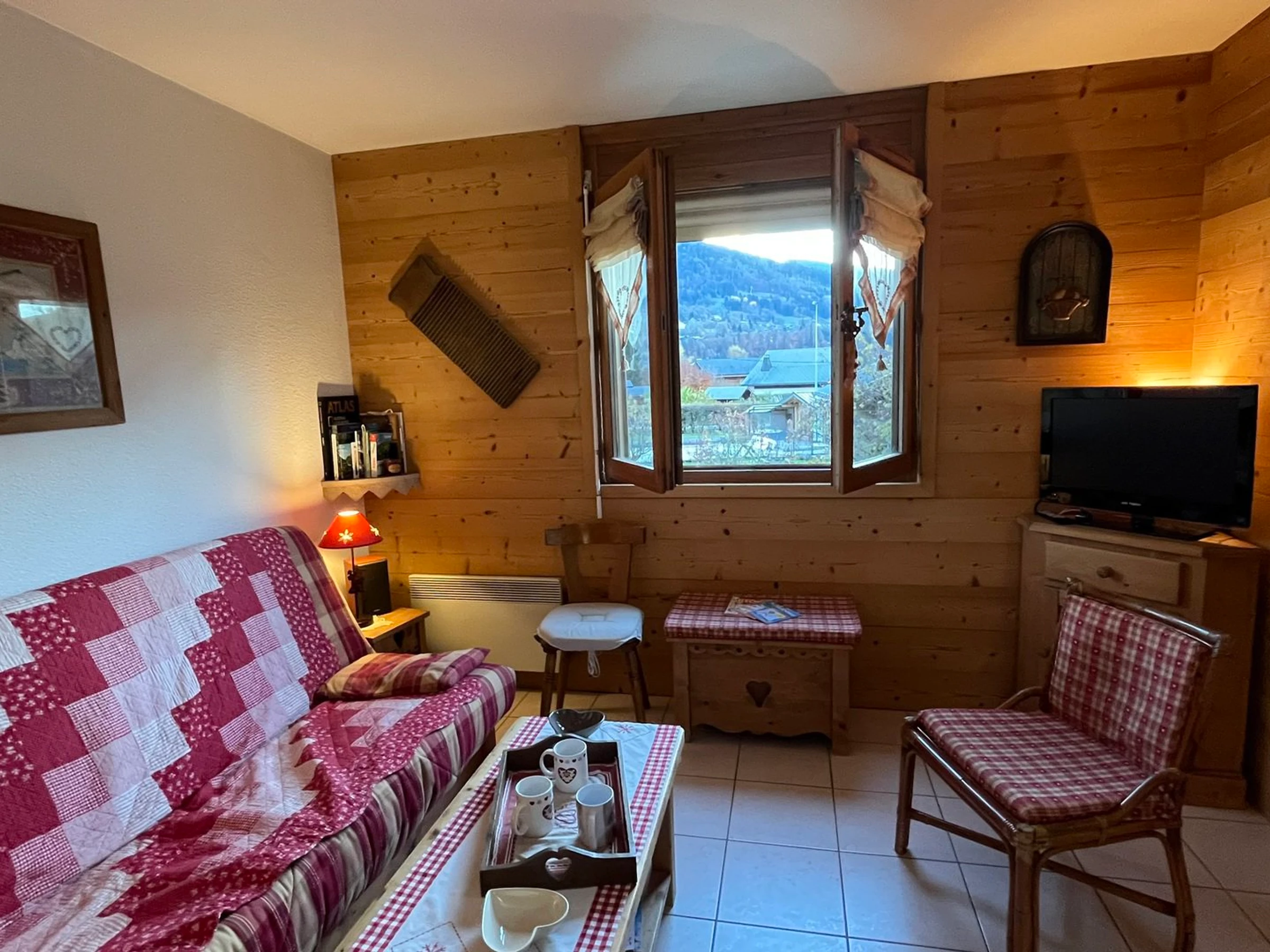 - Living room (21.55m², 1 bay window + 2 windows, west-facing, view: mountains, houses, road): flat-screen LCD TV/DVD player, sofa bed
