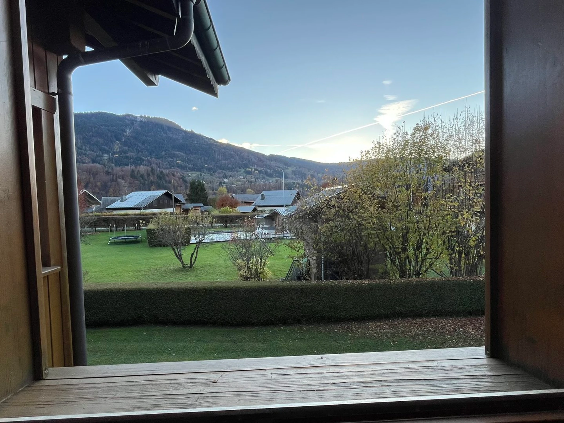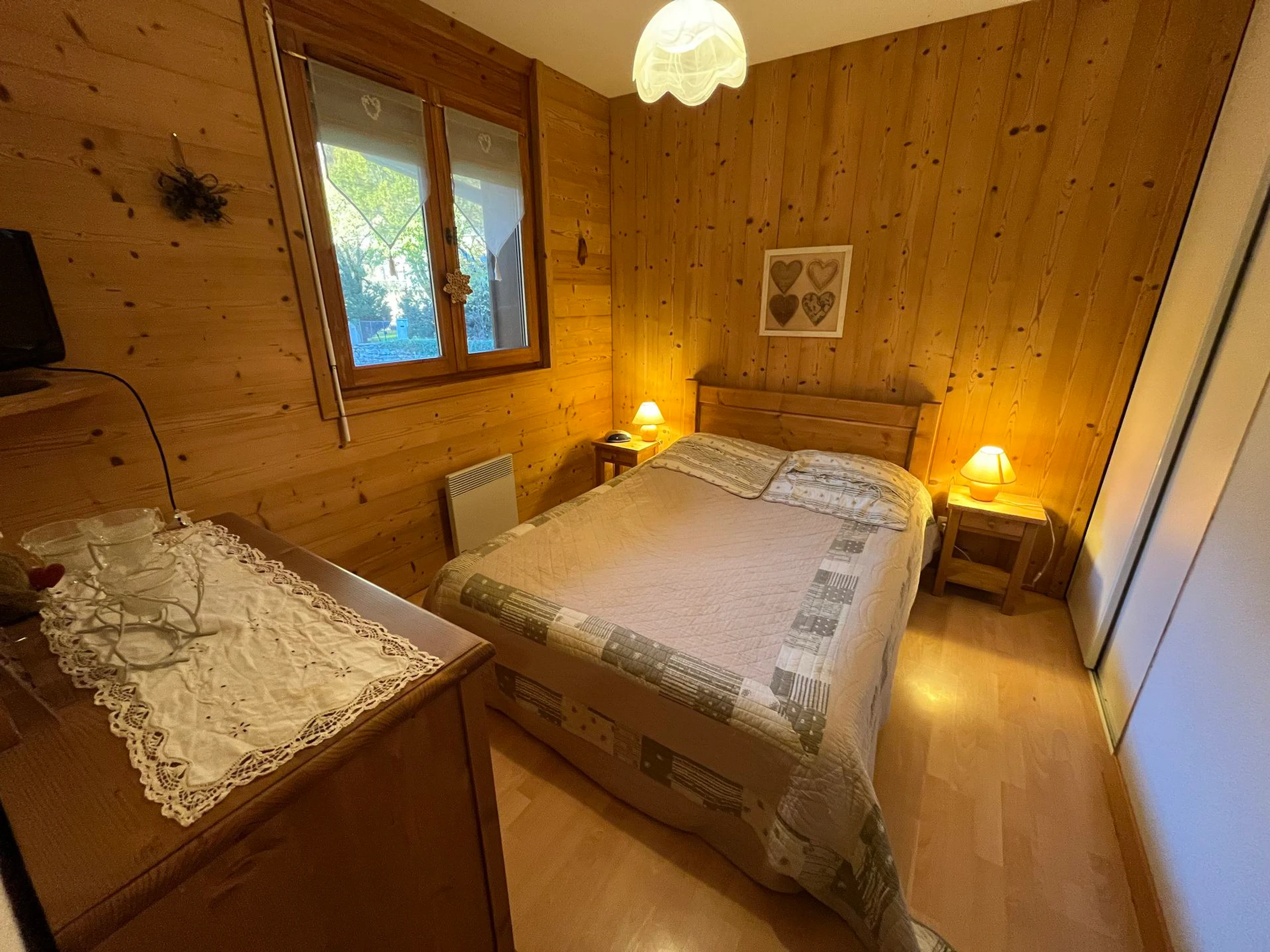 - Bedroom 2 (9.00m², 1 window, west-facing, mountain and houses): 1 double bed with TV and closet