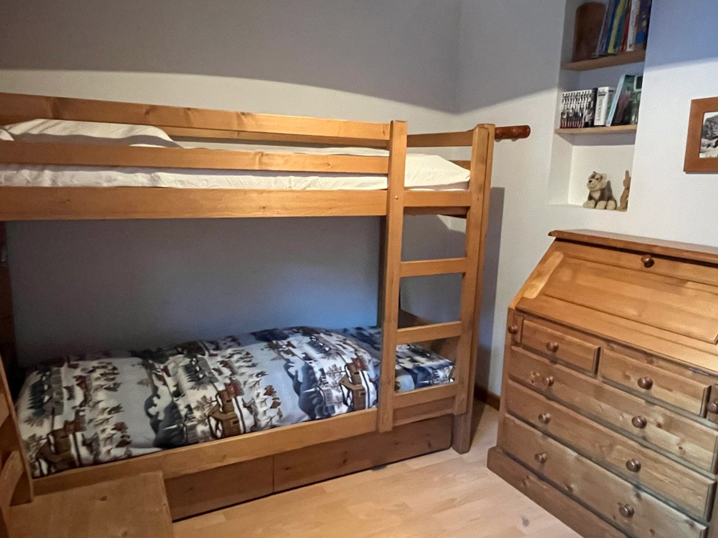 - Bedroom 1 (8.77m², 1 window, north-facing, view: mountains, parking): 2 bunk beds (top bunk not suitable for children under 6 years old), closet