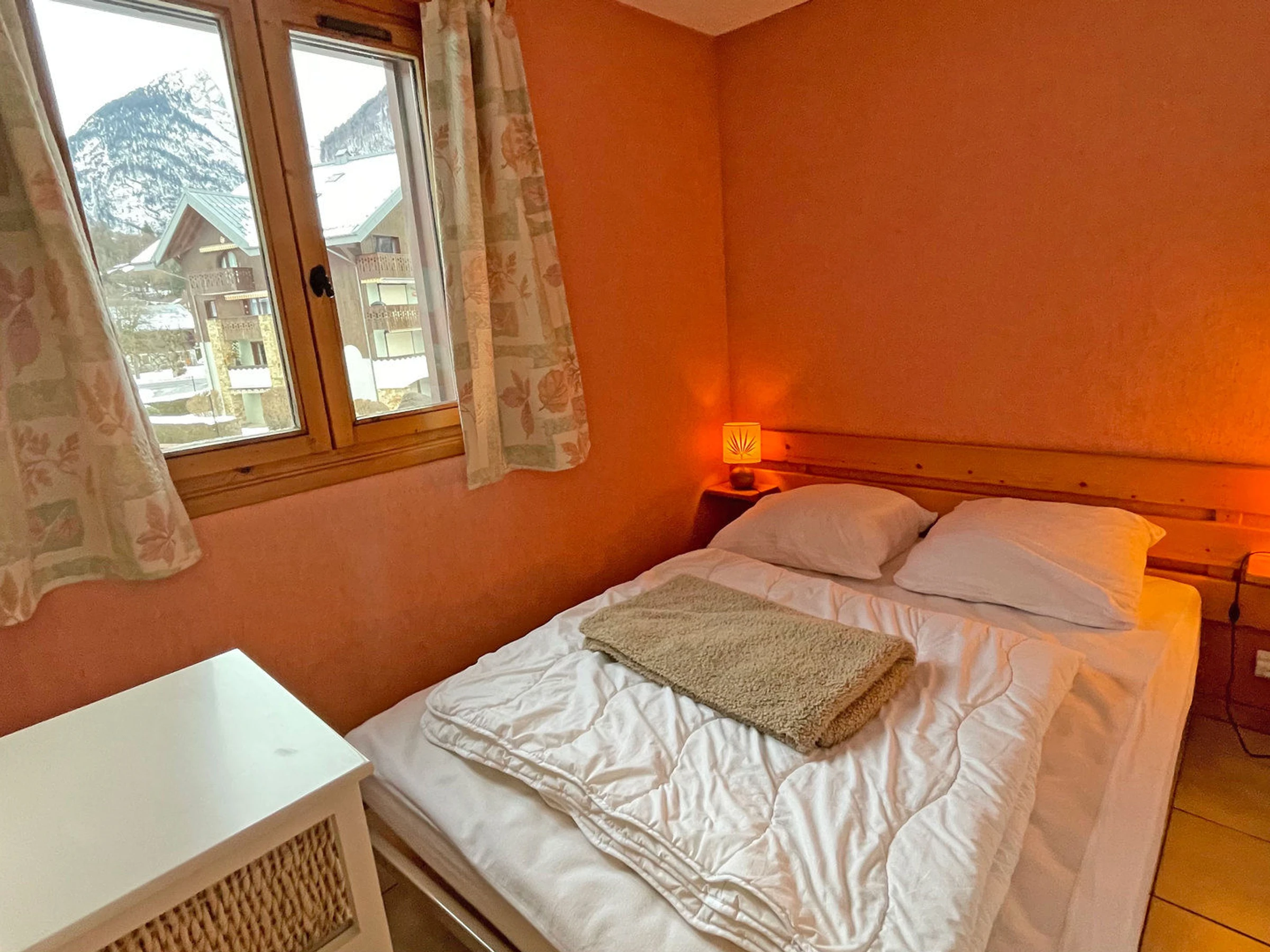 A bedroom (window, North-East, mountain/house view): 140 cm bed, chest of drawers
