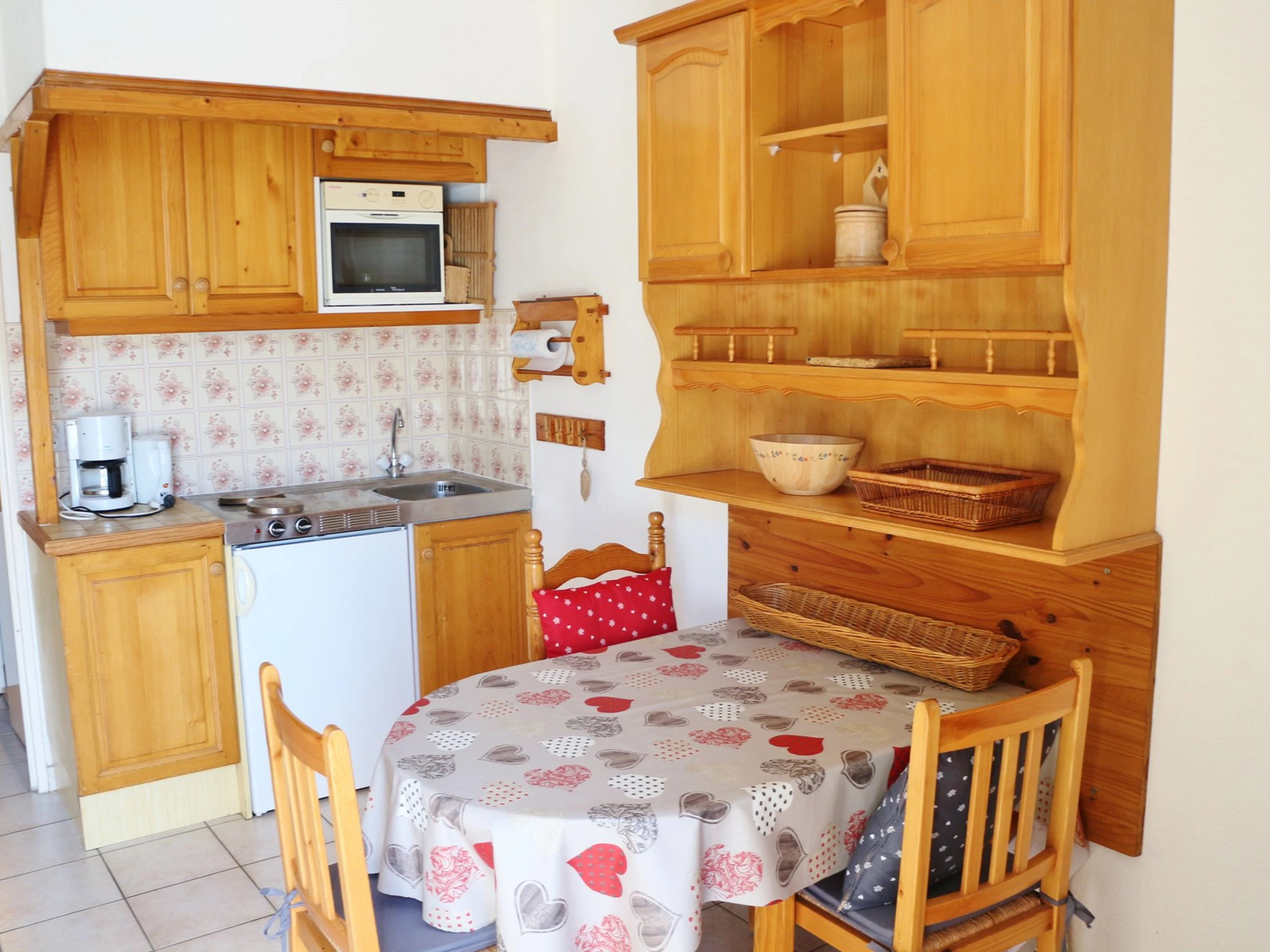It comprises an entrance alcove (with two single bunk beds), a bathroom, a separate toilet, and a living/dining room with a kitchenette (with a double sofa bed) opening onto a lovely balcony.