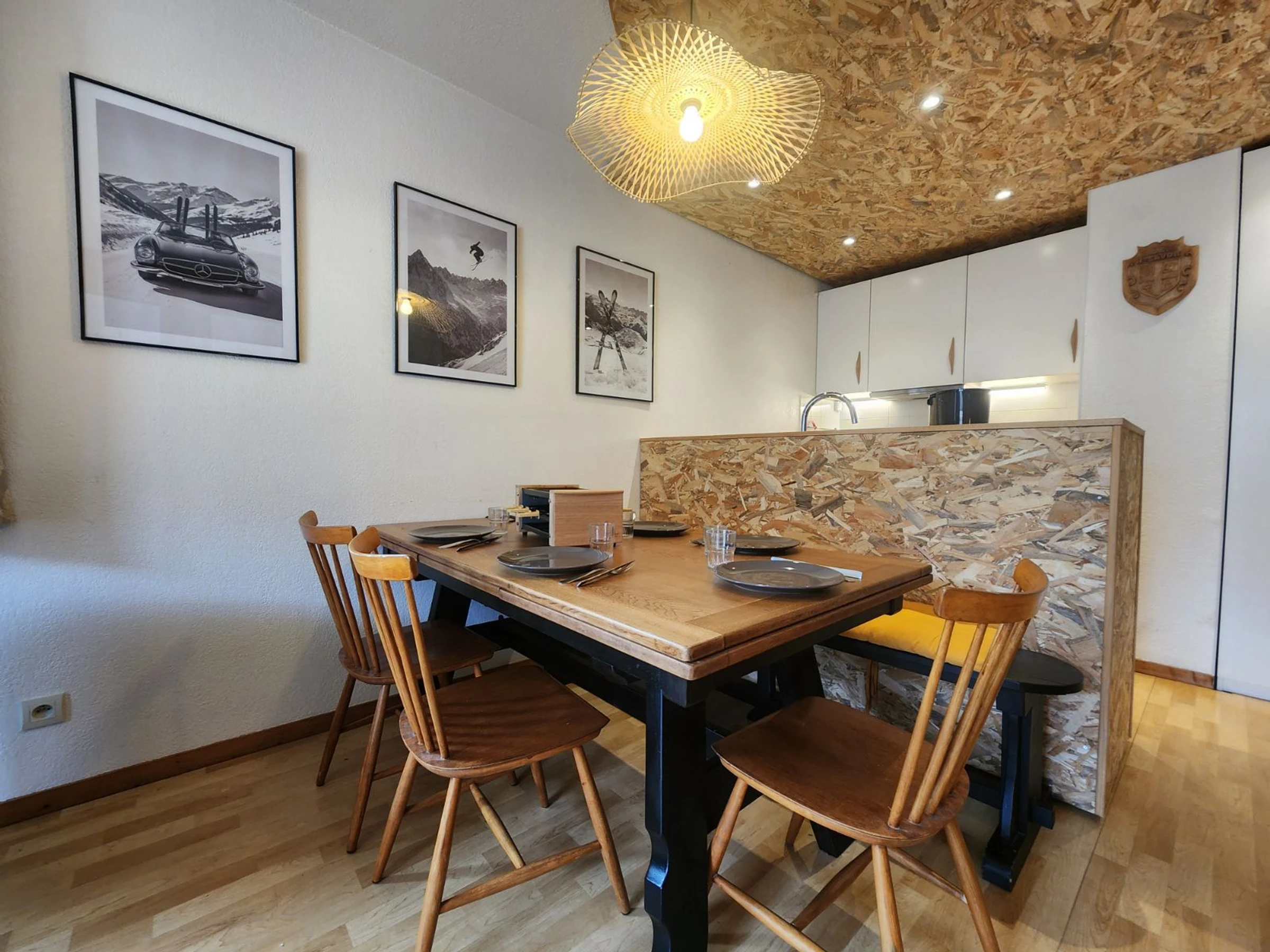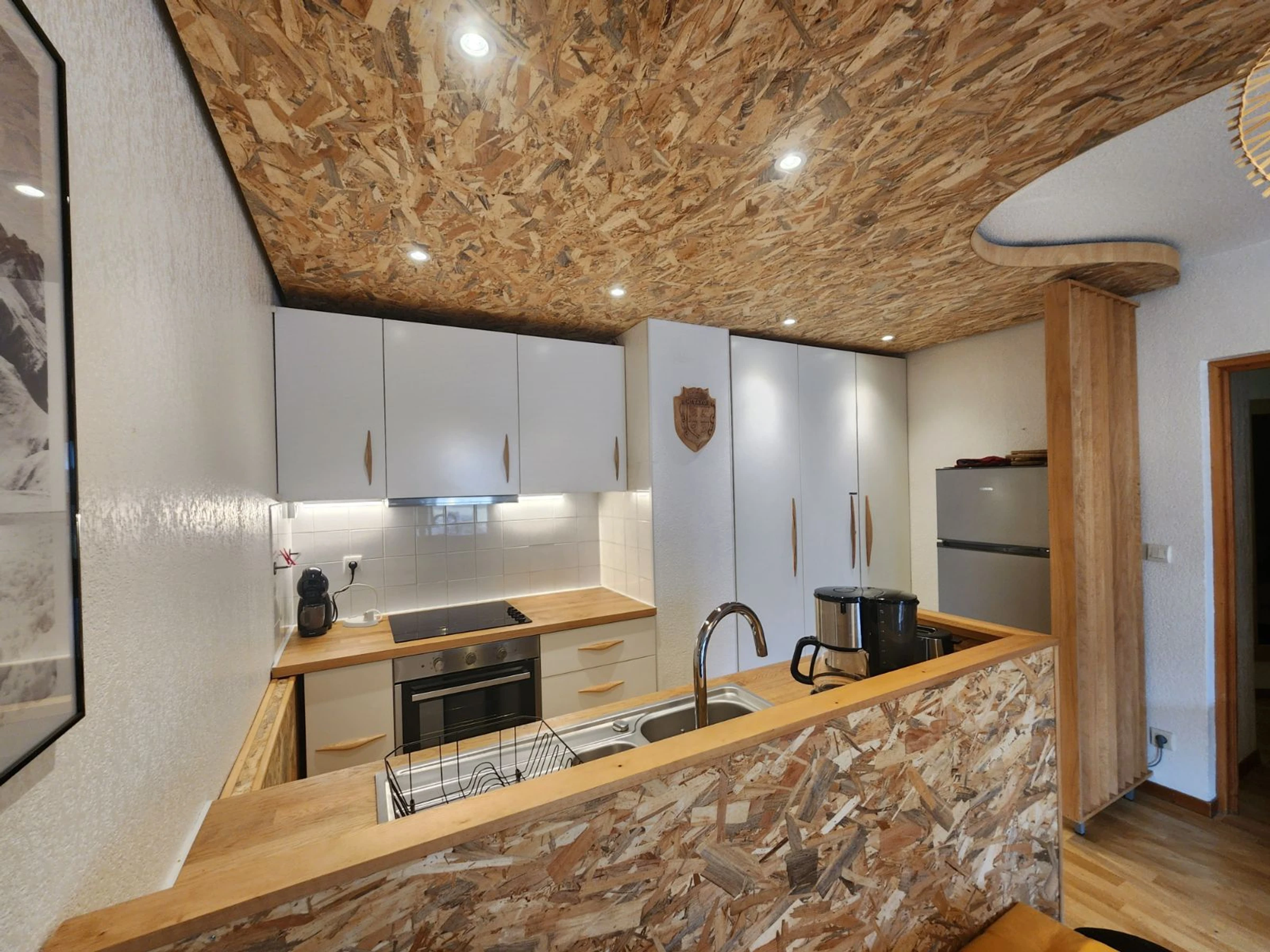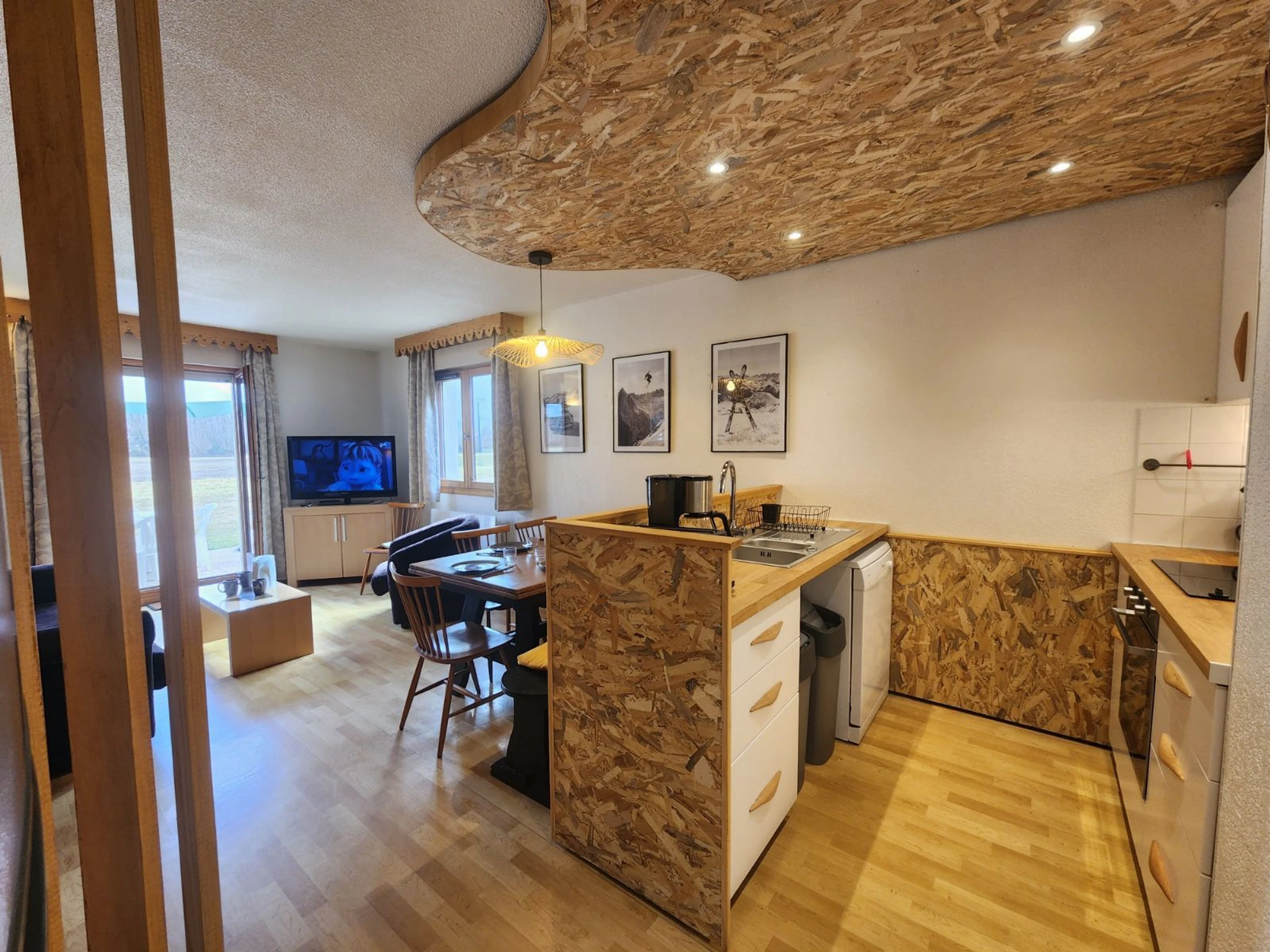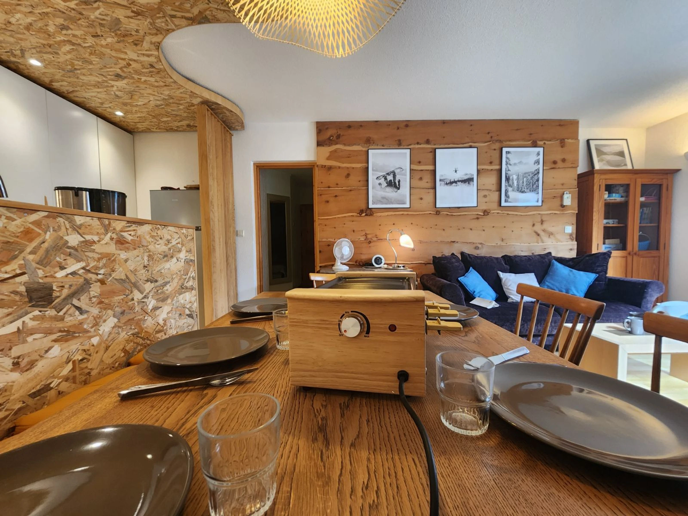 - An equipped kitchen area: microwave, dishwasher, refrigerator (130L), hood and hob, raclette machine