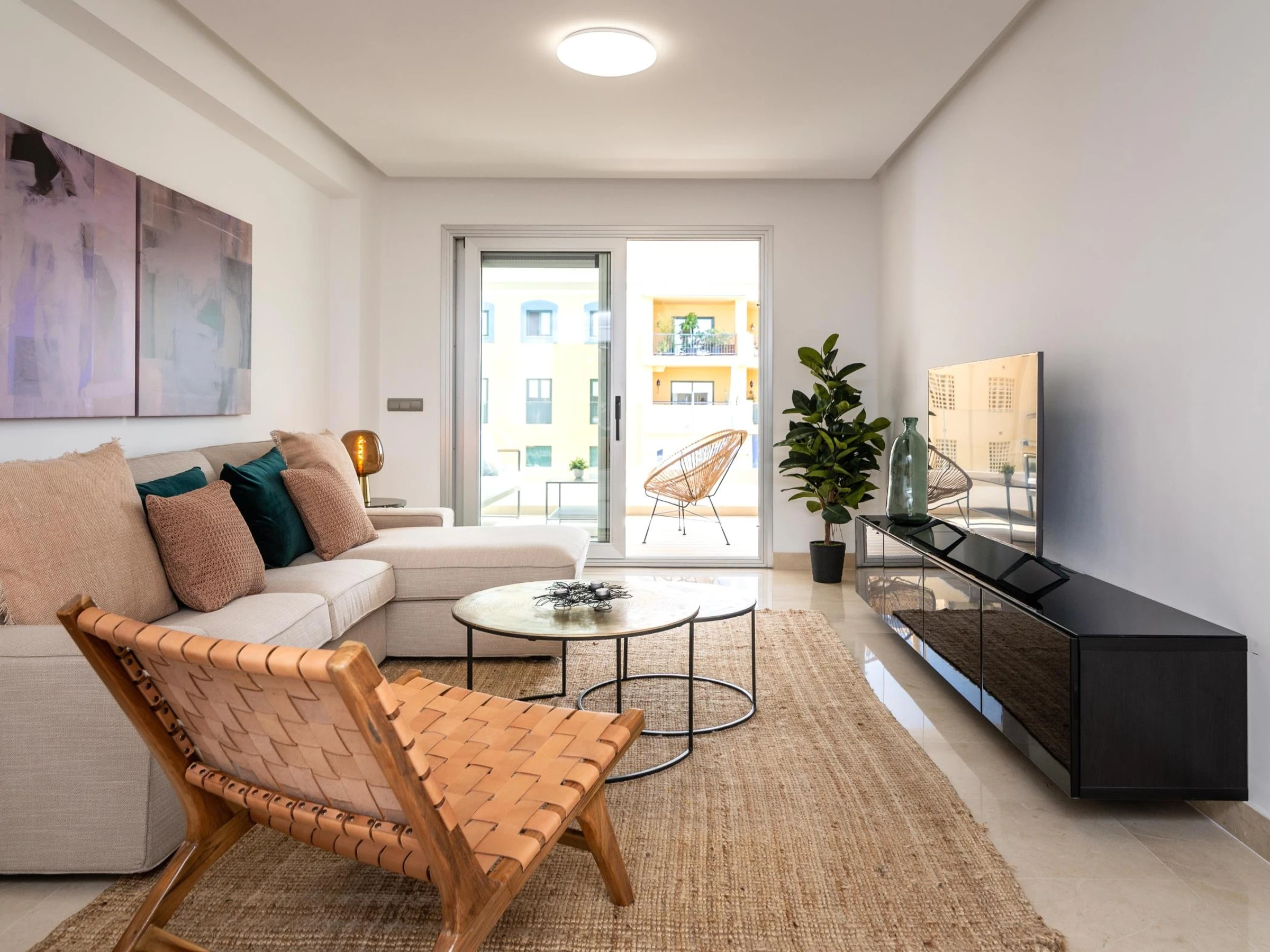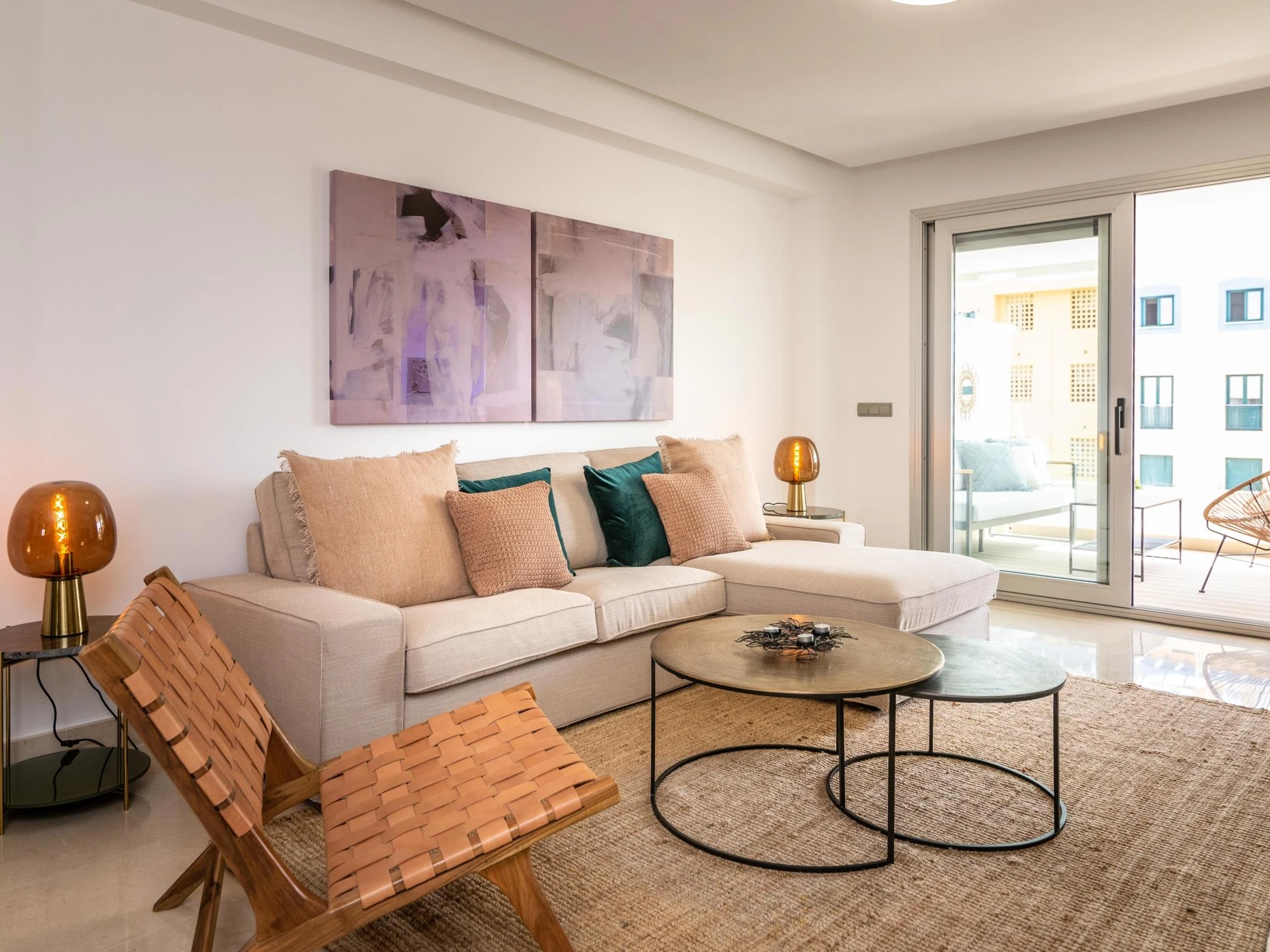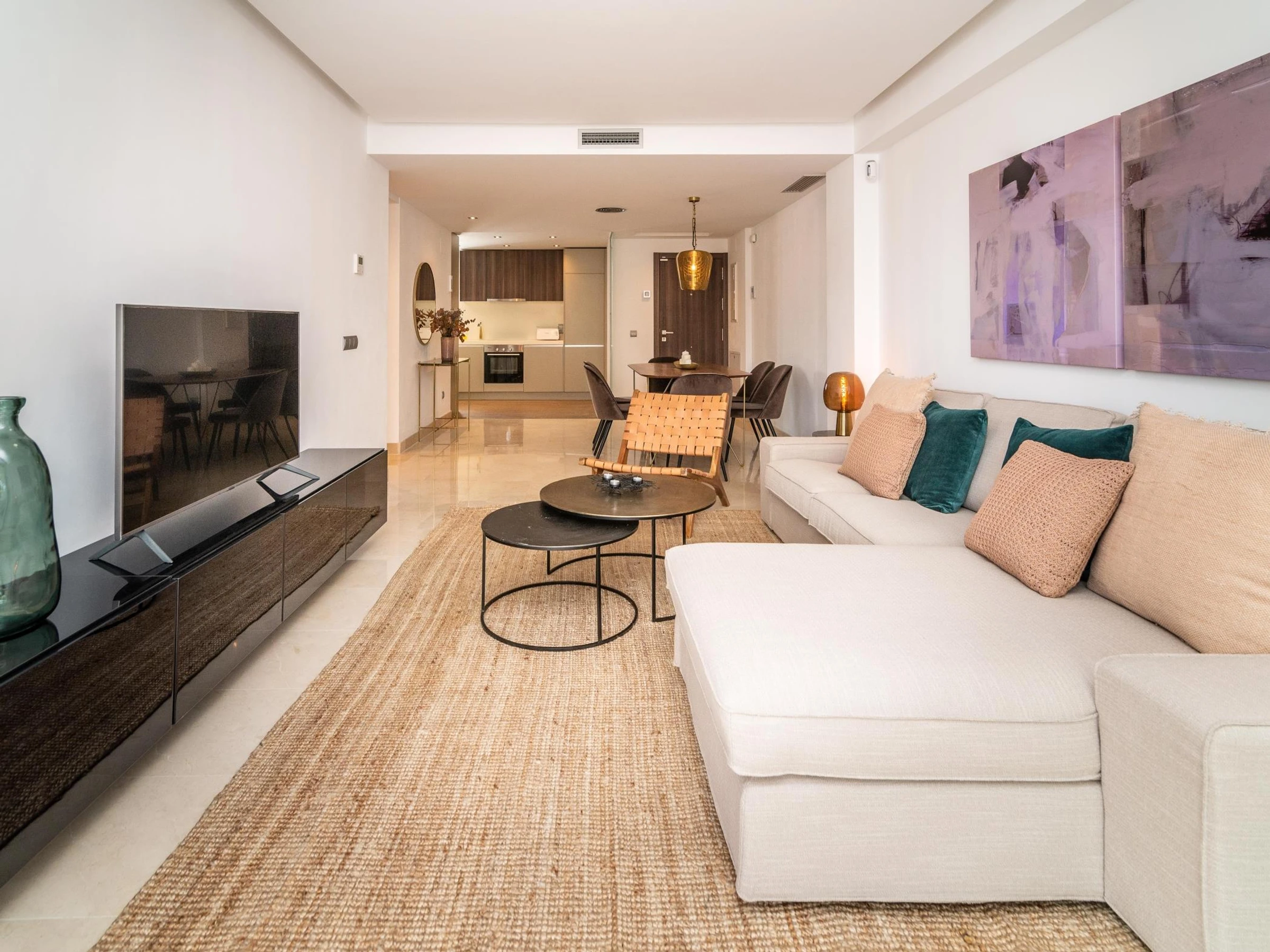 With state-of-the-art décorbased on perfectly combined neutral tones and vibrant desert colours along, its interior design is halfway between bohemian and tropical. Wide windows and clean-lined furnishing keep the whole living area bright in natural light.