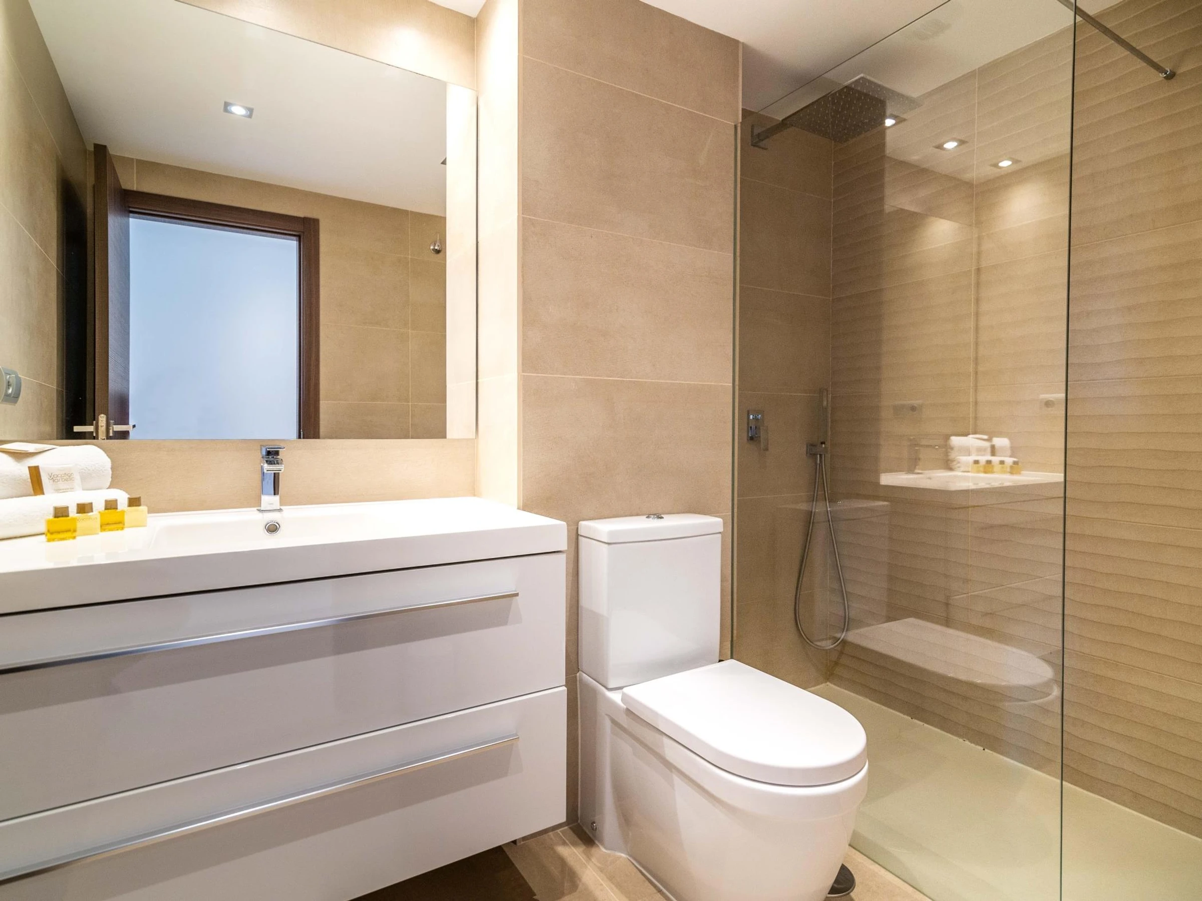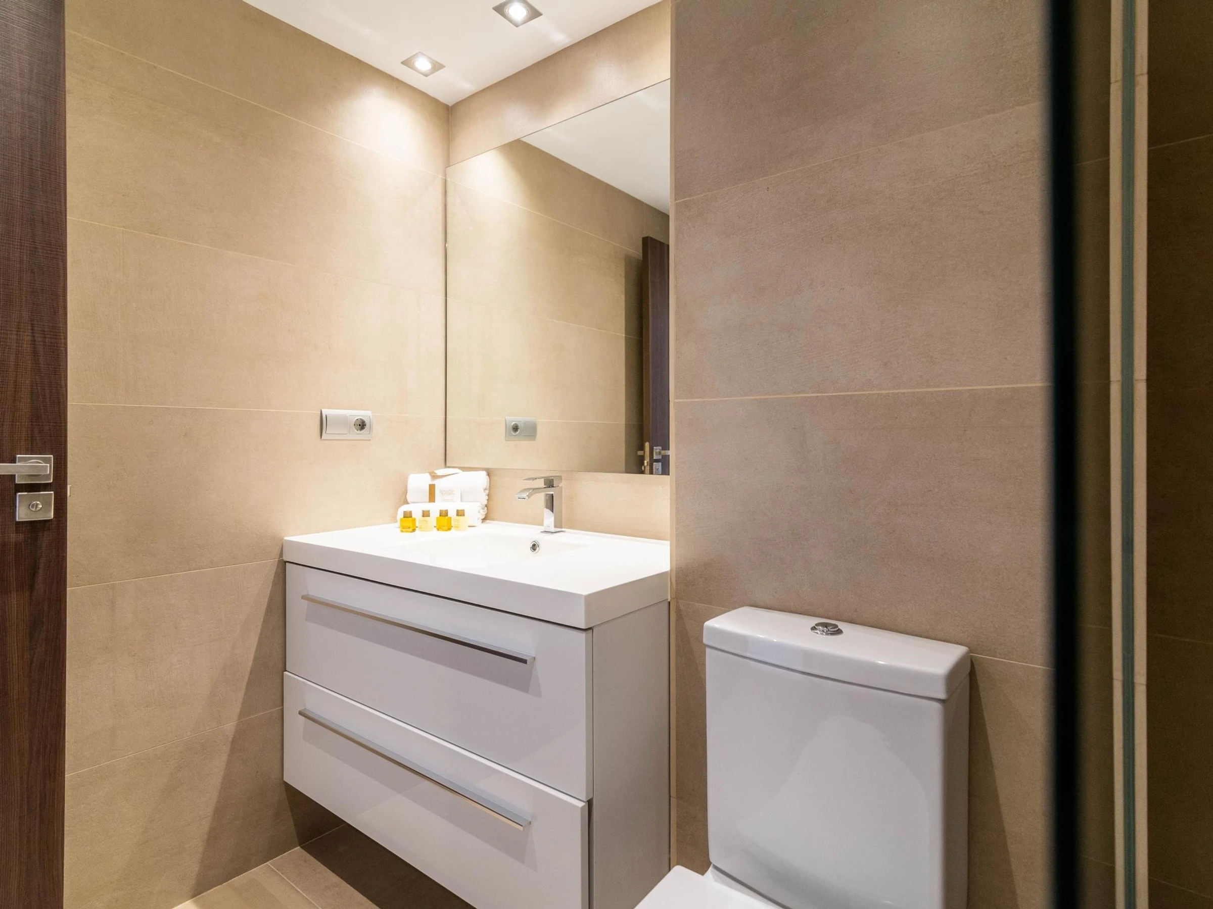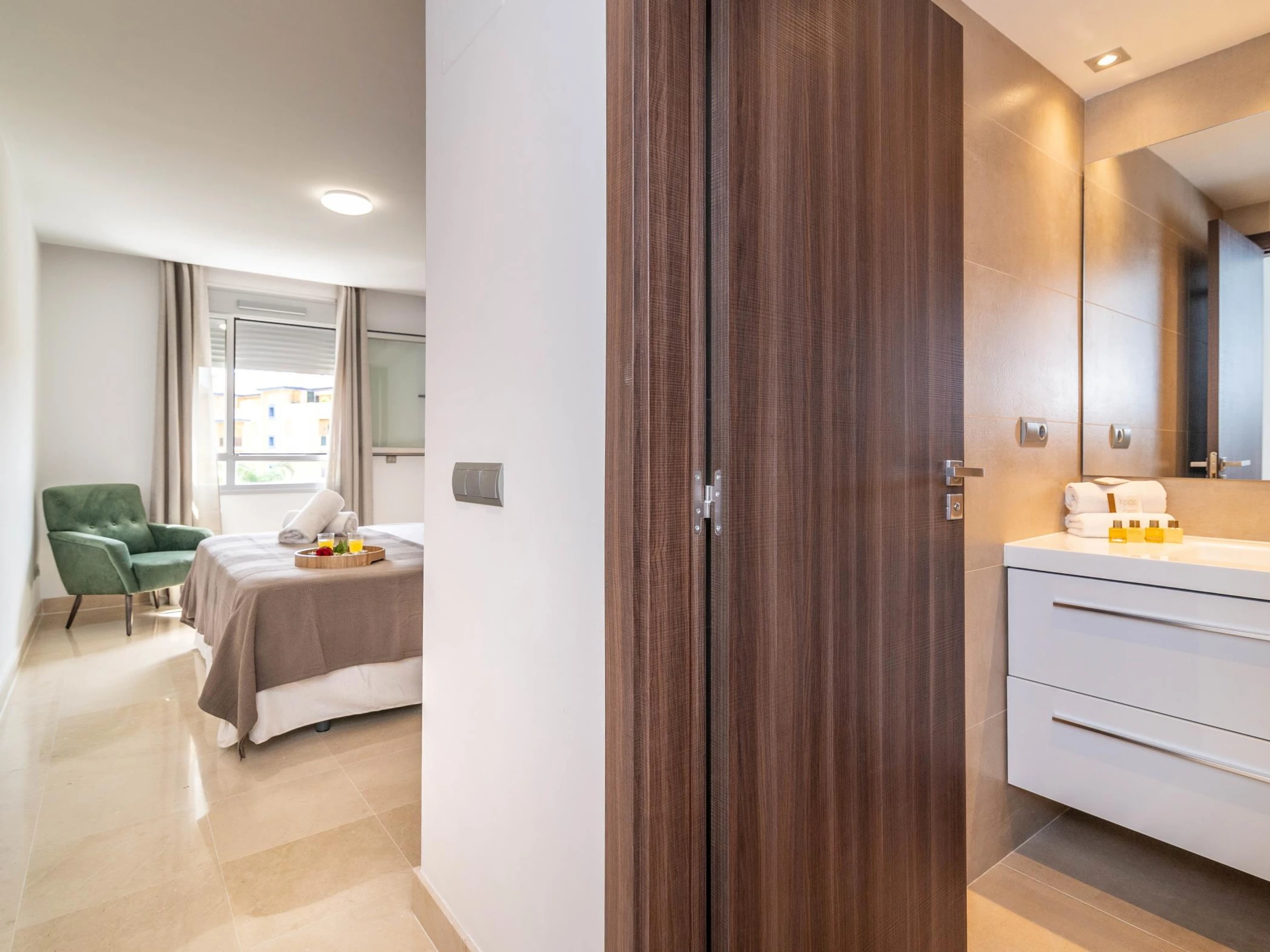 Welcome package with some amenities, water, and a bottle of Spanish extra-virgin olive oil.