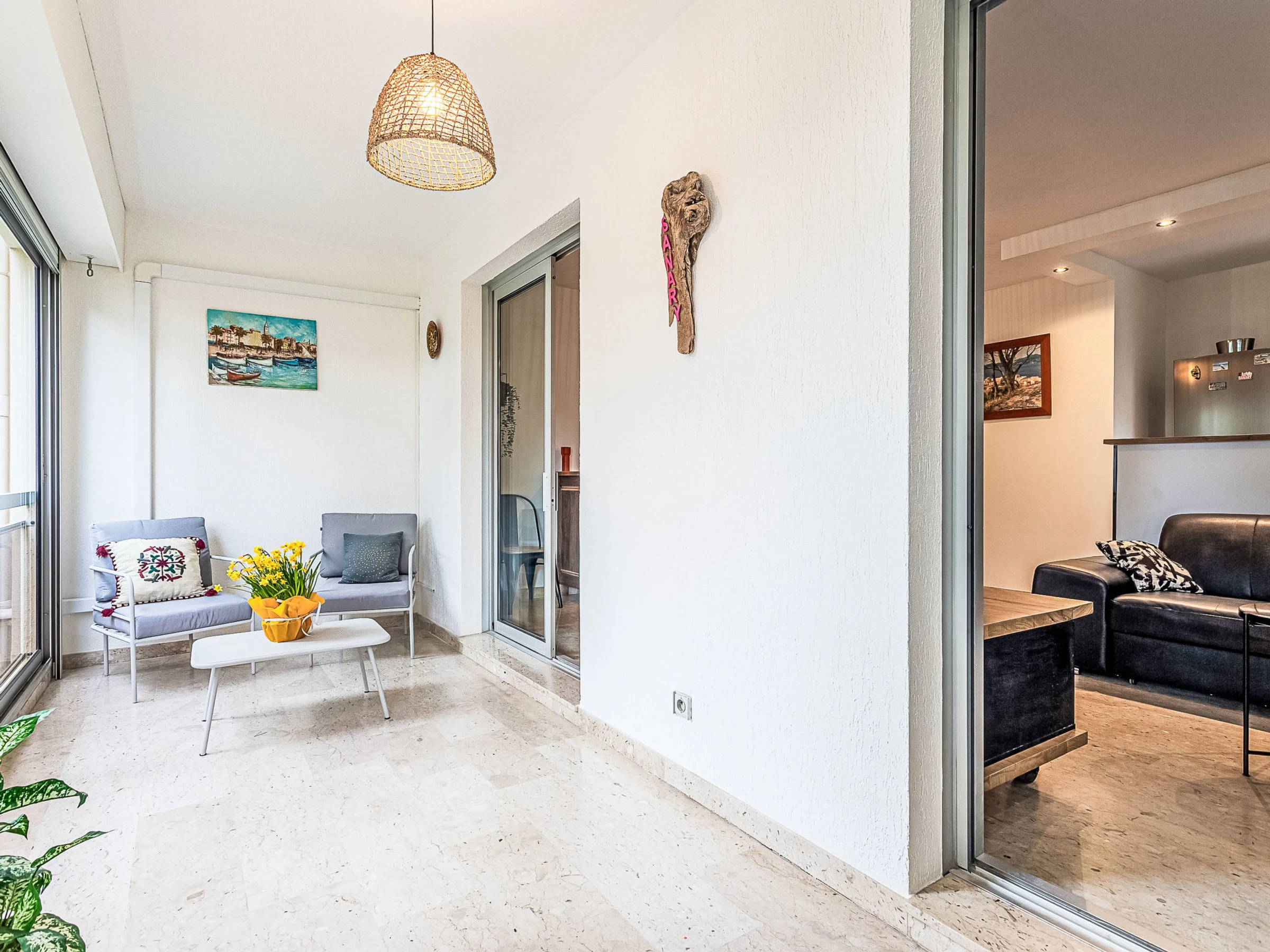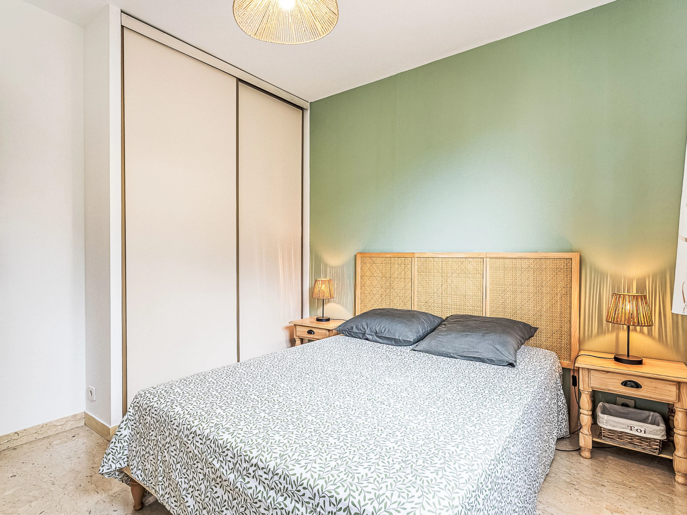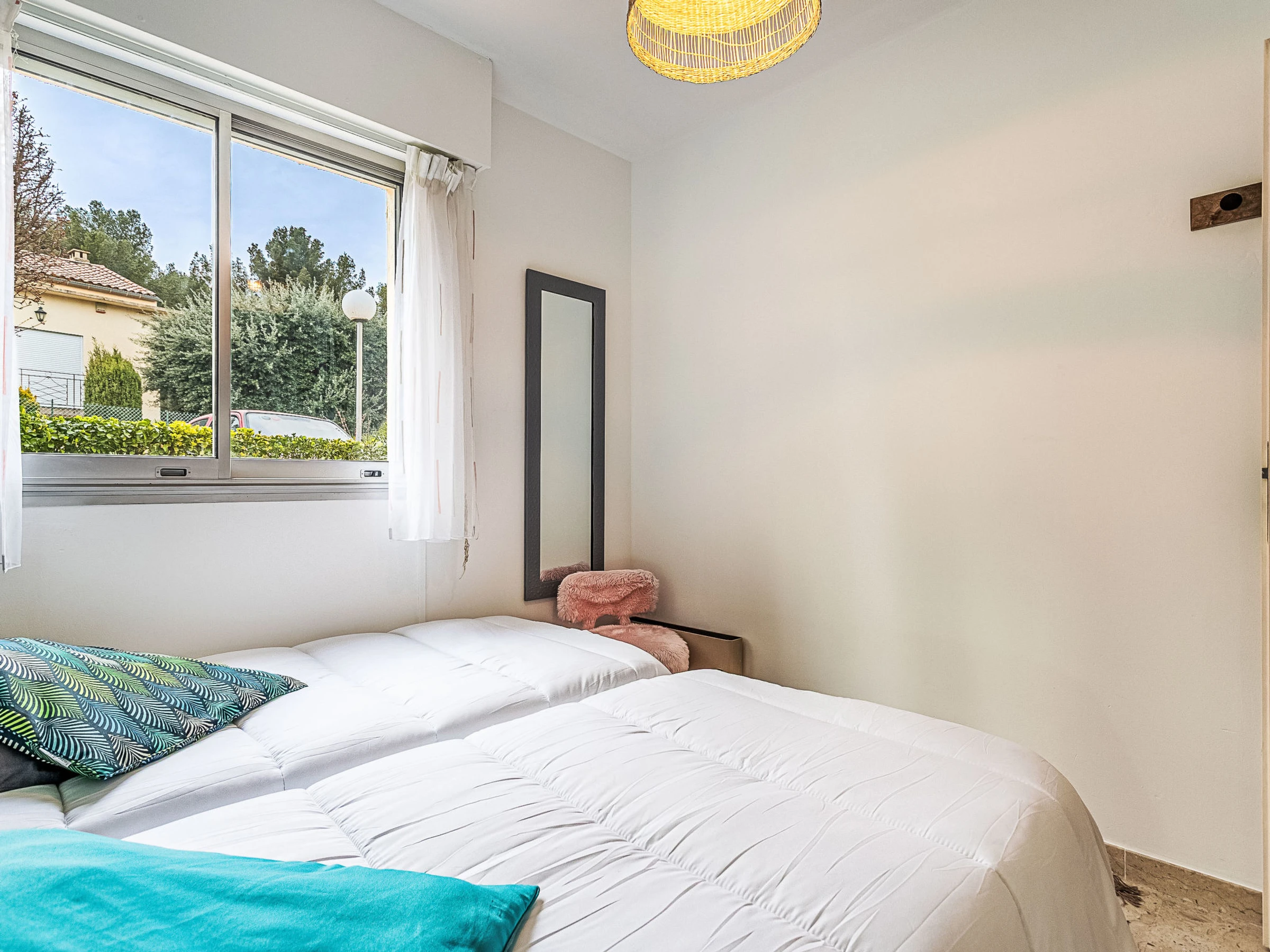 3-room apartment 60 m2, on the upper ground floor. Bright, beautiful furnishings: living/dining room with veranda with 1 sofabed (140 cm, length 190 cm), TV (flat screen), air conditioning. Exit to the veranda. 1 room with 1 french bed (140 cm, length 190 cm), TV (flat screen), fan. 1 room with 2 beds (90 cm, length 190 cm), fan. Kitchen (3 hot plates, oven, dishwasher, toaster, kettle, microwave, freezer, electric coffee machine). Shower, sep. WC. Air-conditioning. Terrace 10 m2, roofed, south facing position and west facing position. Terrace furniture. Facilities: washing machine, iron. Internet (WiFi, free). Parking (1 car). Please note: TV only FR. Smoke alarm, no lift. Offer by a private individual according to Art. 155, IV of CGI. [hidden]