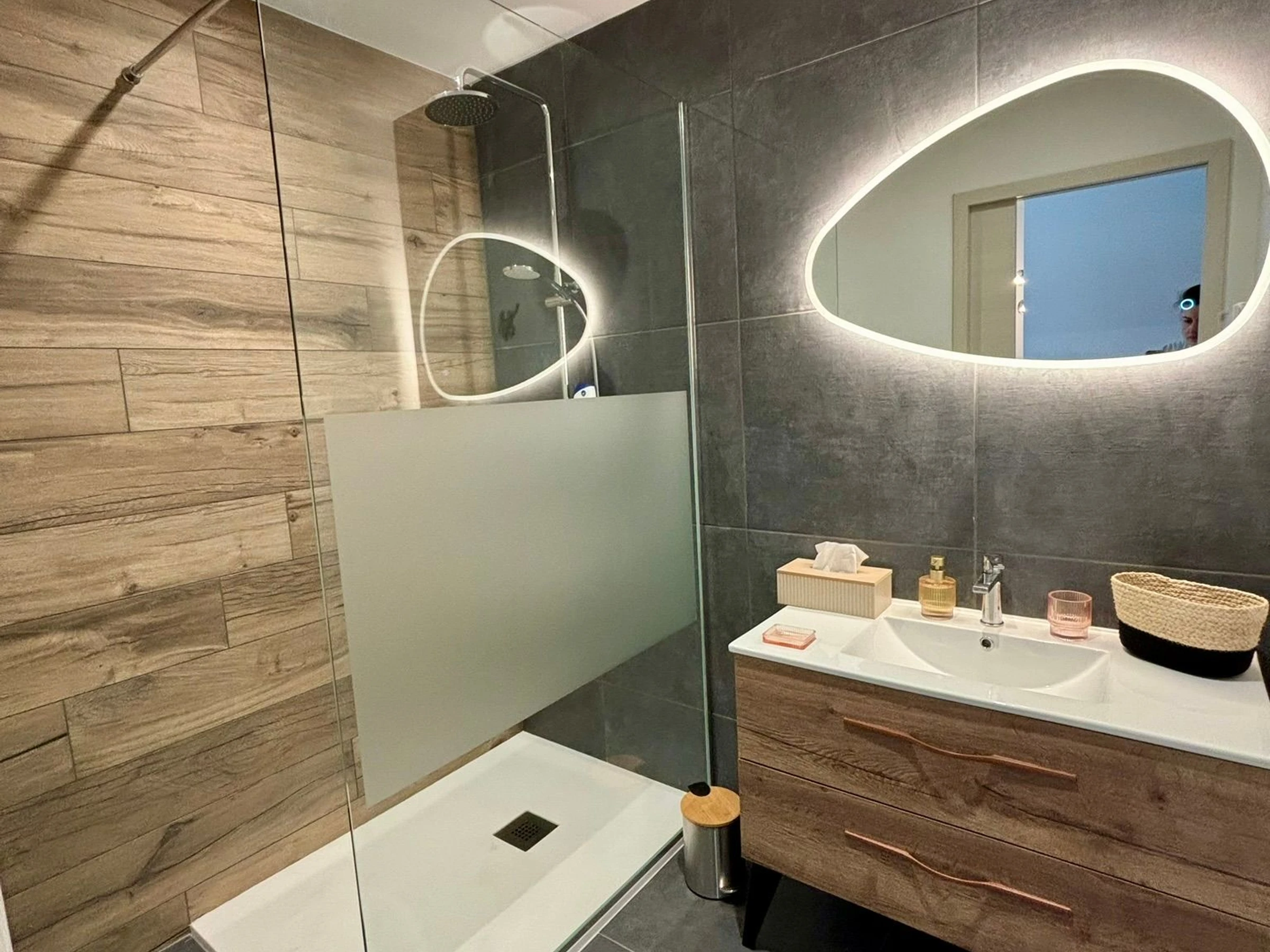 - Living room with fully equipped open-plan kitchen, relaxation area with TV and Bluetooth speaker