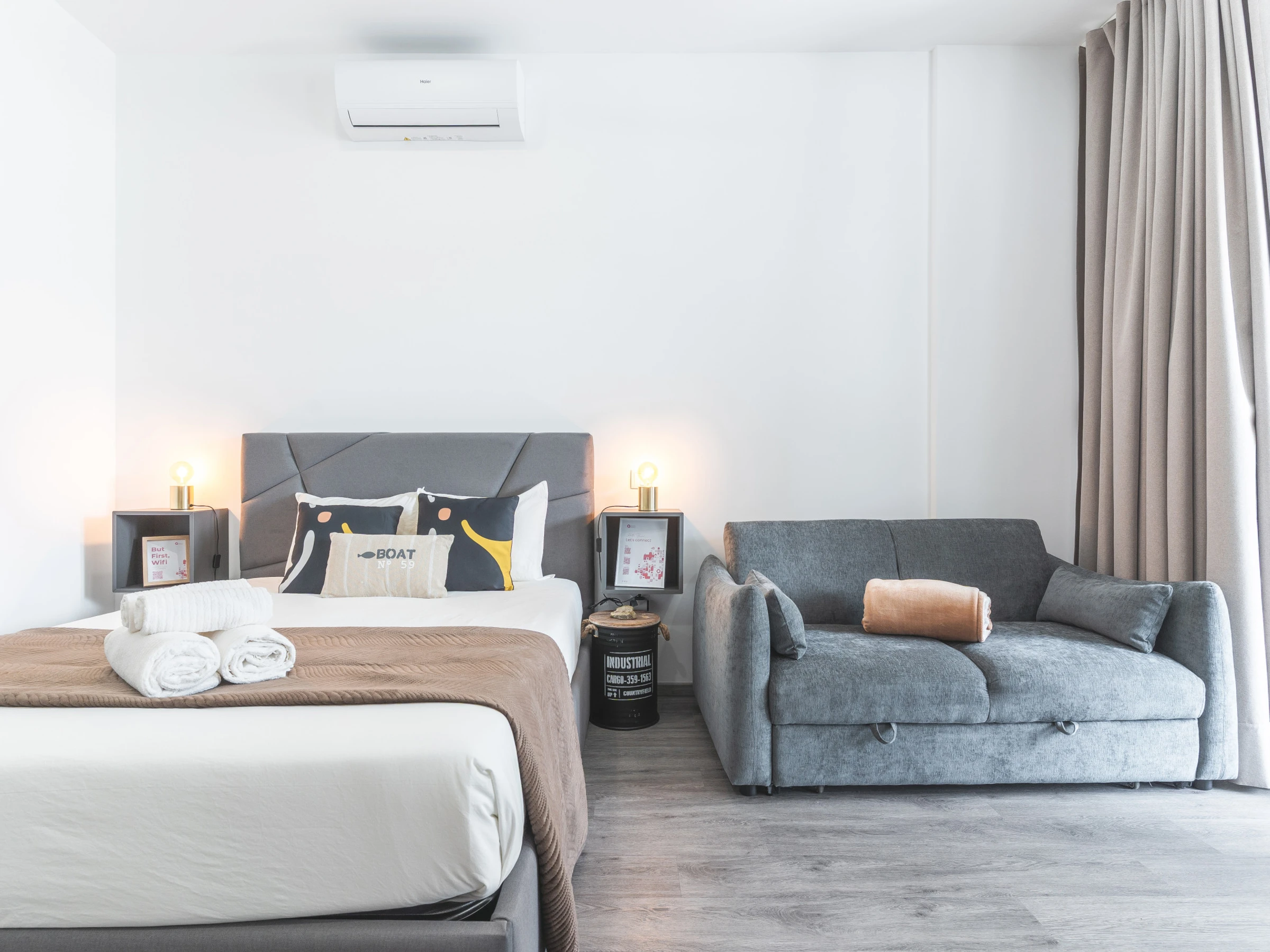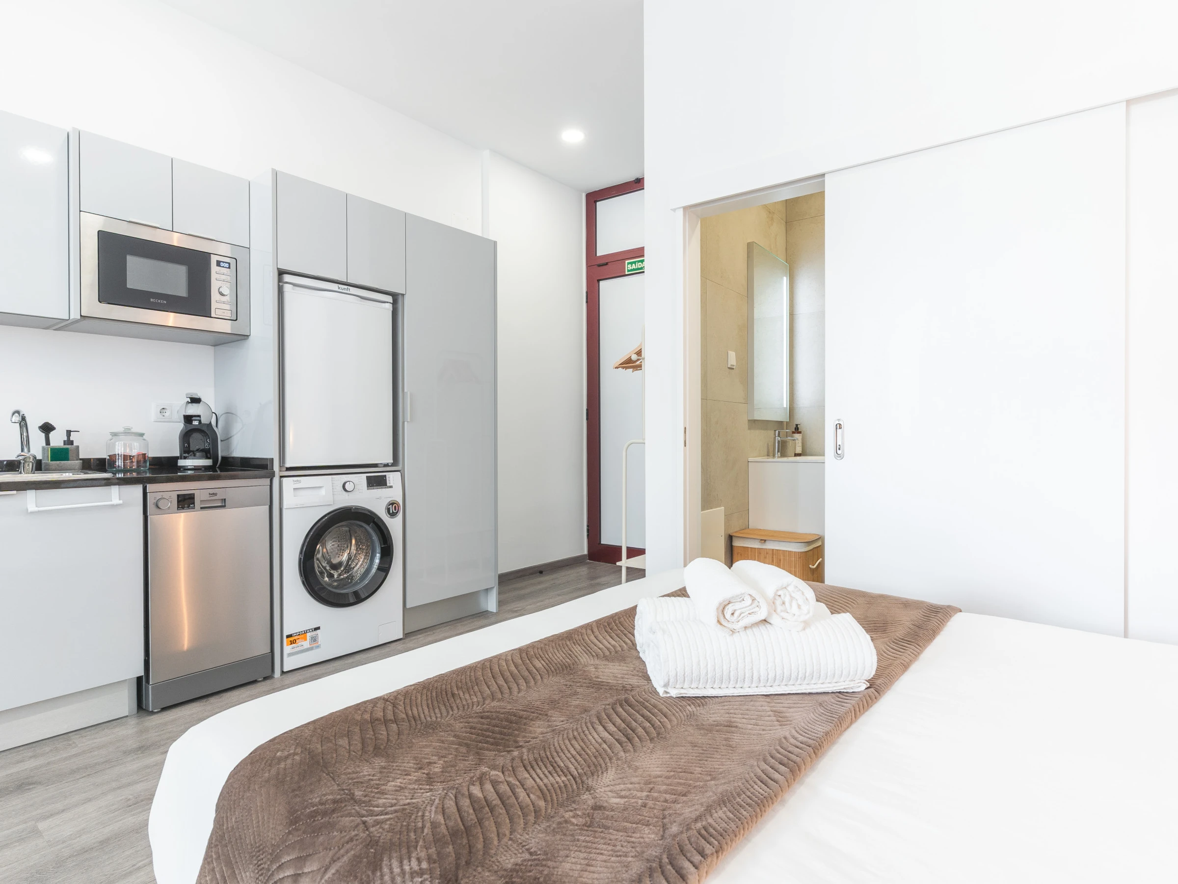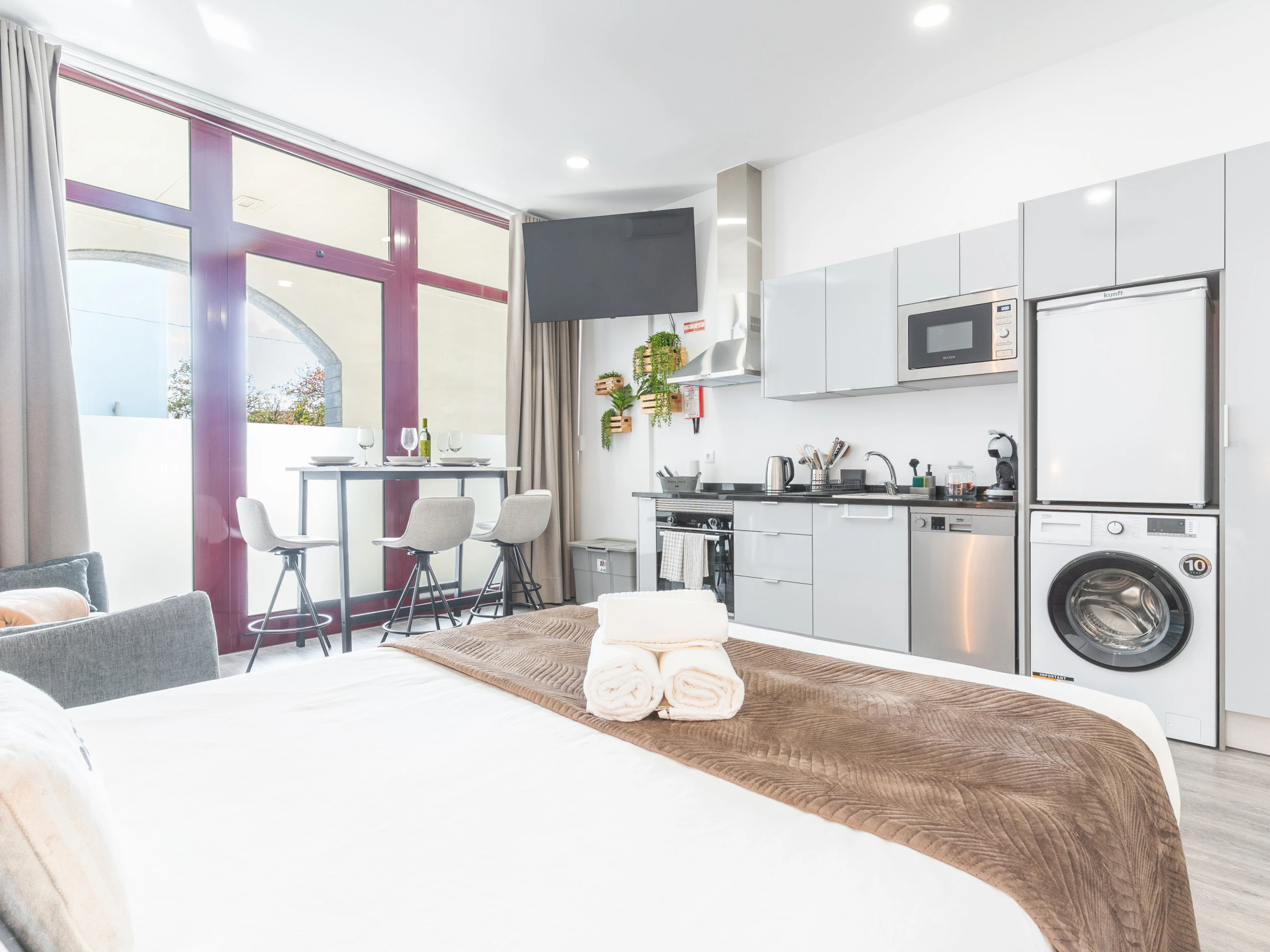 The open-plan studio accommodates up to three guests and features a queen bed along with a sofa bed suitable for two. The living area integrates smoothly with a fully equipped kitchen, which includes a fridge, freezer, oven, microwave, hob and all essential utensils needed for preparing meals. The property also offers a bathroom with a shower, a washing machine, a hairdryer and a Smart TV with a box for entertainment. Families benefit from the availability of a baby cot and a high chair.
