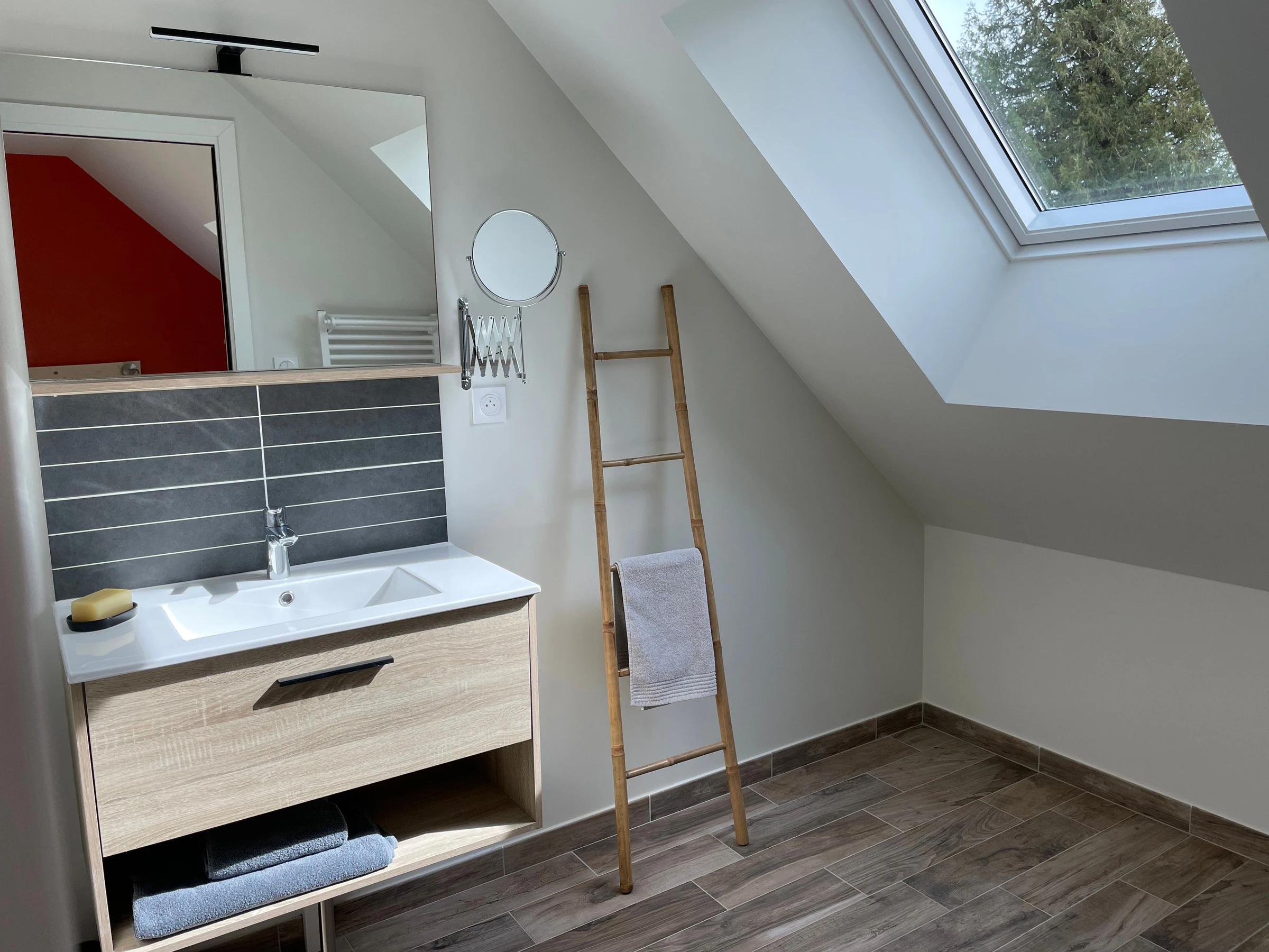 For added decor and as a reminder of the site's history, we have preserved some elements of the past in the grounds (antique cart, apple press, and benches reconstructed from old timber beams, etc.). A large bedroom on the ground floor has its own private accessible bathroom. Large living room and terrace on the ground floor