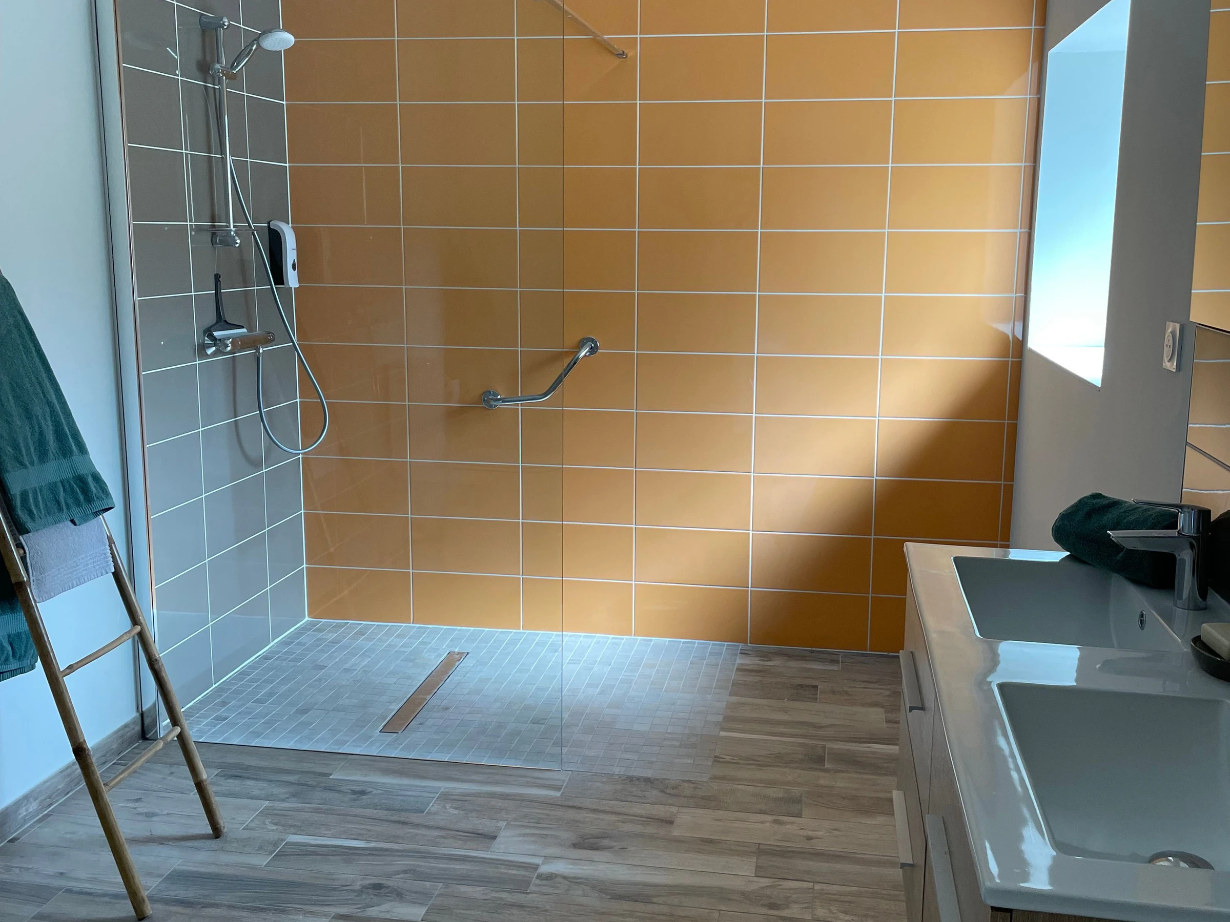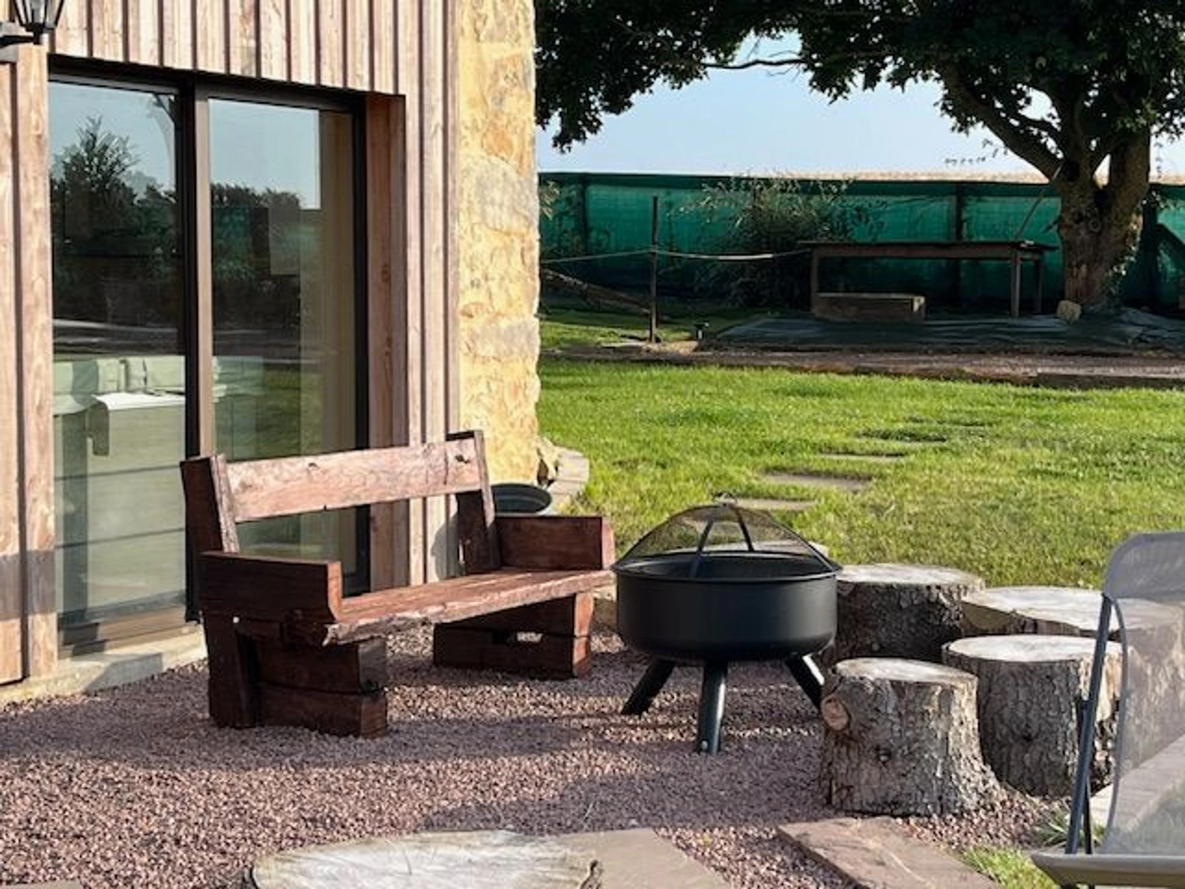 To enhance the ambiance and evoke the site's historical character, we have preserved some historical elements in the grounds (an antique cart, an apple press, and benches reconstructed using the original beams, etc.). A large ground-floor bedroom with its own private bathroom is also available. Large living room and ground-floor terrace
