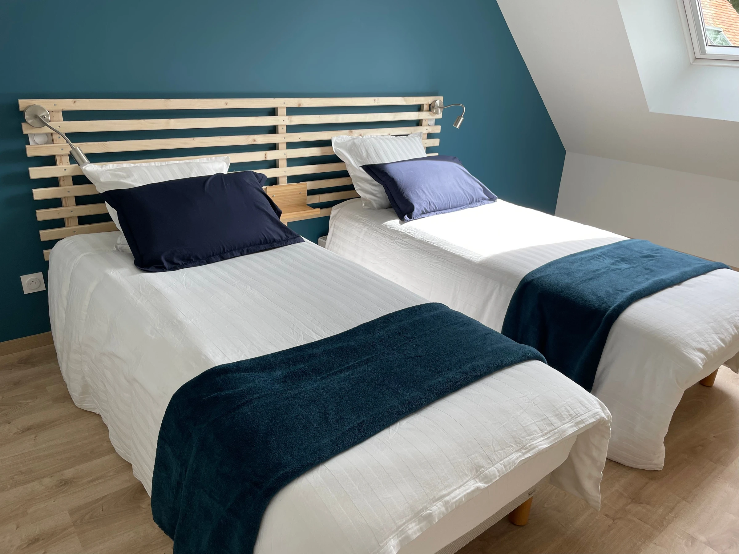 One bedroom with two single beds (90cm) and an en-suite shower room (walk-in shower and double vanity), and an adjoining toilet.