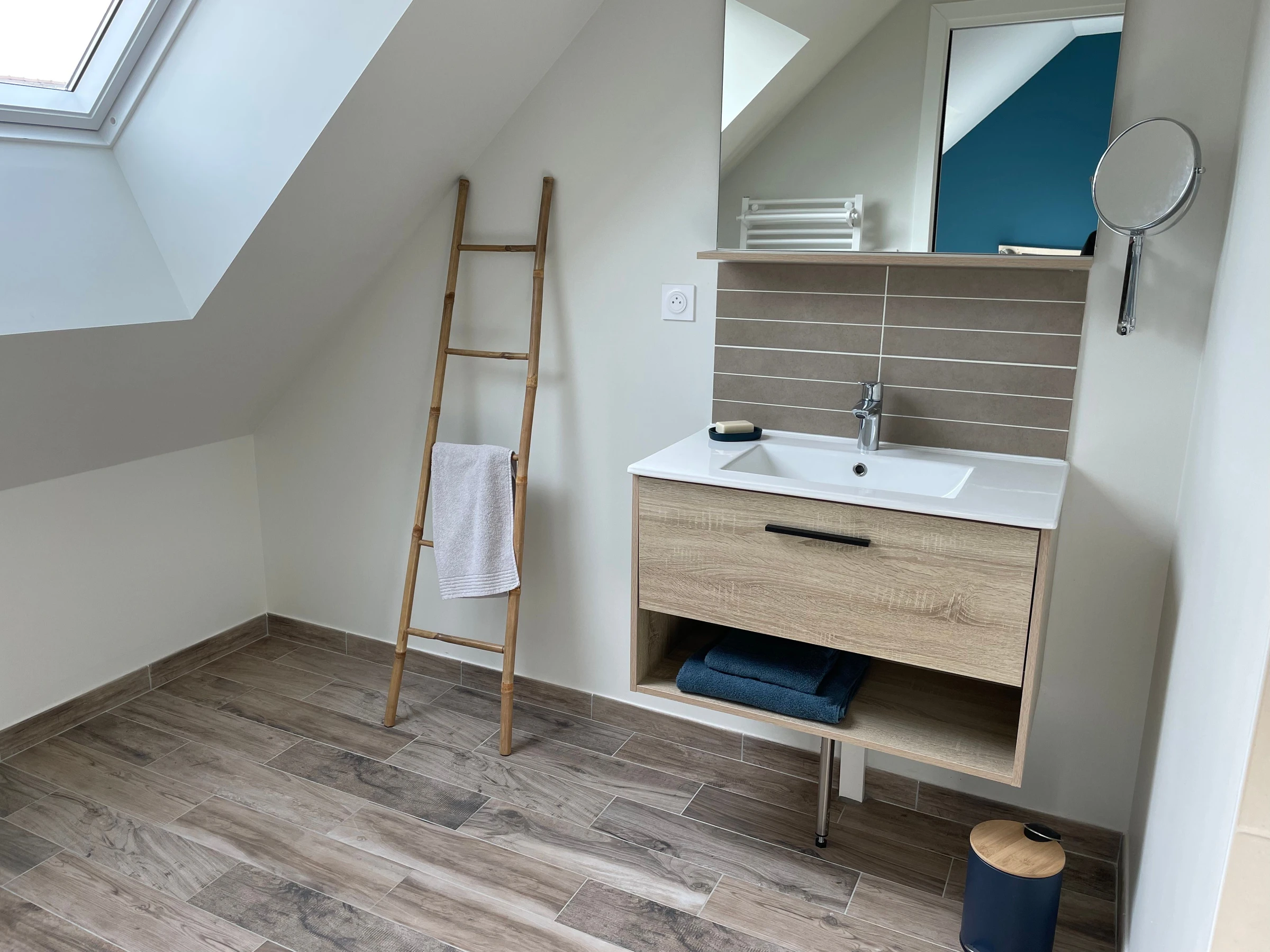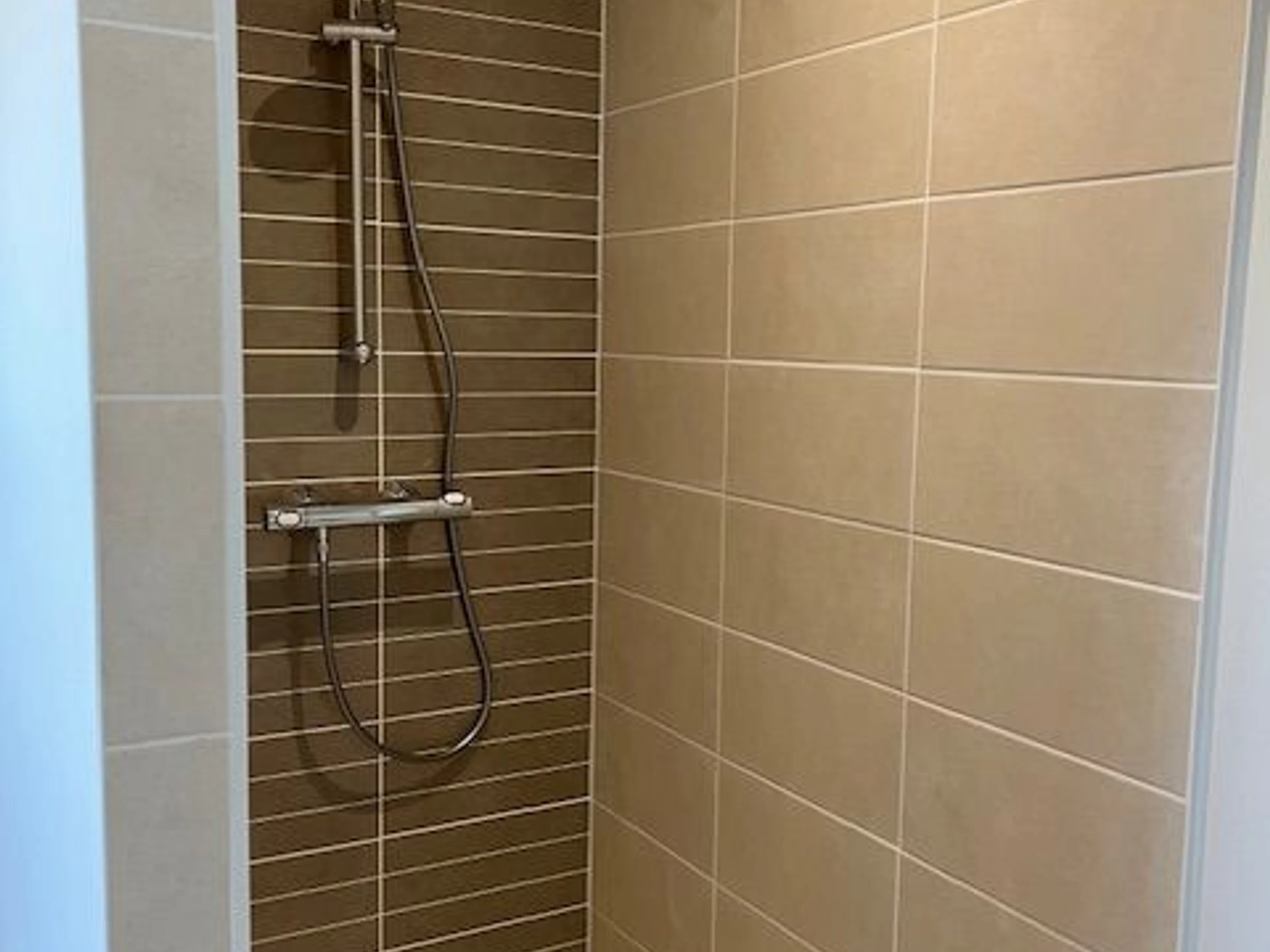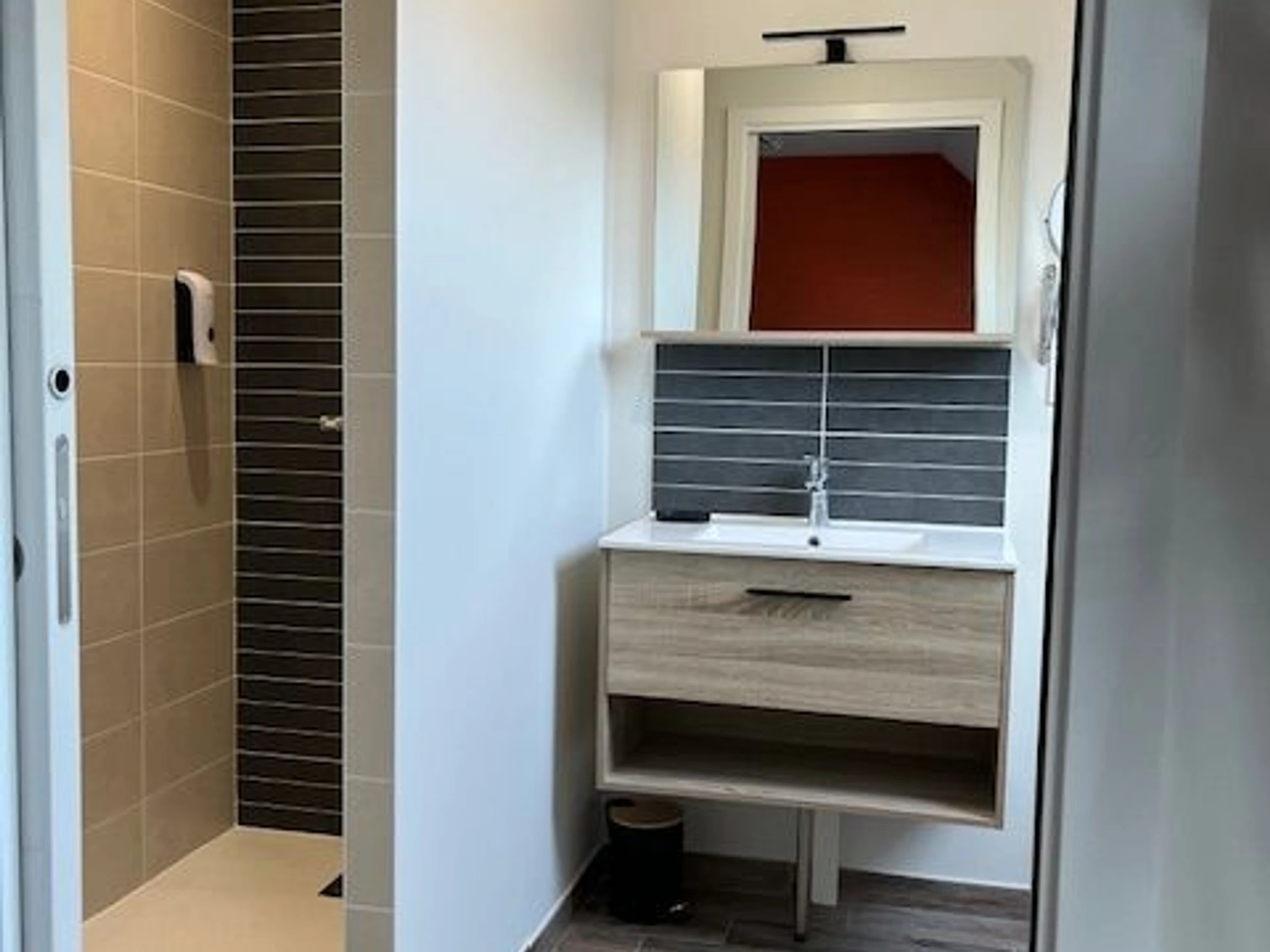 One bedroom with two single beds (90cm) and an en-suite shower room (walk-in shower and vanity) and a separate toilet.
