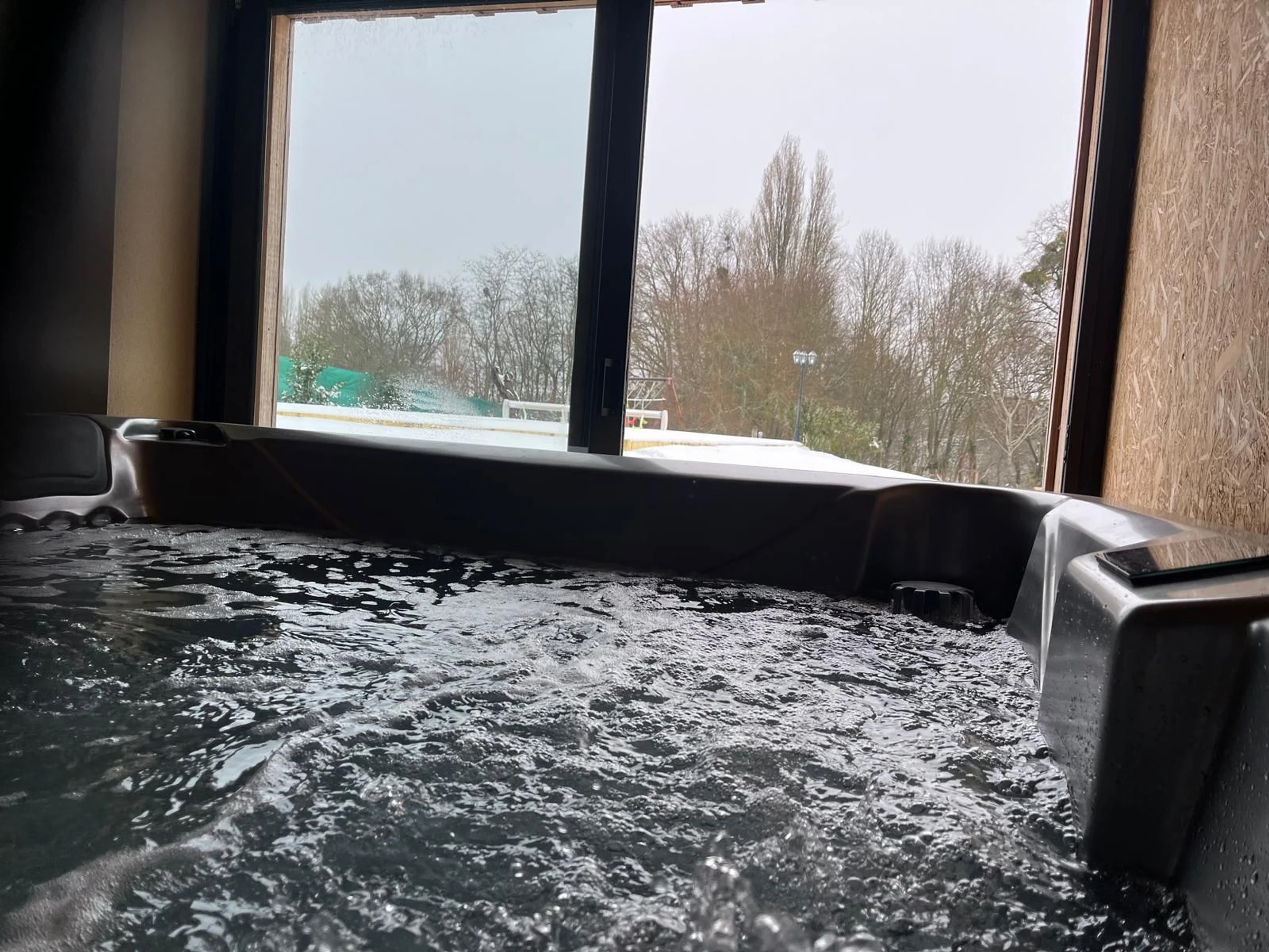 A spa is located in an adjoining room of this restored barn, offering direct views of the garden and its mature trees, and is very close to the outdoor heated swimming pool (open from late May to late September).