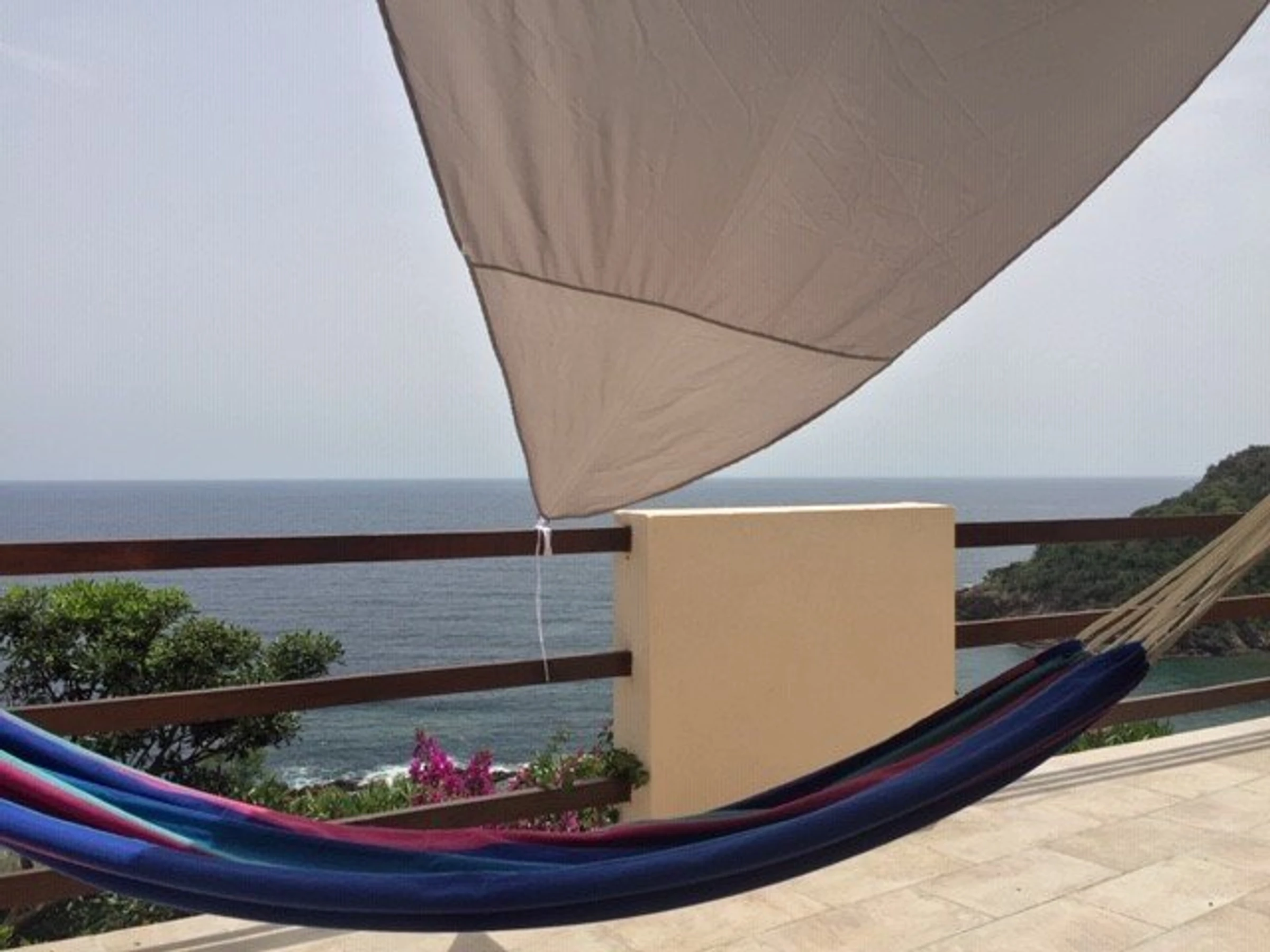 Access to semi-covered terrace with sea view: garden furniture, shade sail,