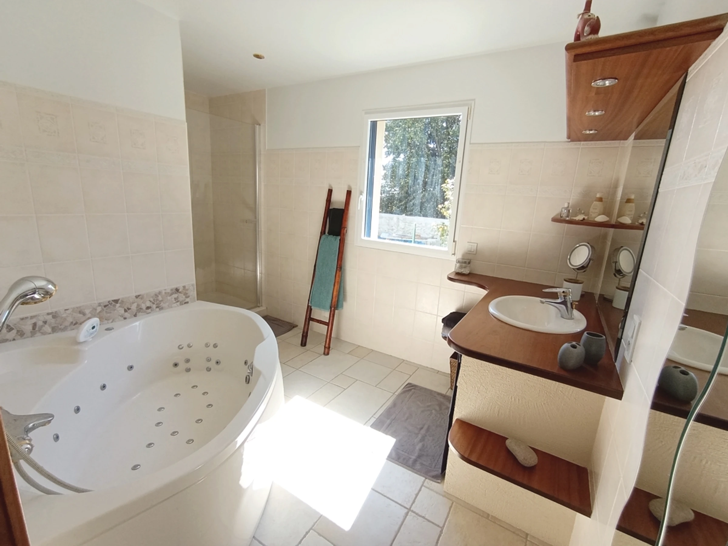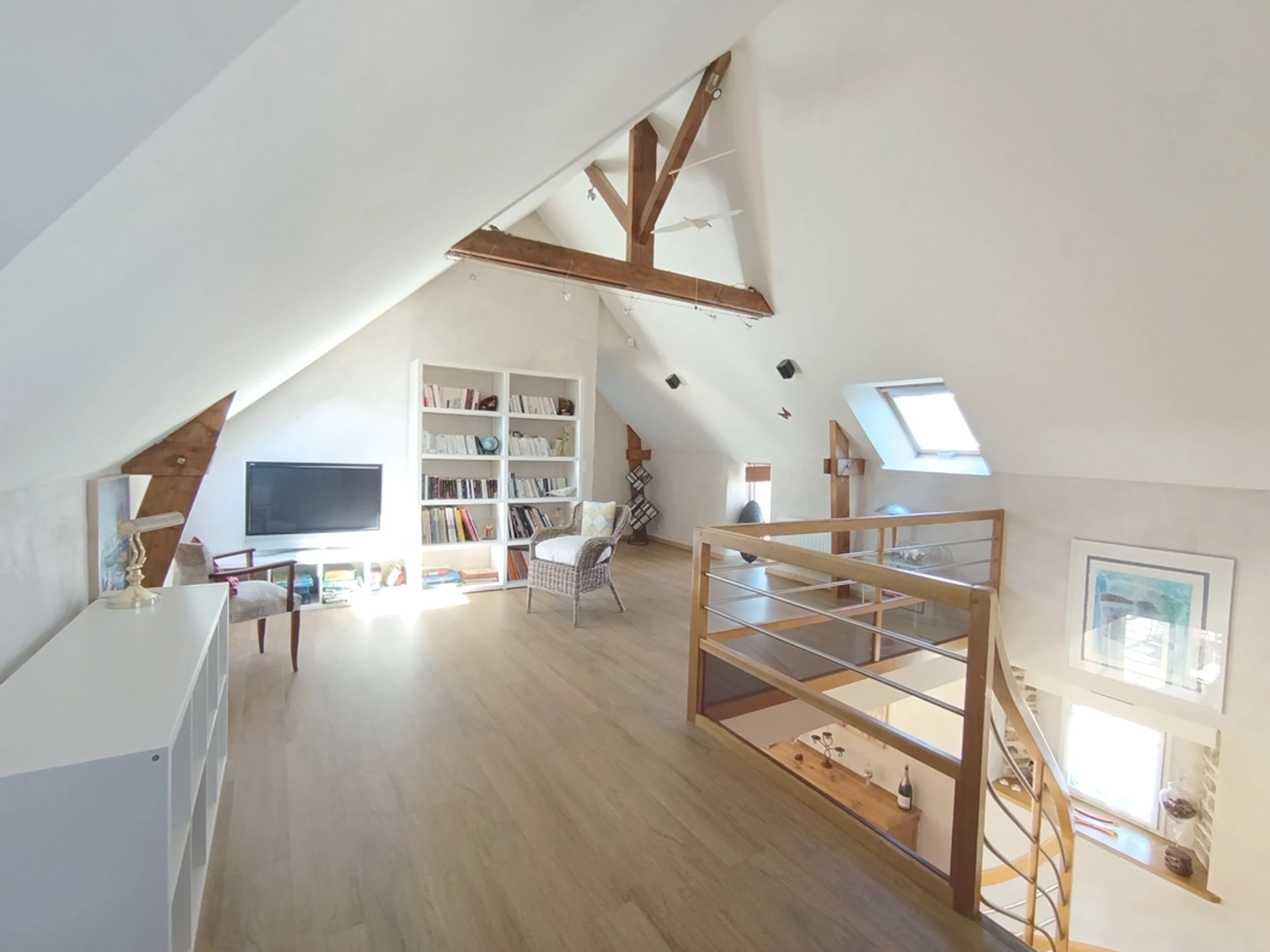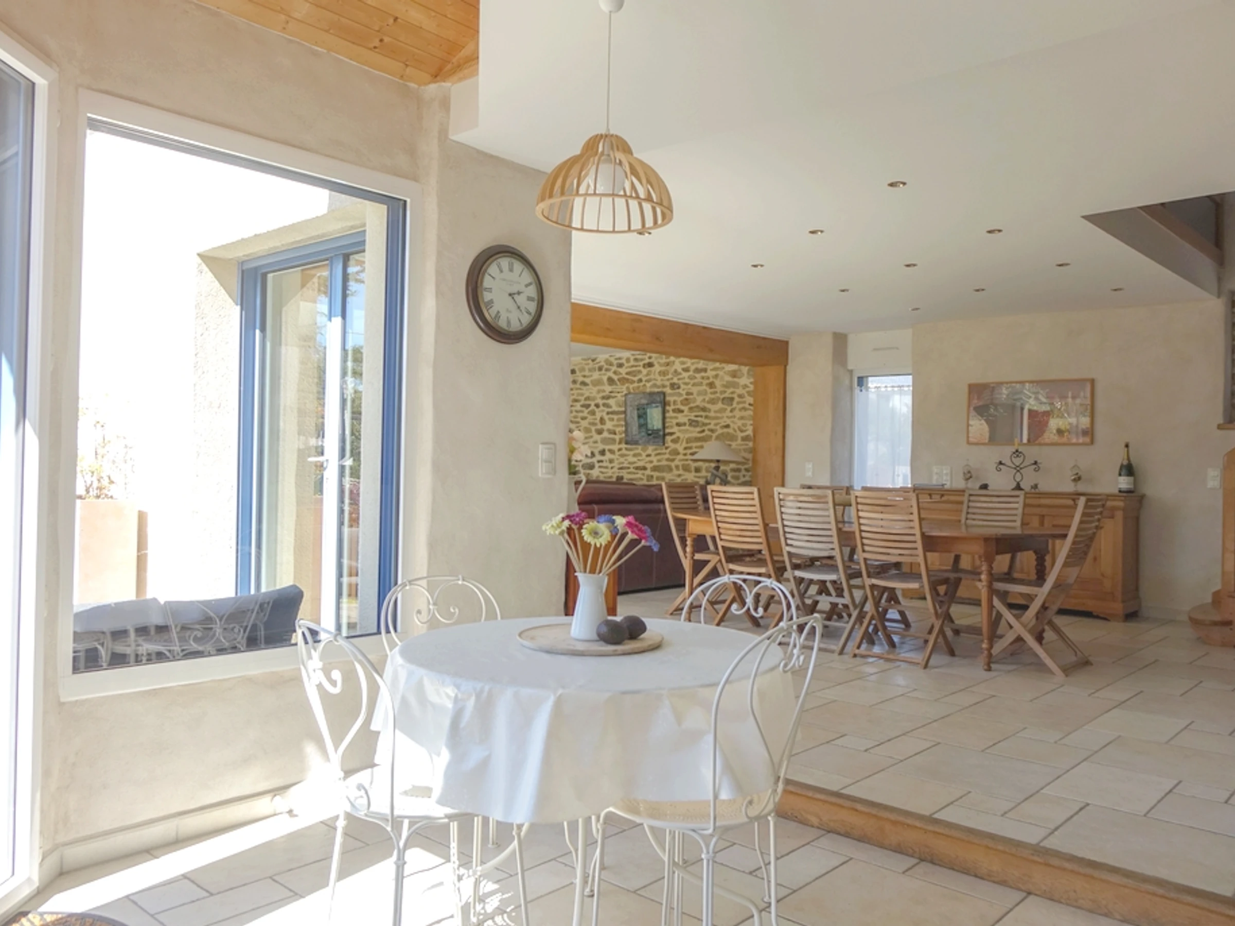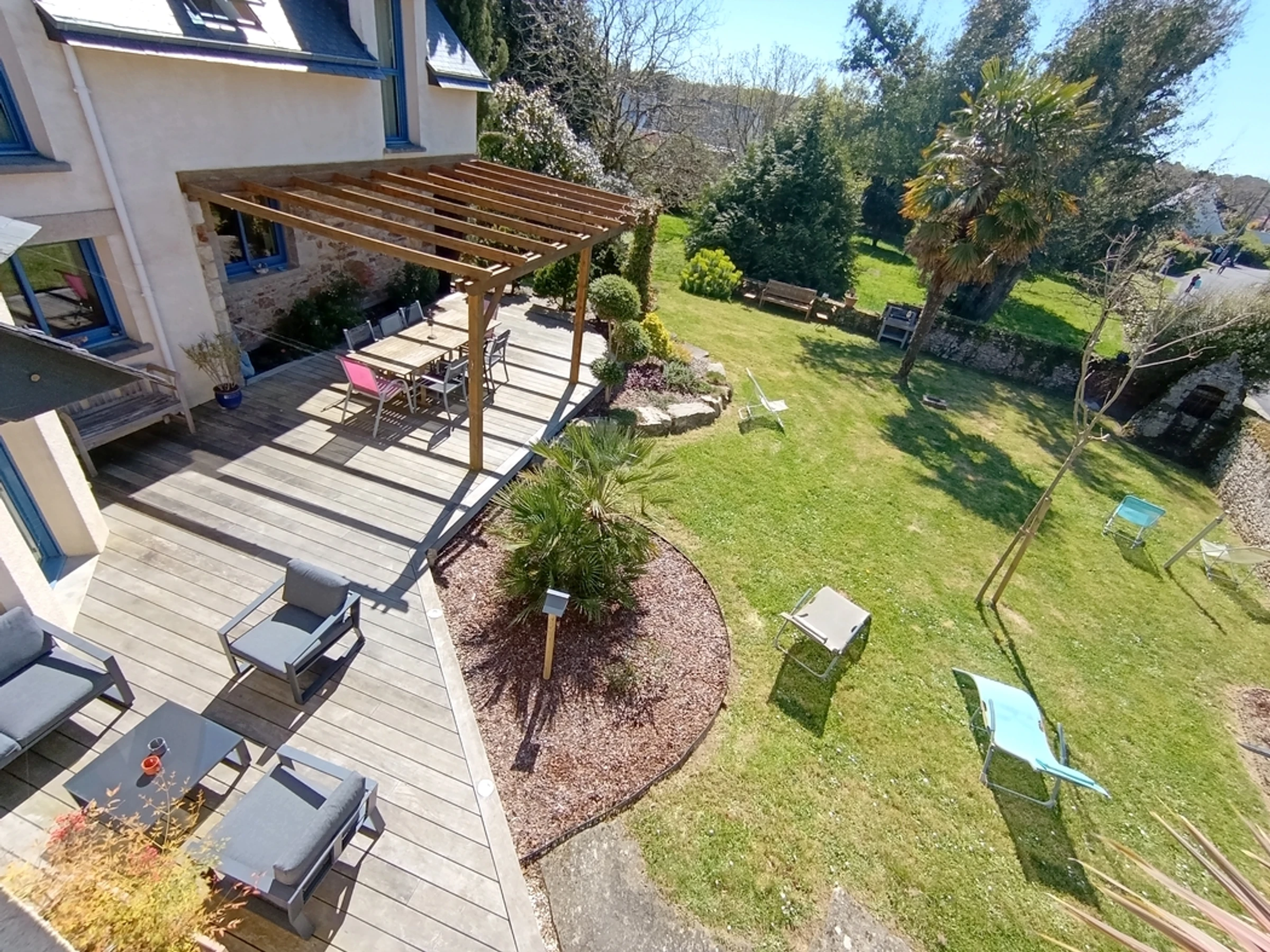 It comprises an entrance hall opening onto a large, bright living room with a fireplace, from which a French window provides direct access to the terrace and garden. The kitchen opens onto the dining area, and a master suite with a double bed and en-suite bathroom with a shower and bathtub, and a separate toilet complete the ground floor of this property. Upstairs, you will find a large mezzanine with a library and board games, three bedrooms with double beds and a shower room, and a shared bathroom. Outside: A large terrace and a wooden pergola, where you can relax in the shade, enhance the garden. Parking spaces are available at the edge of the house.