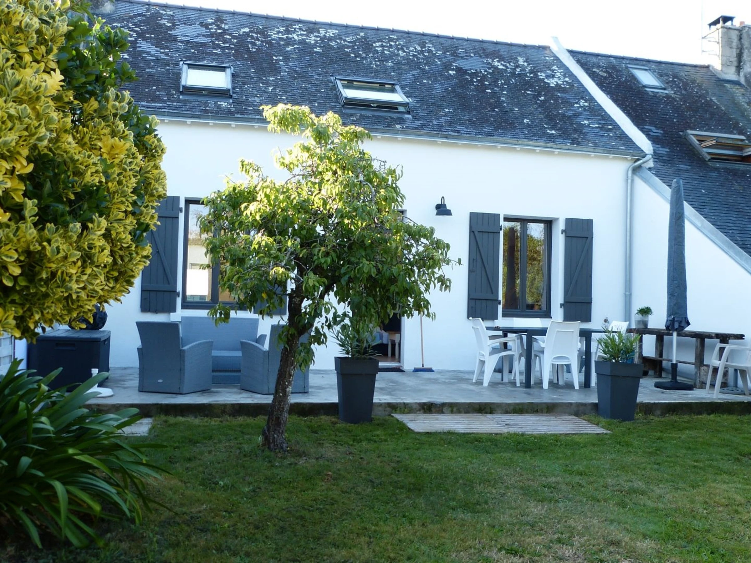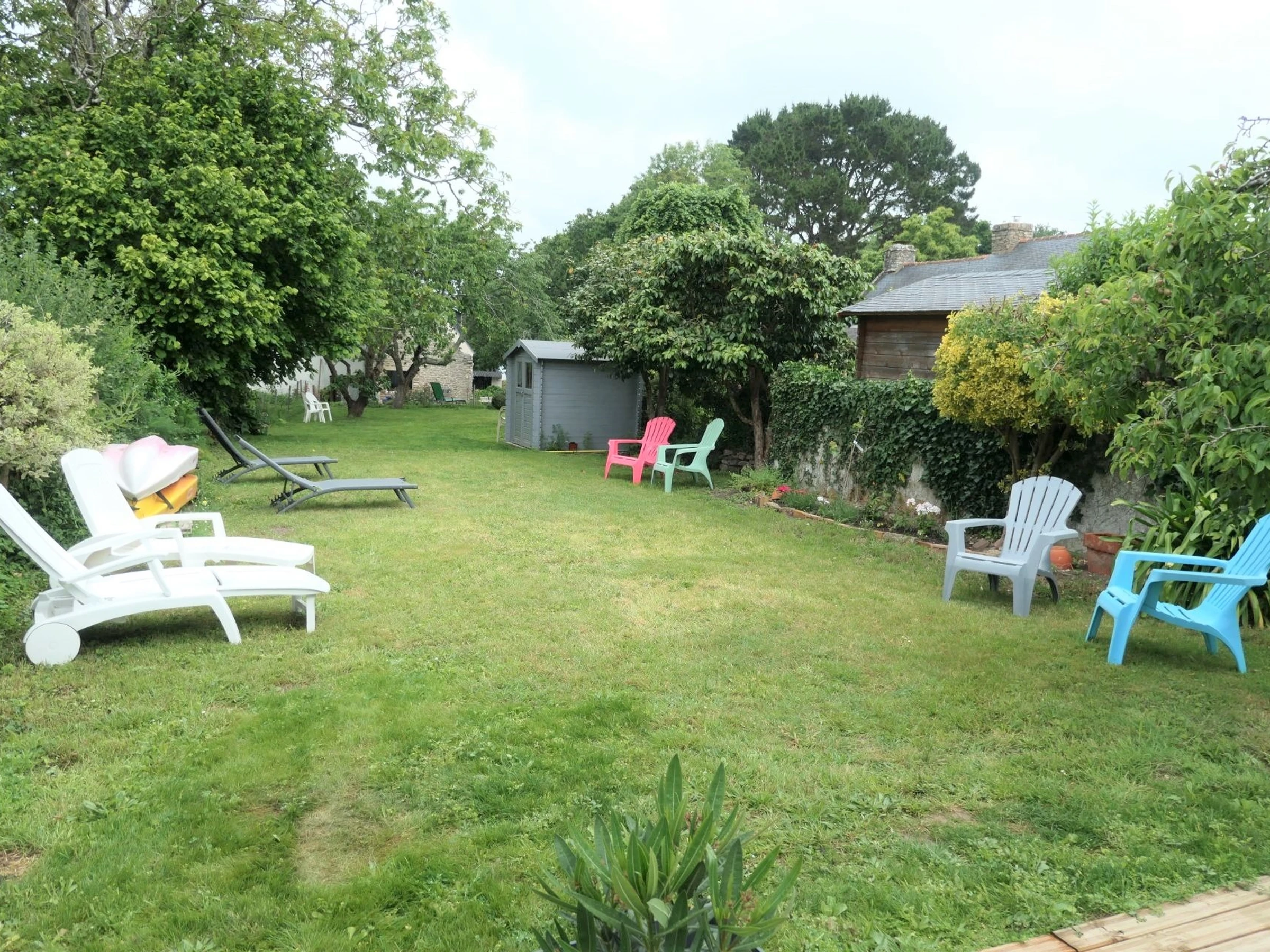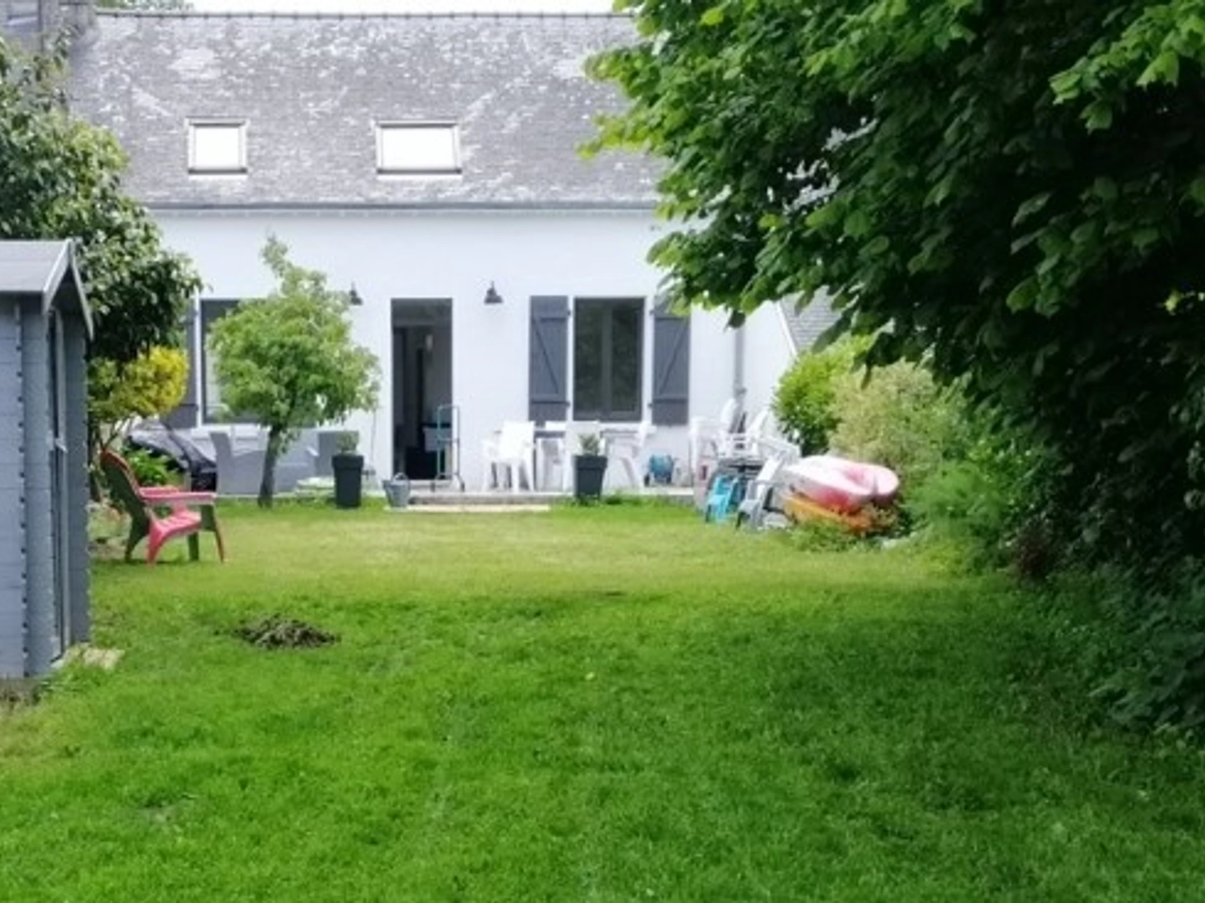 The enclosed garden, approximately 500m², is an invitation to relaxation and daydreaming. Stretching lengthwise, at the far end of the garden, a lovely view of the Gulf of Morbihan awaits, adding to the charm of the house. Garden furniture is provided.