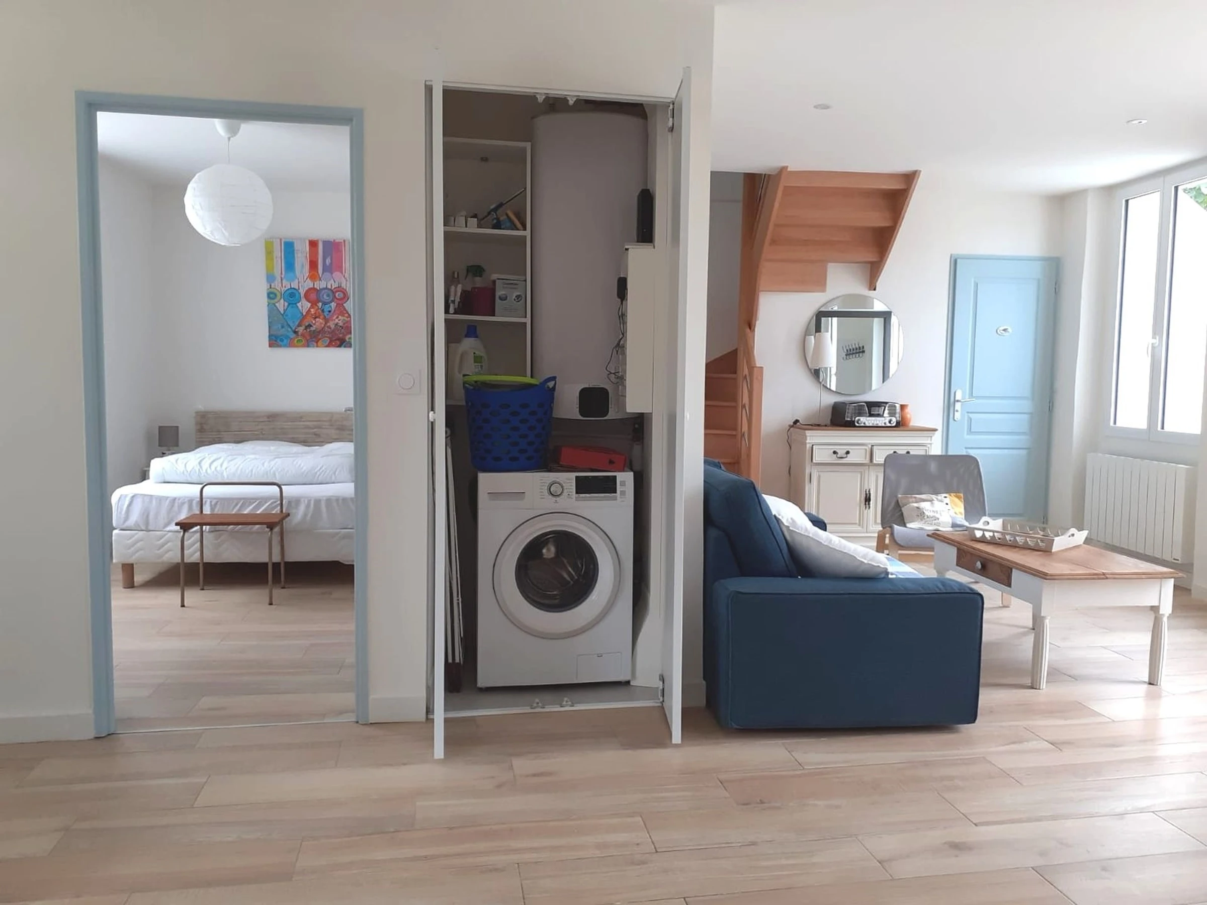 A separate toilet with washbasin. A small cupboard with washing machine and electric water heater. A first bedroom with a double bed (140 cm), chest of drawers, and en-suite shower room.