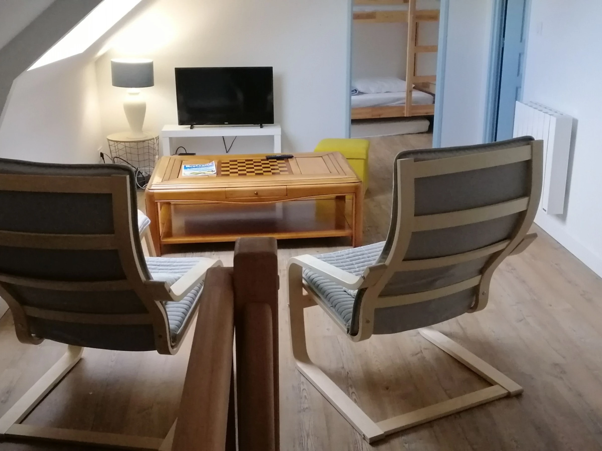 Upstairs: a bathroom with bathtub, shower, and toilet. Mezzanine with TV that can serve as a second living room. Second bedroom with two single beds (90cm) or one double bed (180cm), chest of drawers, and a swing set. Third bedroom with two bunk beds and one single bed (90cm), and a chest of drawers.