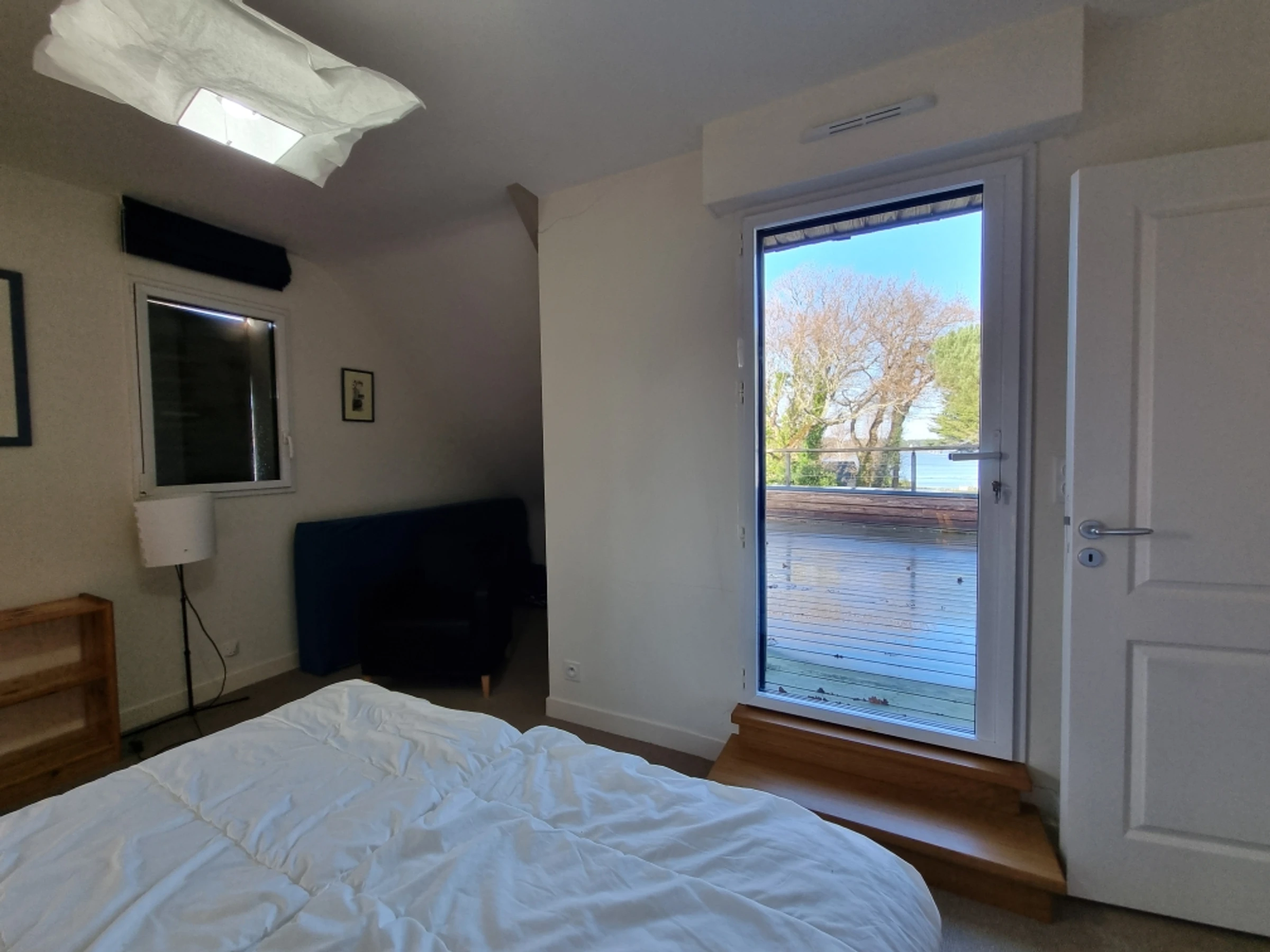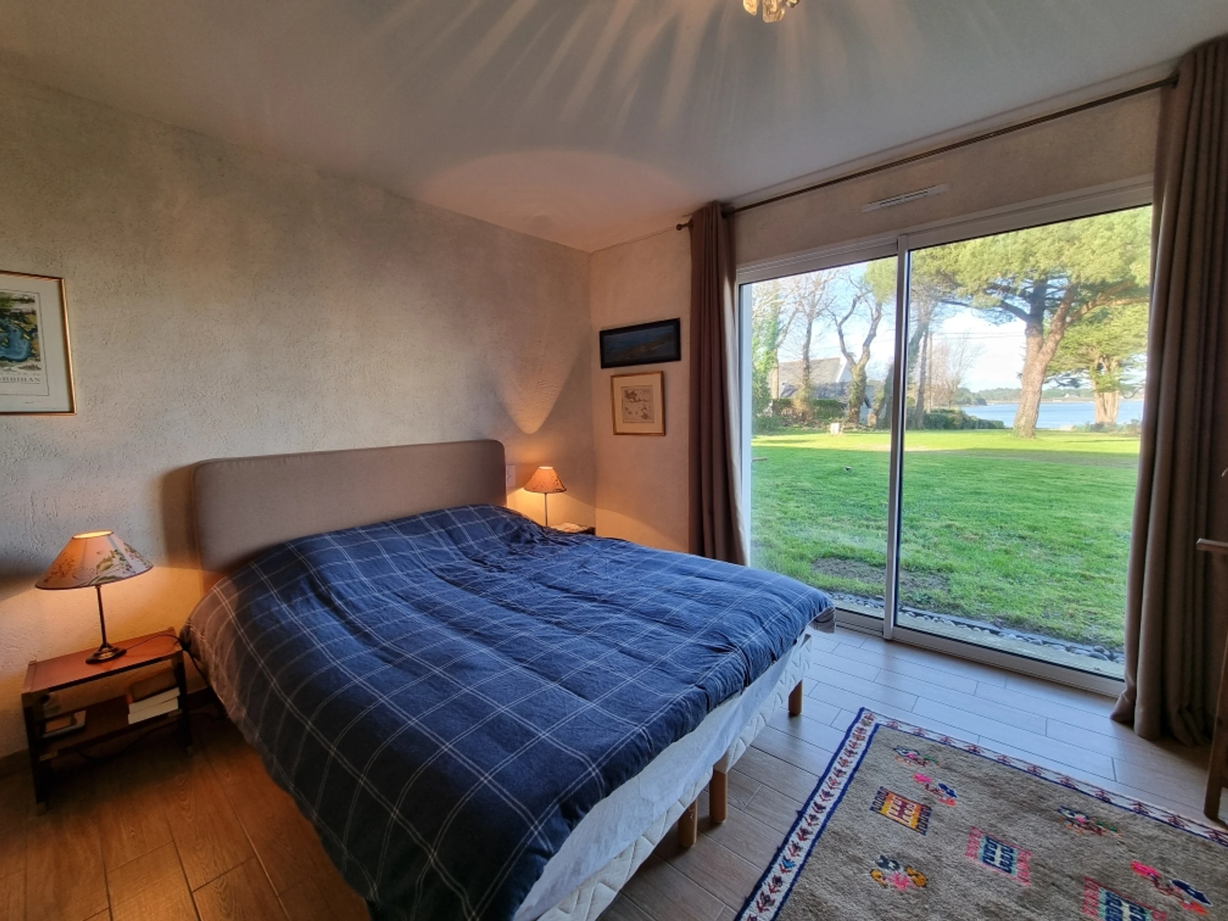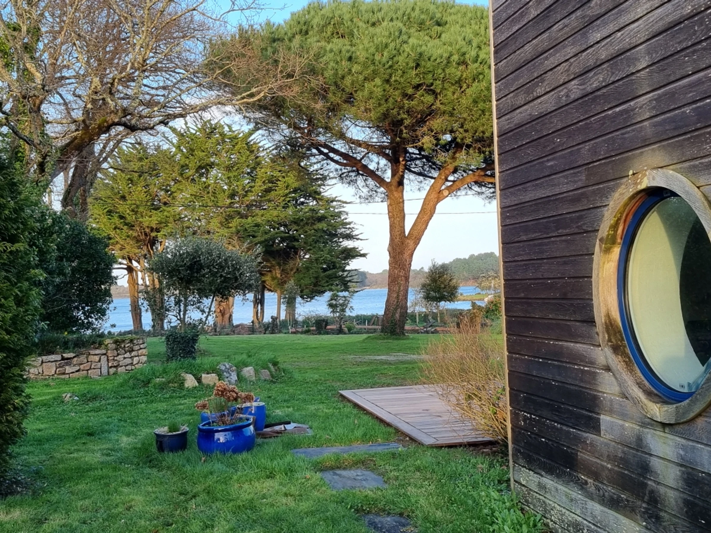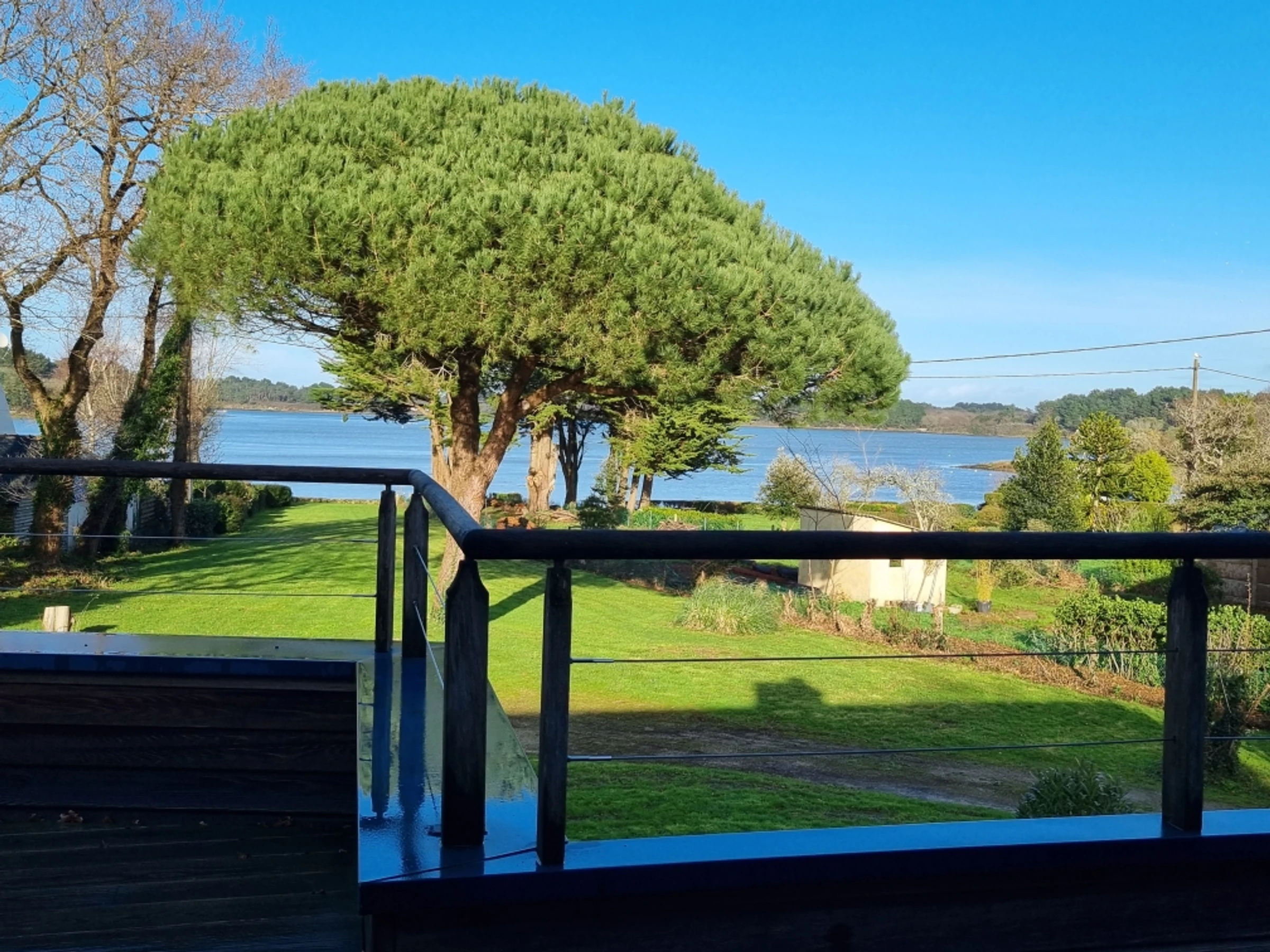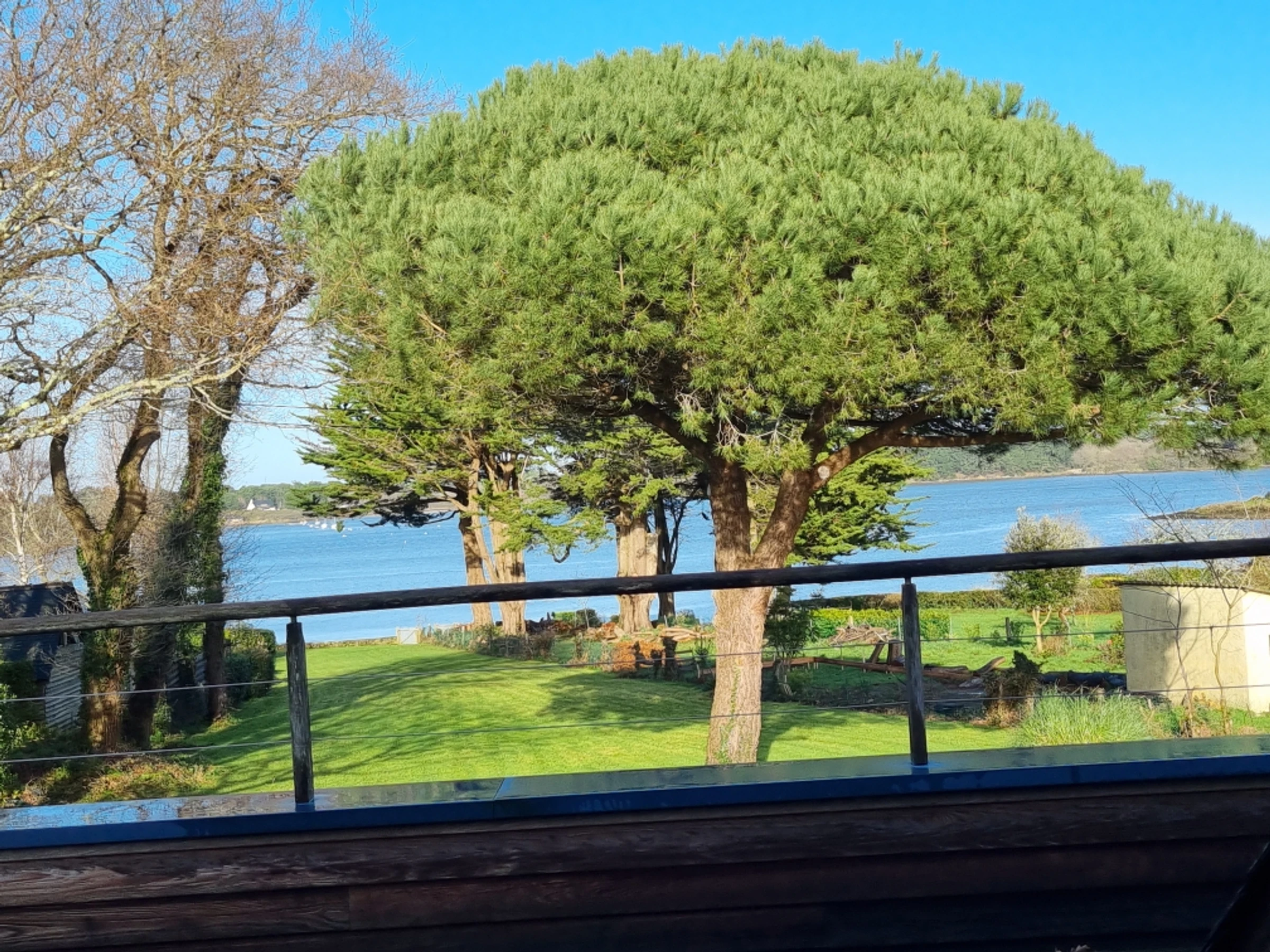 Upstairs, part of the mezzanine is used as a sleeping area, screened from view by a screen, offering additional sleeping space for two people with its two 80 cm beds, and another section furnished as a desk. The mezzanine and the two upstairs bedrooms both benefit from a beautiful wooden terrace overlooking the garden, offering a unique view of the Gulf of Morbihan. Its tides and ever-changing colors provide a captivating spectacle of the surrounding wildlife, where numerous bird species find refuge. Time seems to stand still.