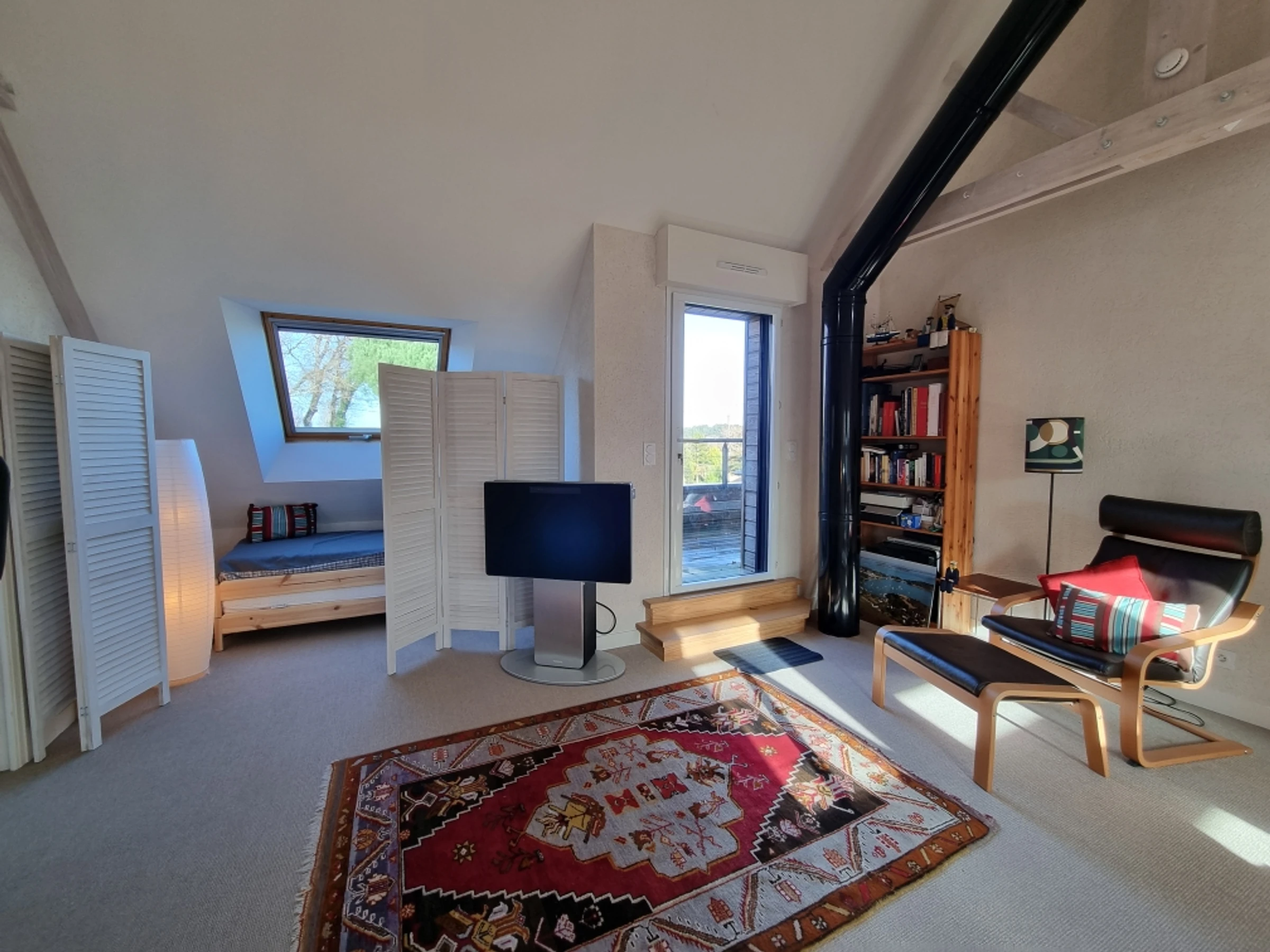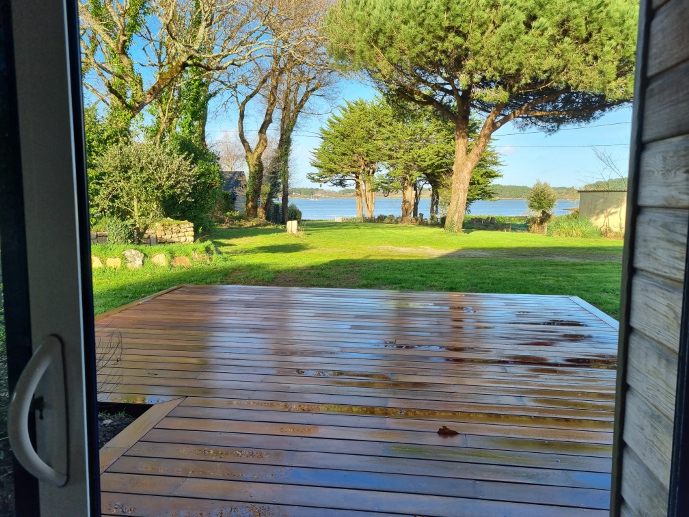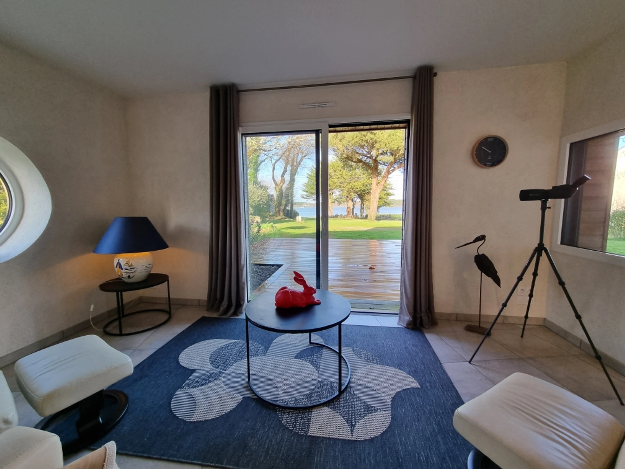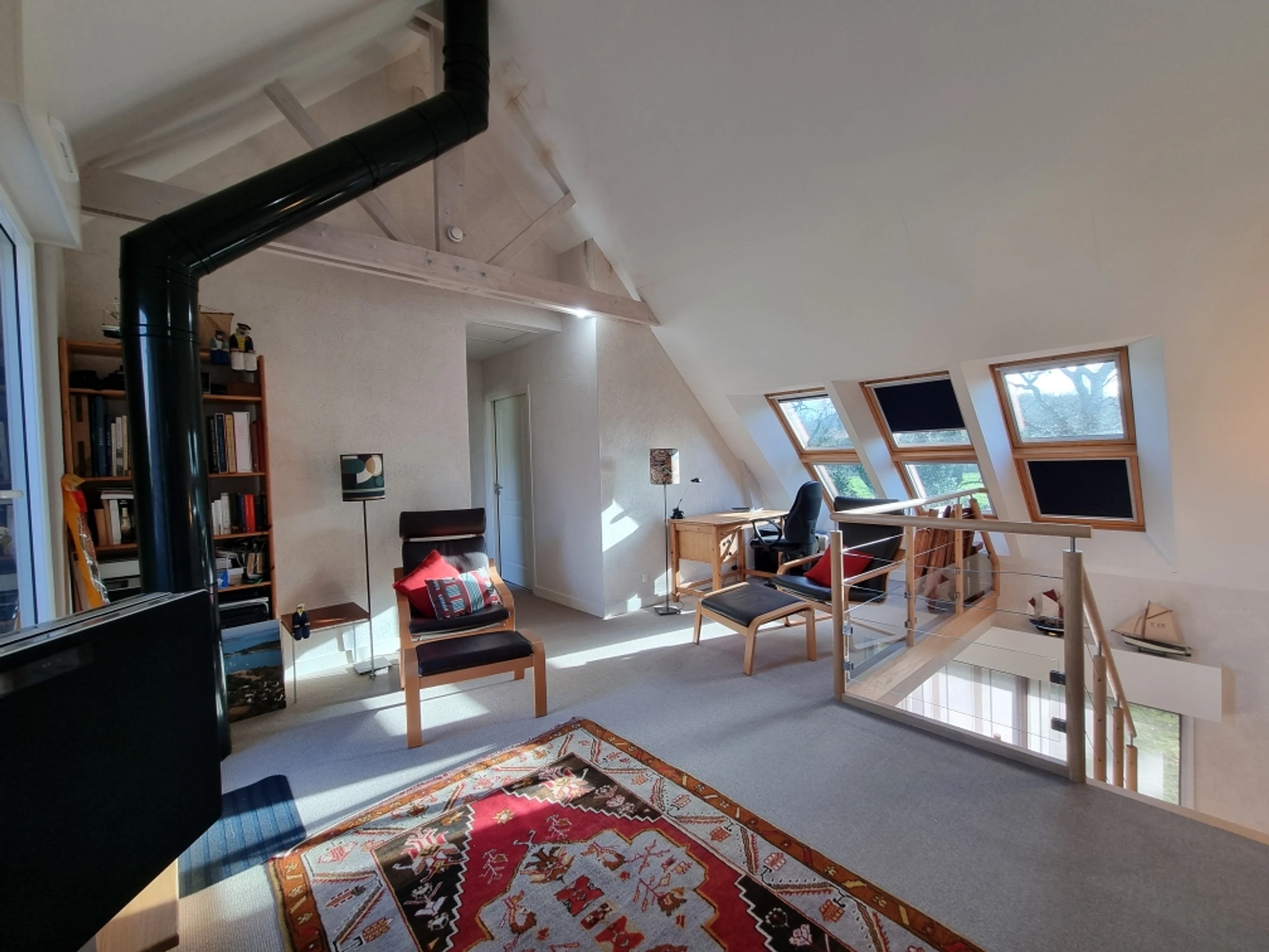 Upstairs, part of the mezzanine is used as a sleeping area, screened from view by a screen, offering additional sleeping space for two people with its two 80 cm beds, and another section furnished as a desk. The mezzanine and the two upstairs bedrooms both benefit from a beautiful wooden terrace overlooking the garden, offering a unique view of the Gulf of Morbihan. Its tides and ever-changing colors provide a captivating spectacle of the surrounding wildlife, where numerous bird species find refuge. Time seems to stand still.