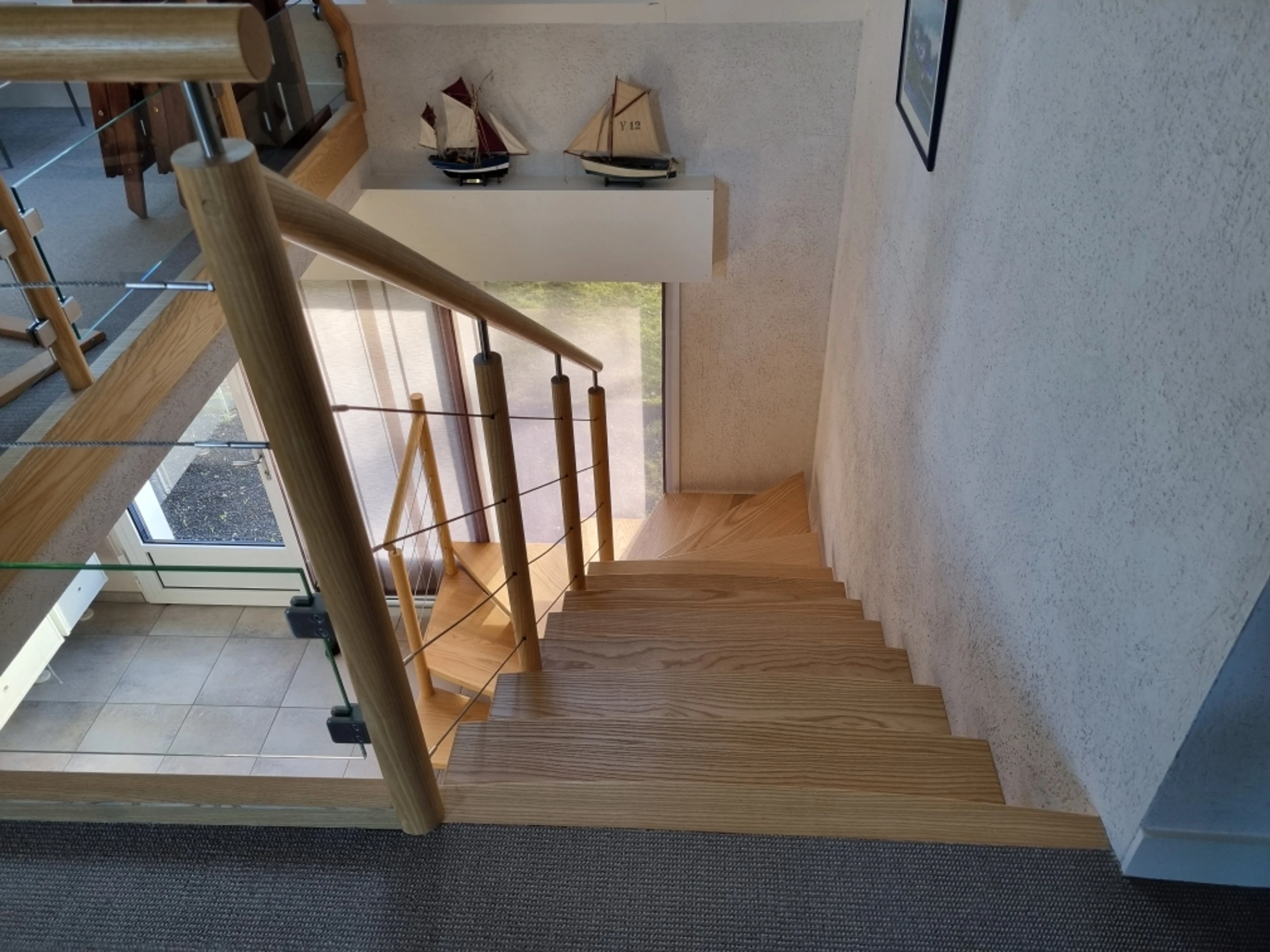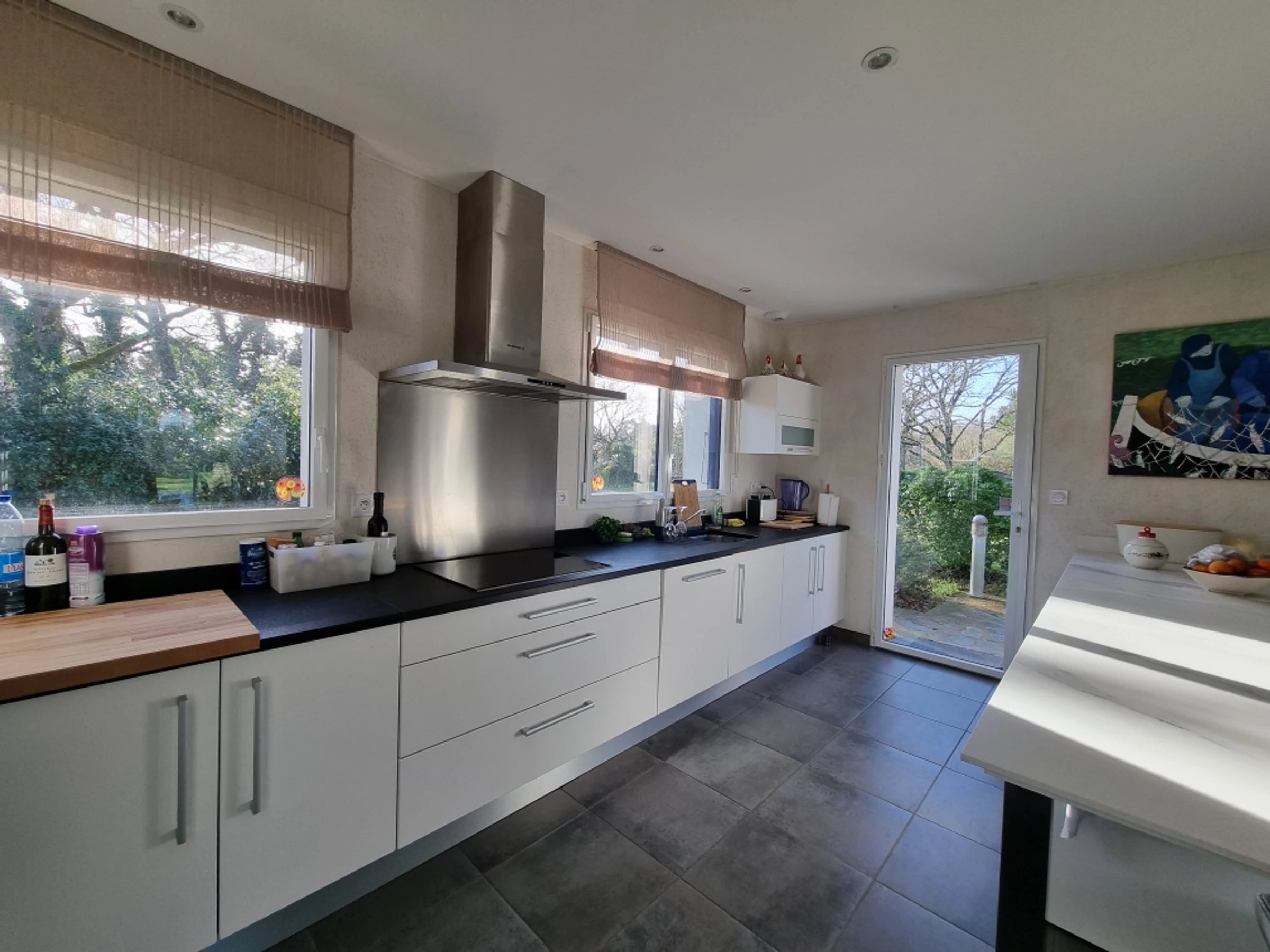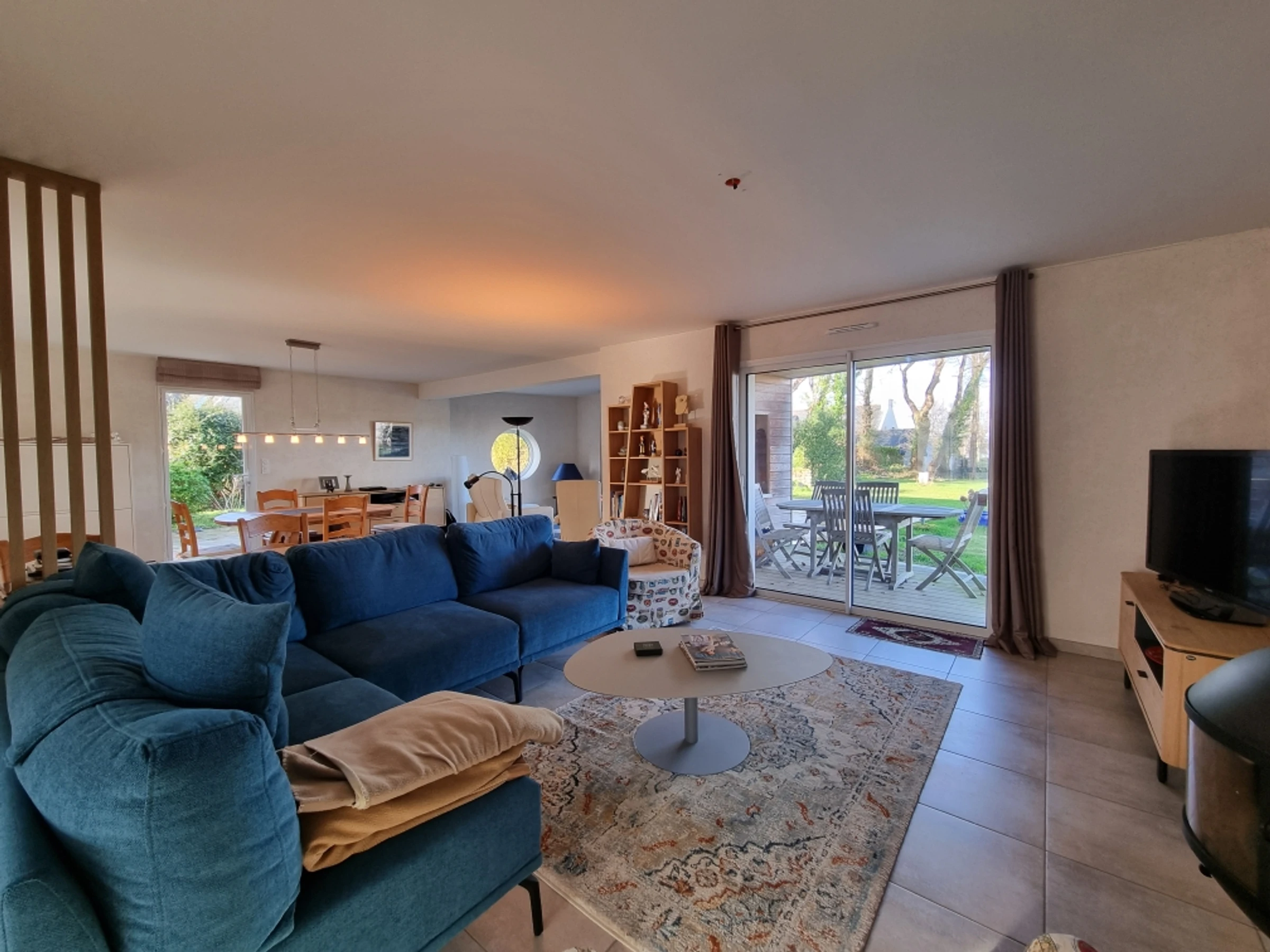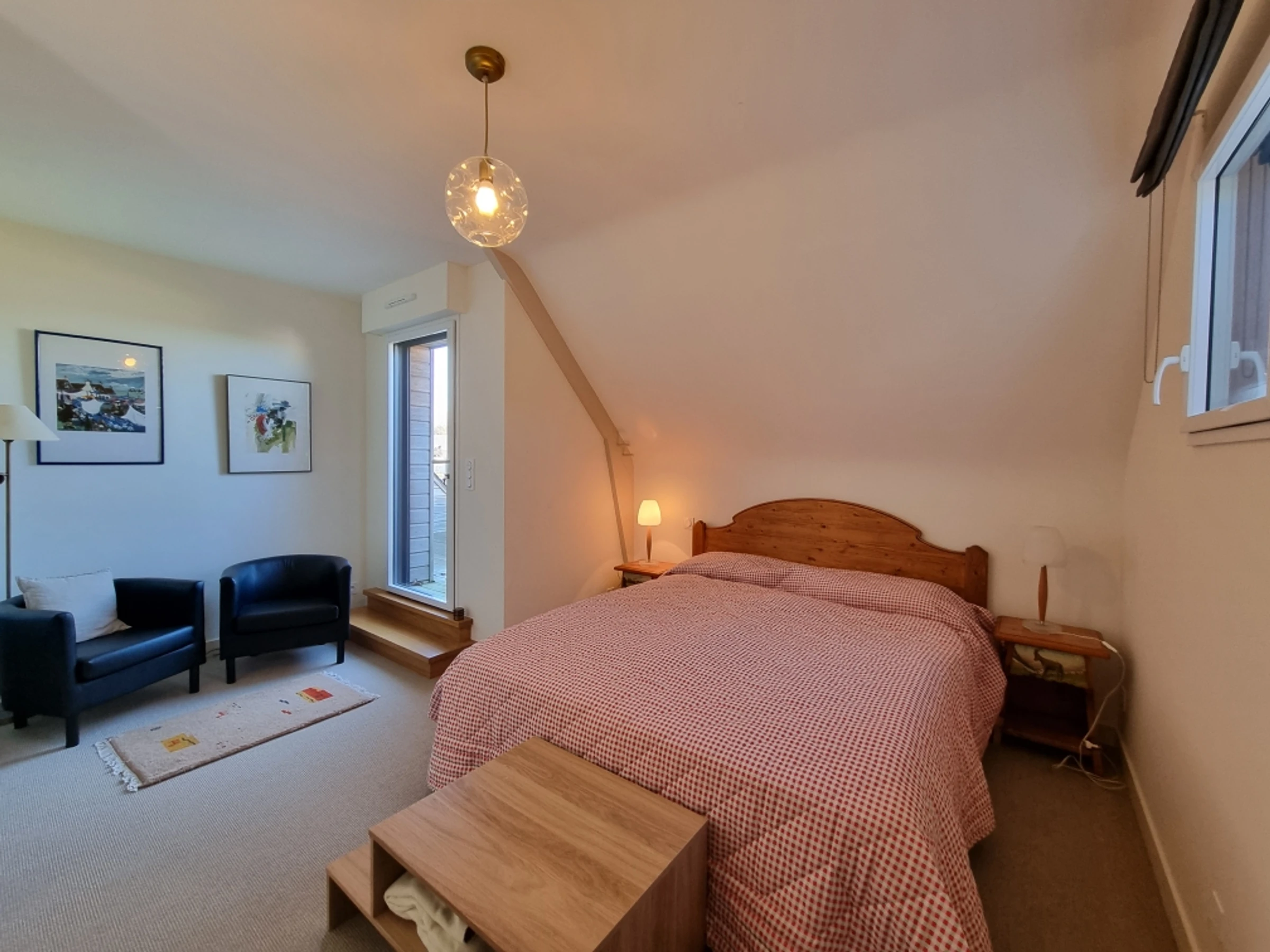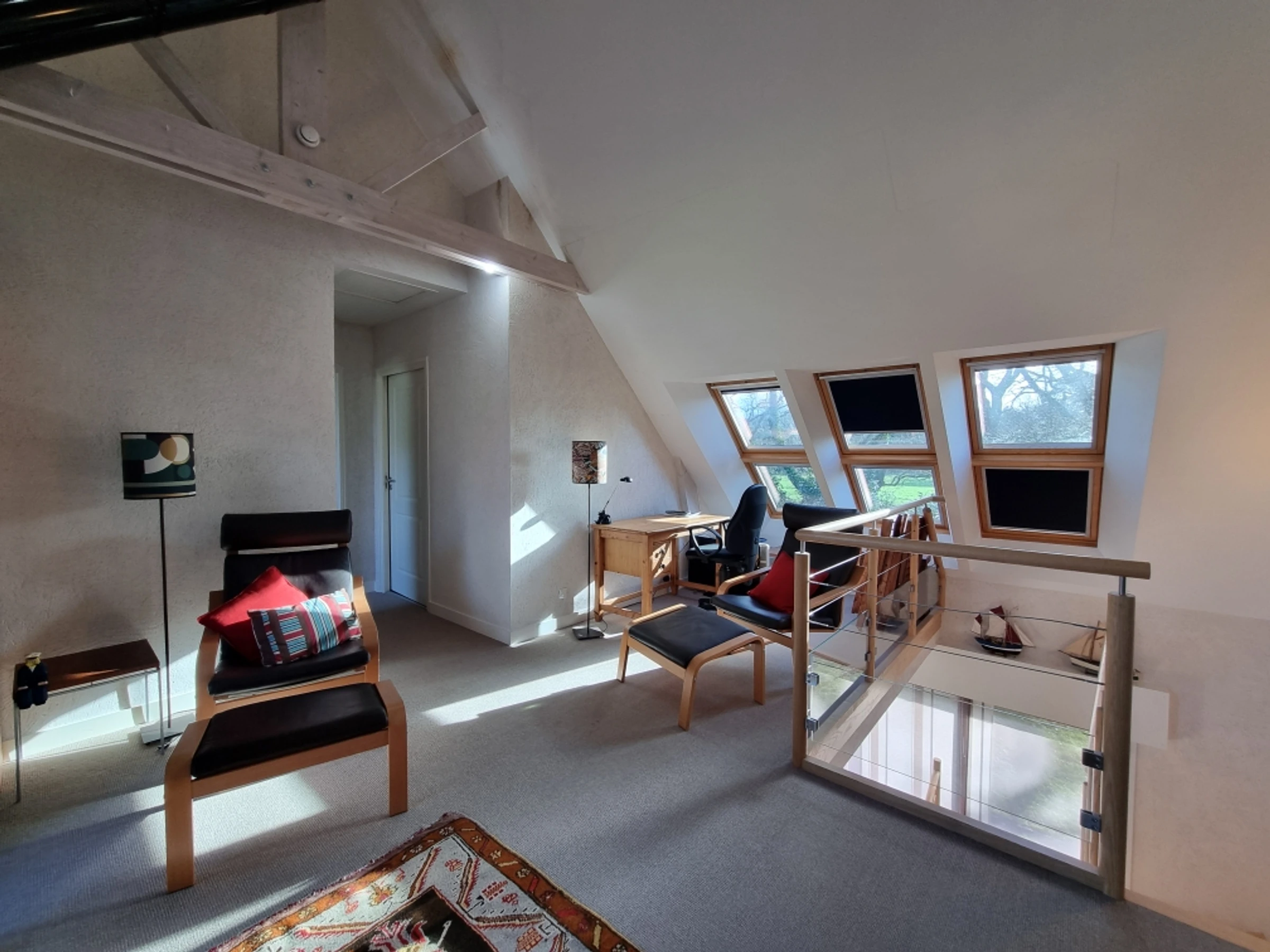 Upstairs, part of the mezzanine is used as a sleeping area, screened from view by a screen, offering additional sleeping space for two people with its two 80 cm beds, and another section furnished as a desk. The mezzanine and the two upstairs bedrooms both benefit from a beautiful wooden terrace overlooking the garden, offering a unique view of the Gulf of Morbihan. Its tides and ever-changing colors provide a captivating spectacle of the surrounding wildlife, where numerous bird species find refuge. Time seems to stand still.