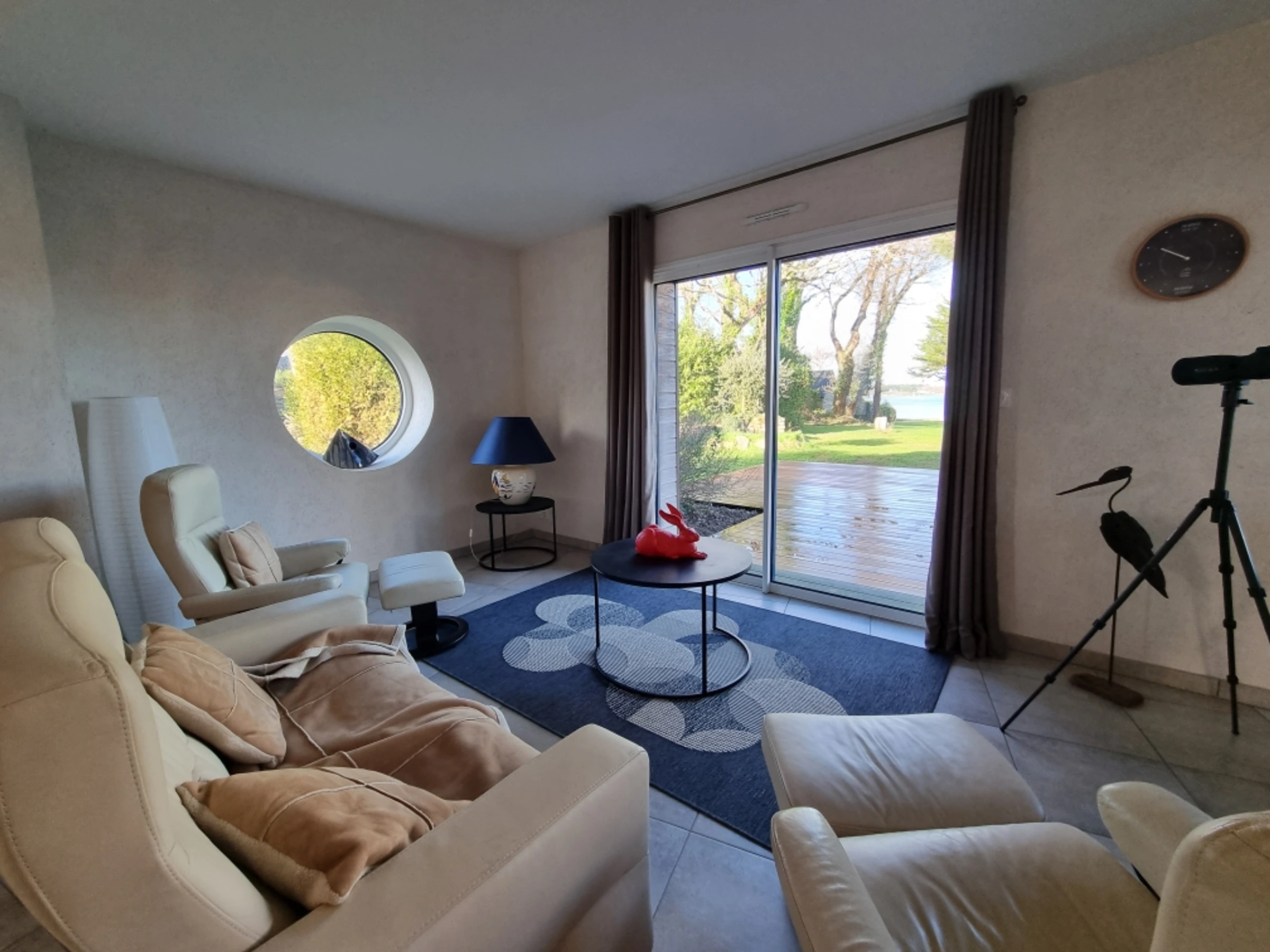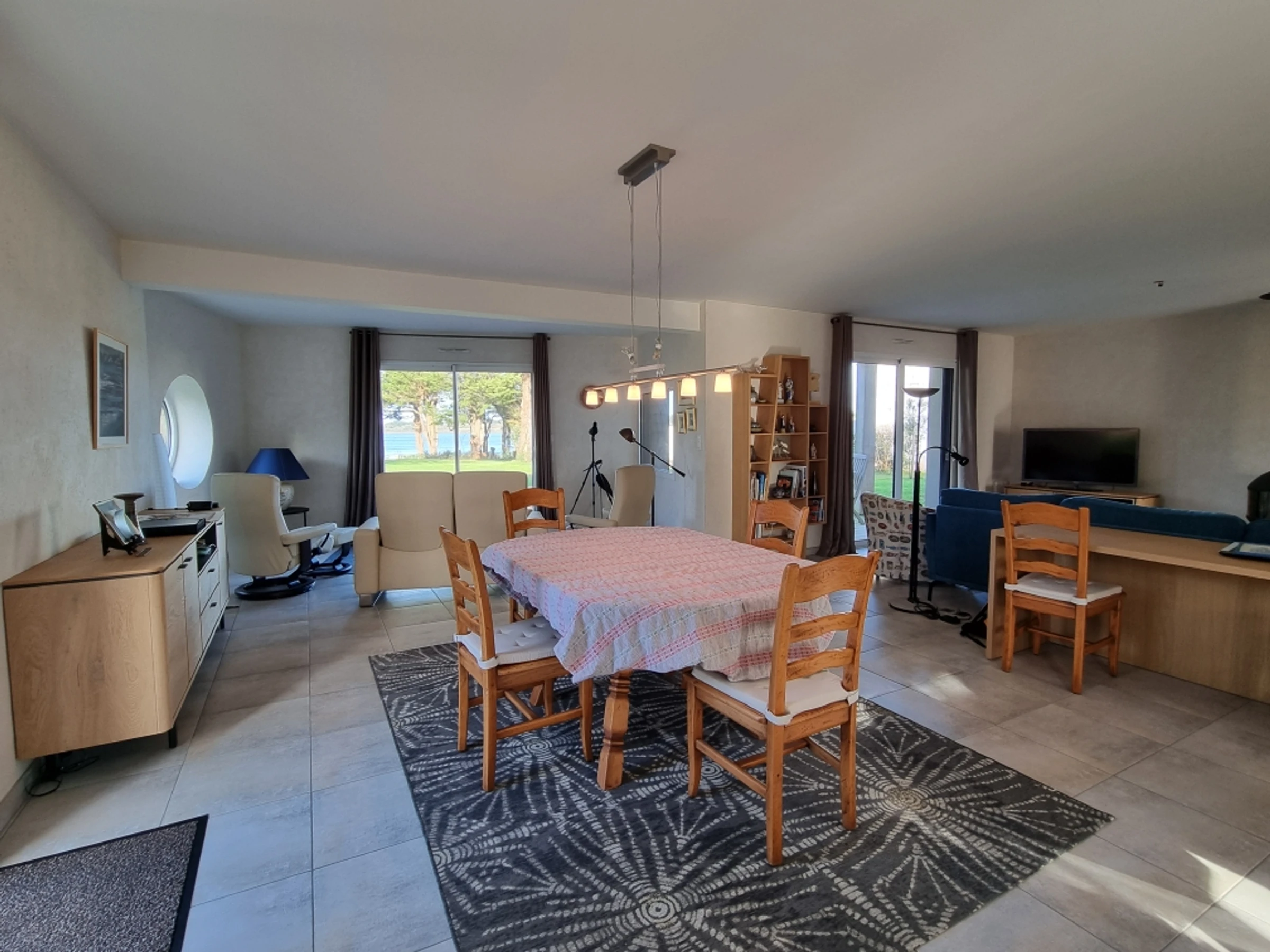 With the Gulf of Morbihan as a backdrop and direct access to the coastal path, just 750m from the beach (gulf side) and 4km from a golf course and the ocean beach, this detached architect-designed house of 170m² features a beautiful, spacious entrance hall with cloakroom and storage. There is a separate toilet with a washbasin. The generous, light-filled 70m² living room is the heart of the house, with a TV and wood-burning stove, and an open-plan kitchen with a large central island (4-burner induction hob, refrigerator with freezer compartment, dishwasher, steam oven, microwave, electric oven, Jura bean-to-cup coffee machine, Krups capsule coffee machine, kettle, and toaster). The living area boasts a beautiful north-facing wooden terrace overlooking the sea, and a second terrace off the kitchen, facing west, allows you to enjoy the afternoon and sunset sun. The master suite features a 160x200 cm bed (or two 80 cm beds), a wardrobe (shelves/hanging space/drawers), an en-suite bathroom with a bathtub and shower, and a separate toilet. This sleeping area enjoys views of the Gulf.