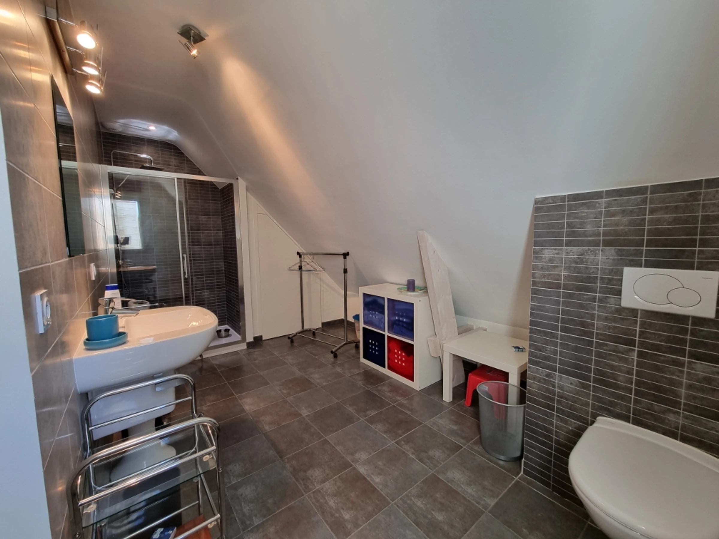 The left wing offers a second bedroom with a 160x200 cm bed or two 80 cm beds, a wardrobe (shelves/hanging space), and small storage, as well as an adjoining shower room with toilet. The right wing offers a third bedroom with a 160 cm bed (made up of two mattresses), a wardrobe, and a chest of drawers. There is also a shower room with toilet.