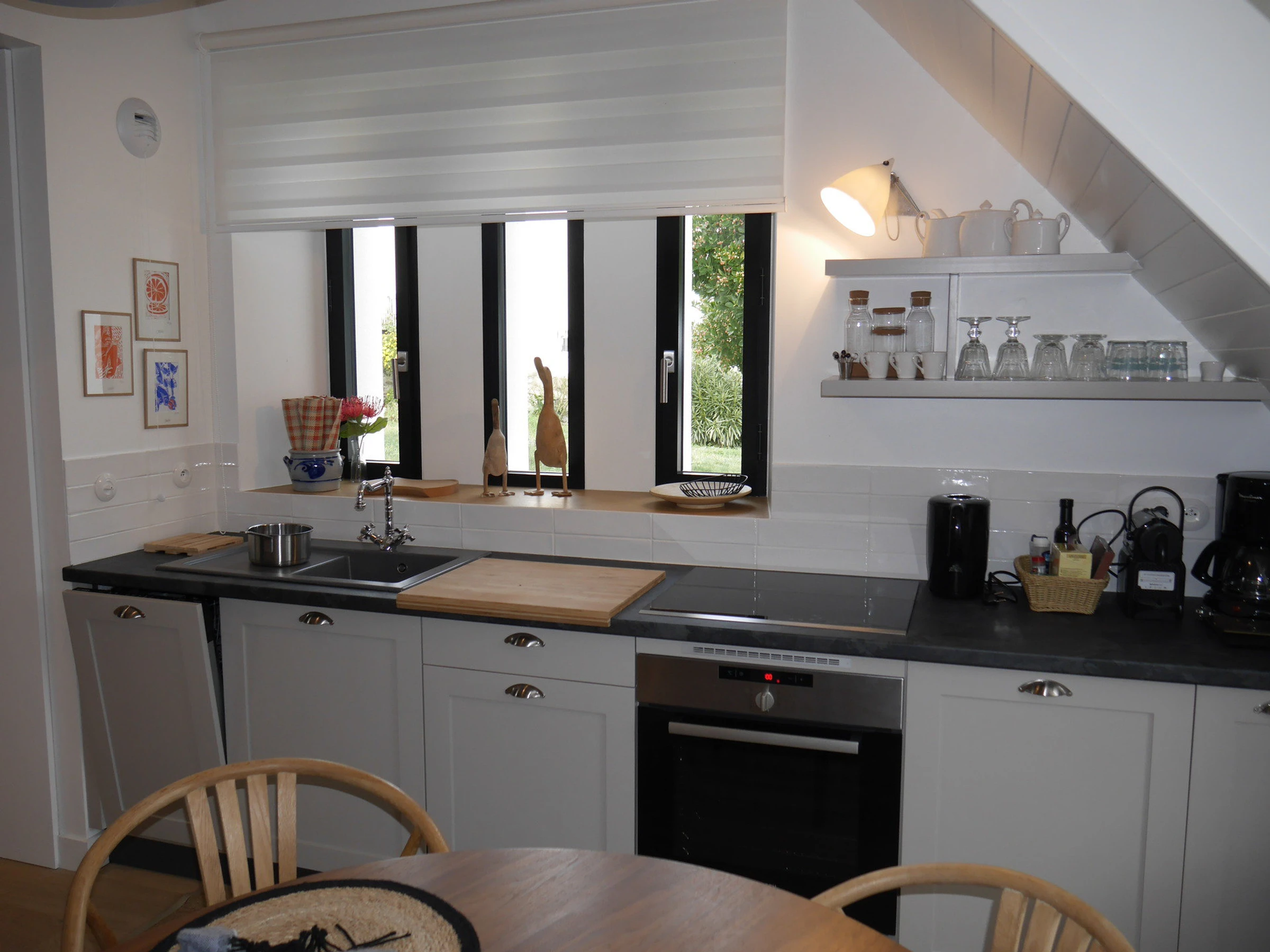 - une cuisine ouverte moderne et entièrement équipée avec plaques induction, four, lave-vaisselle, réfrigérateur , bouilloire, cafetière électrique et Nespresso.
