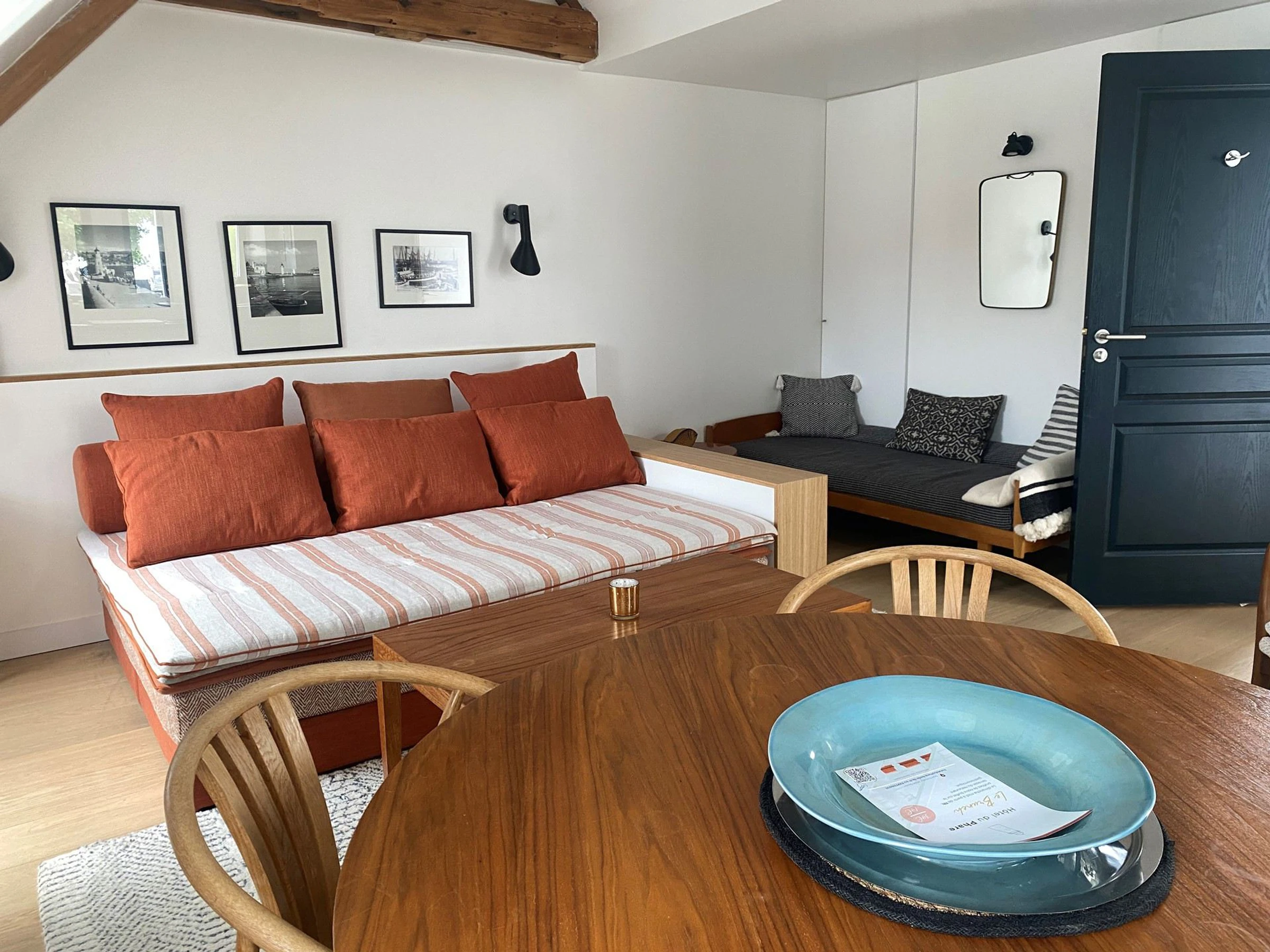 - un séjour/salon (28m²) avec une banquette-lit (160 X 200 cm), une télévision, wifi, une table et des chaises de salle à manger.